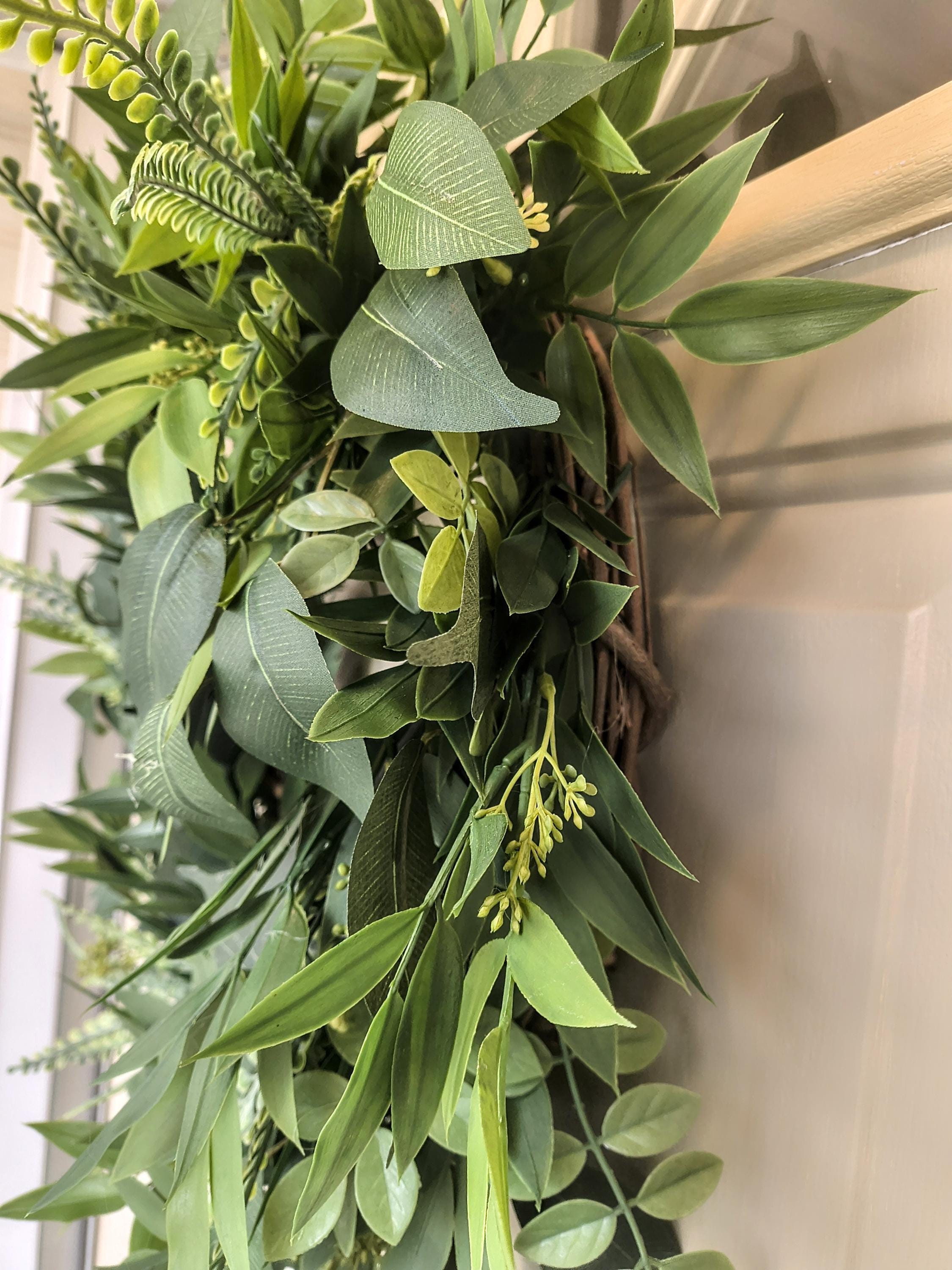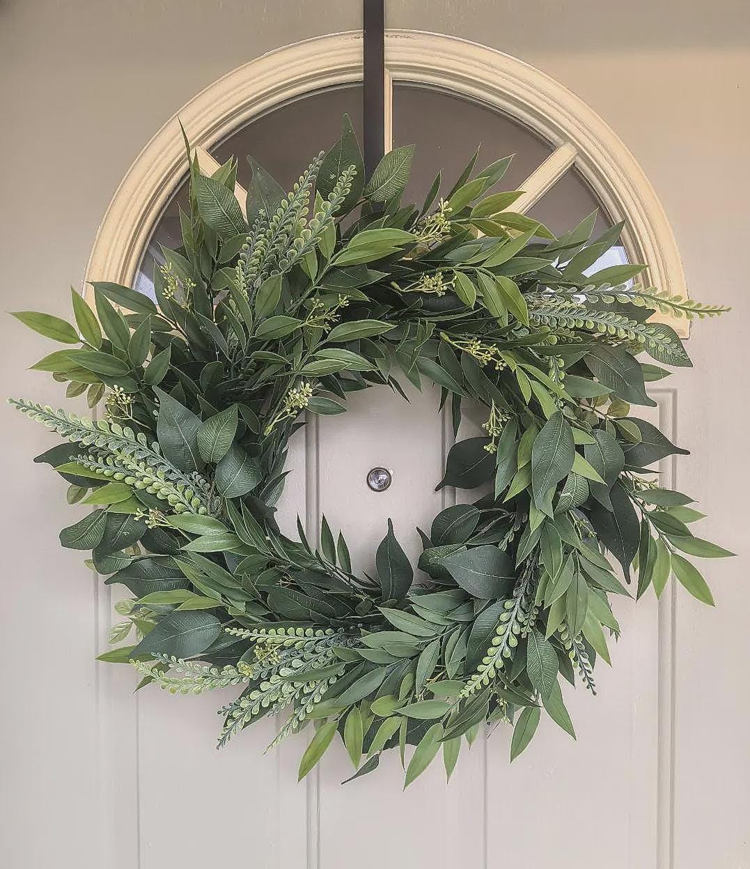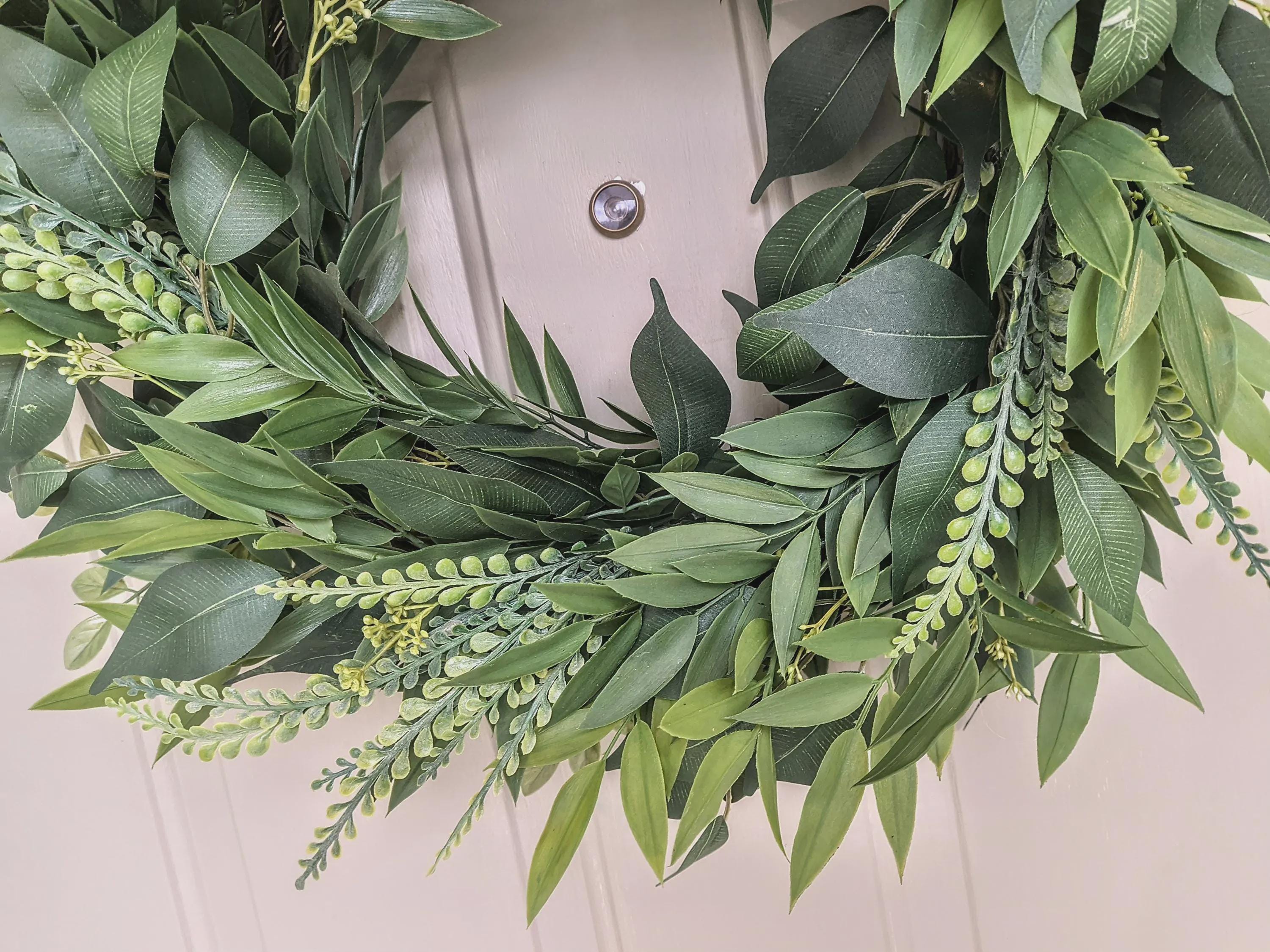 This minimalist wreath features a full, lush mix of artificial greenery in a soft asymmetrical pattern for a modern, organic look. A perfect touch for spring, summer, and everyday home décor — from farmhouse to boho to contemporary styles.