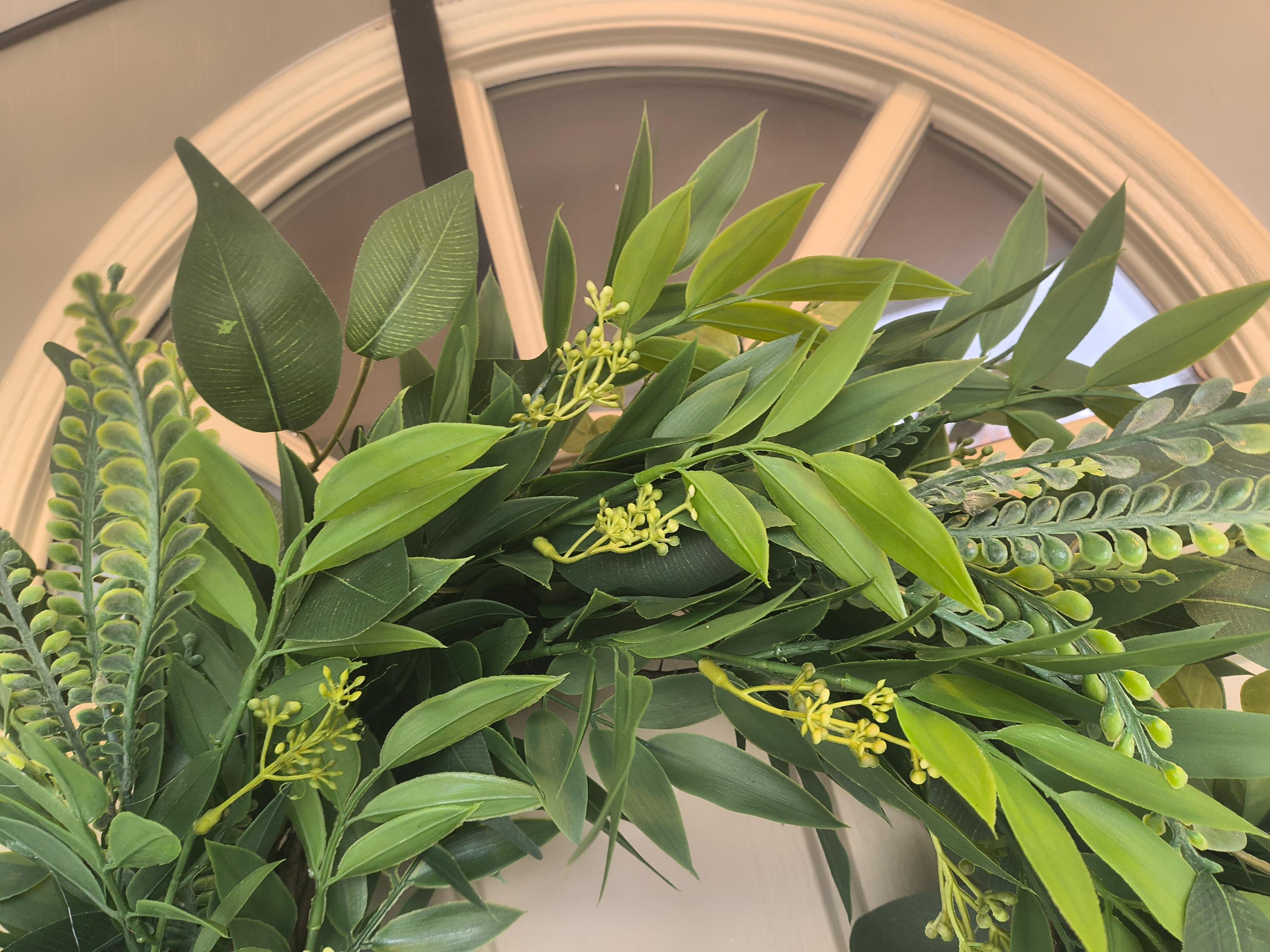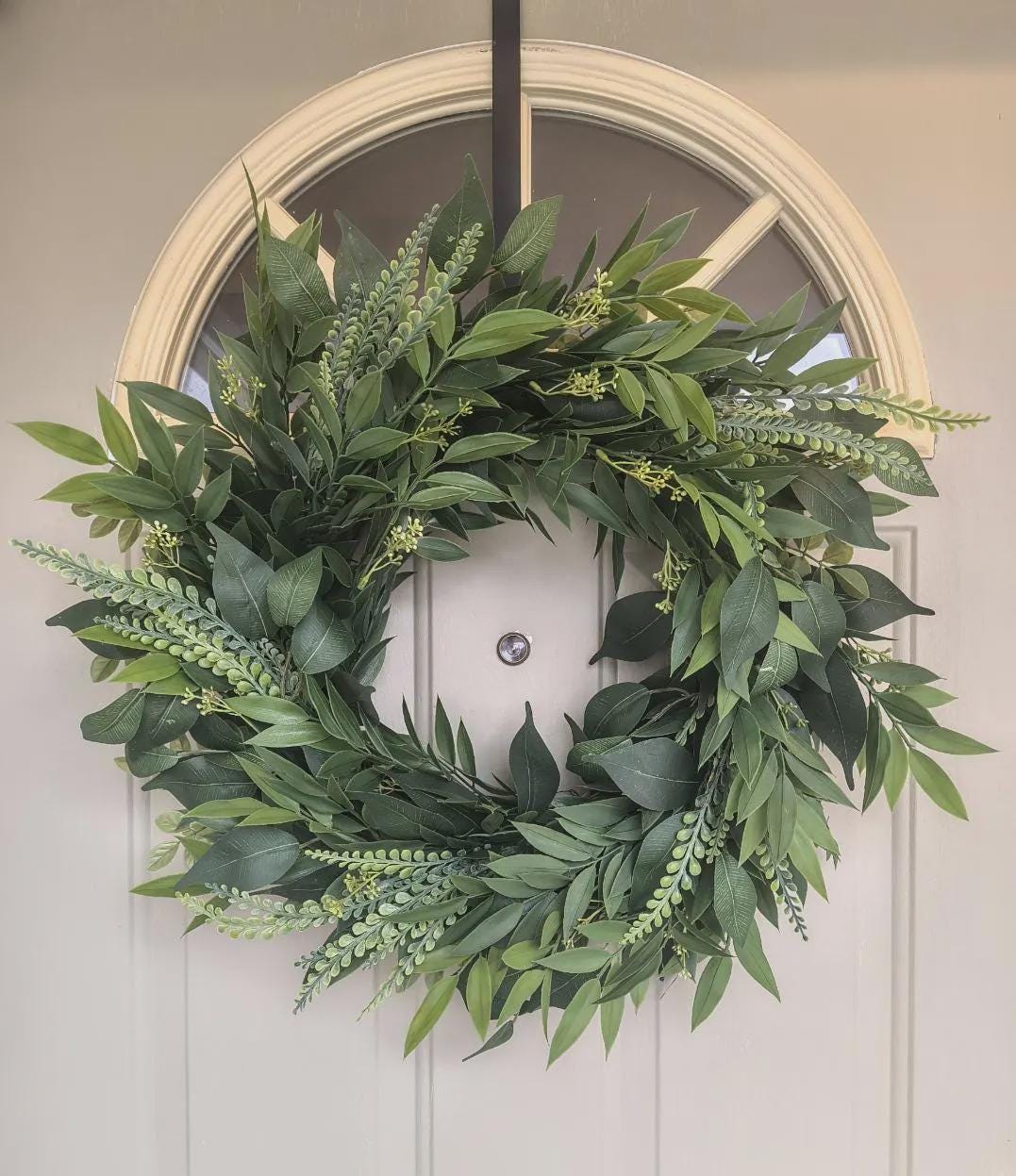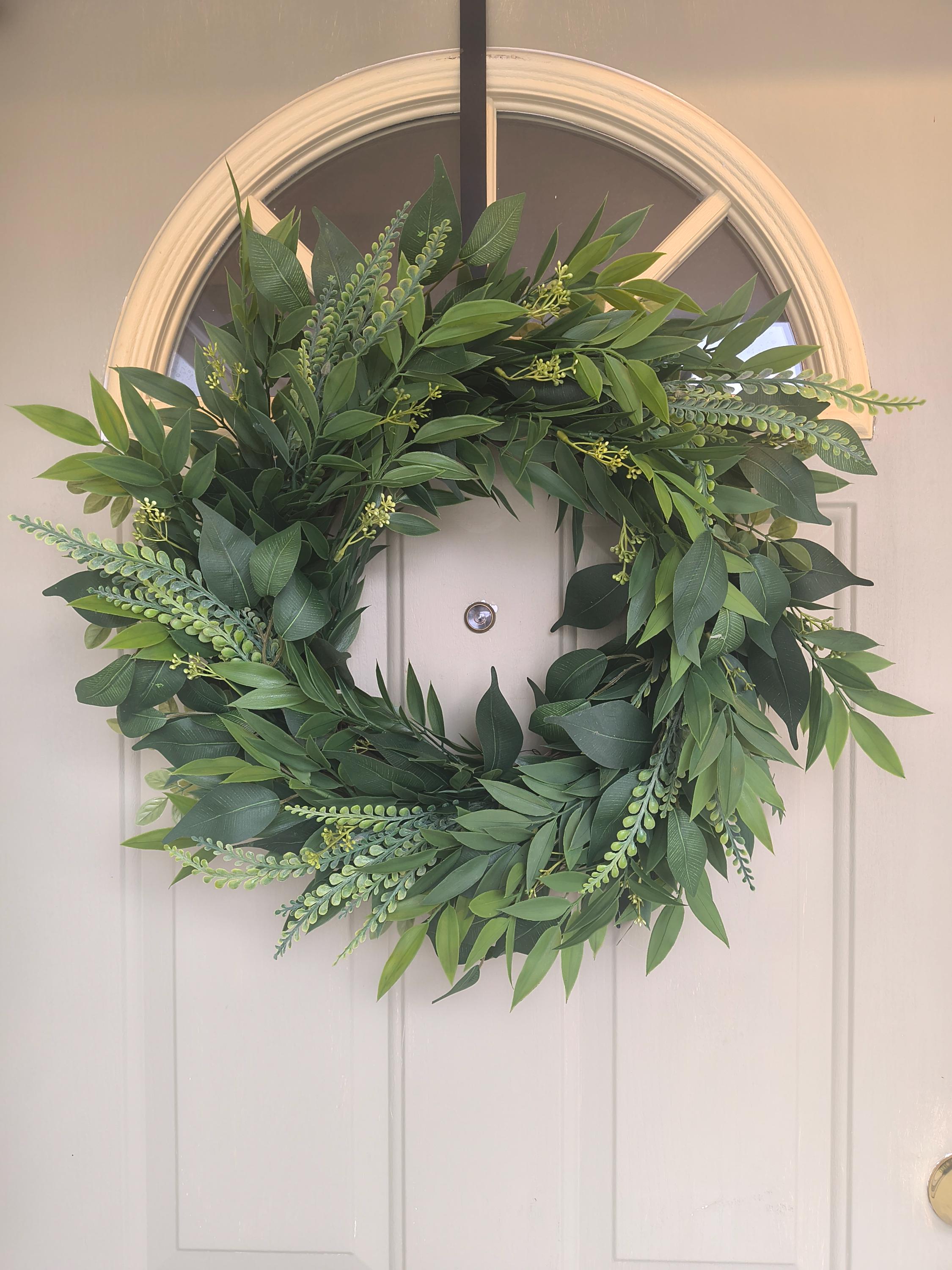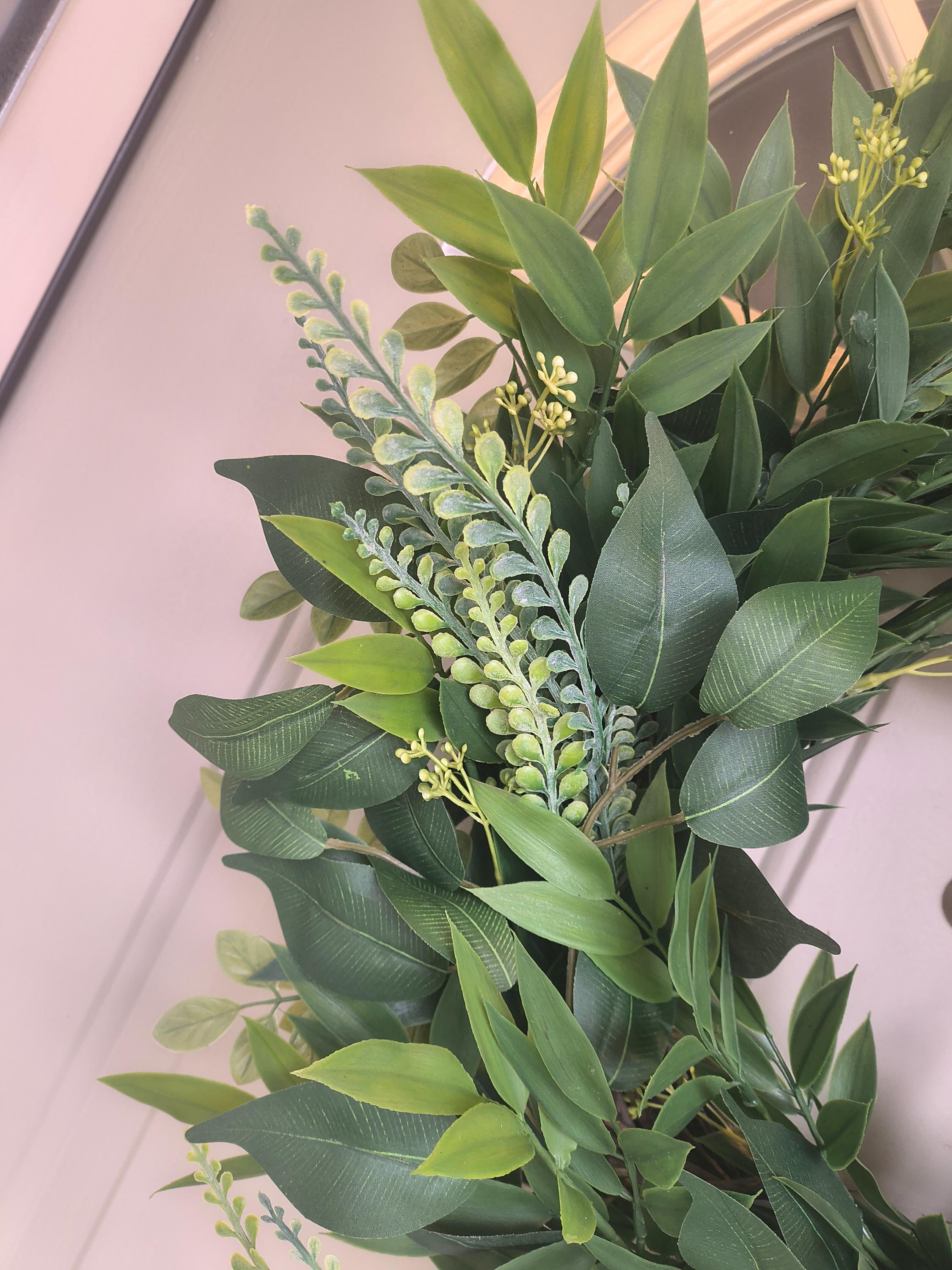 This minimalist wreath features a full, lush mix of artificial greenery in a soft asymmetrical pattern for a modern, organic look. A perfect touch for spring, summer, and everyday home décor — from farmhouse to boho to contemporary styles.