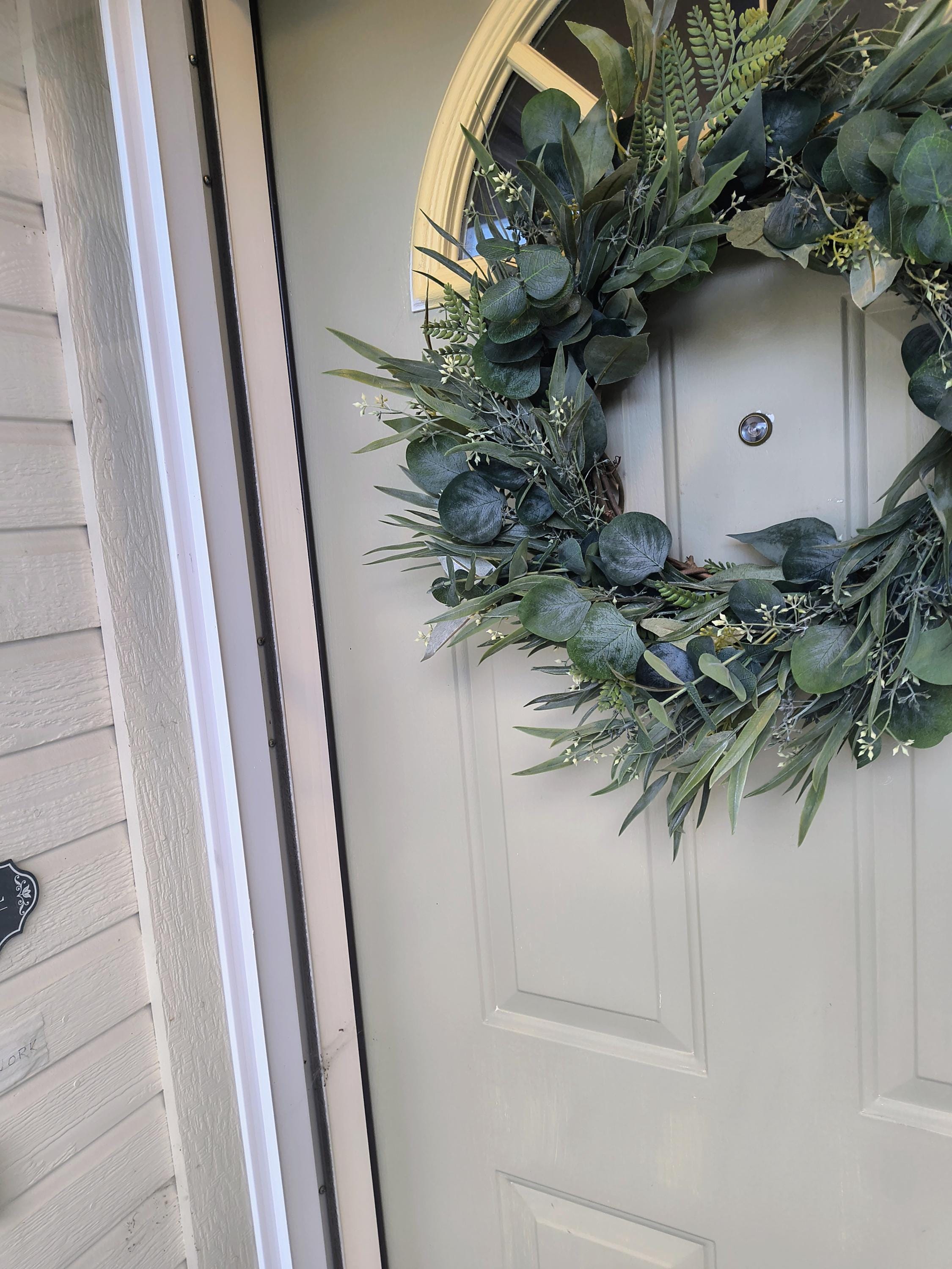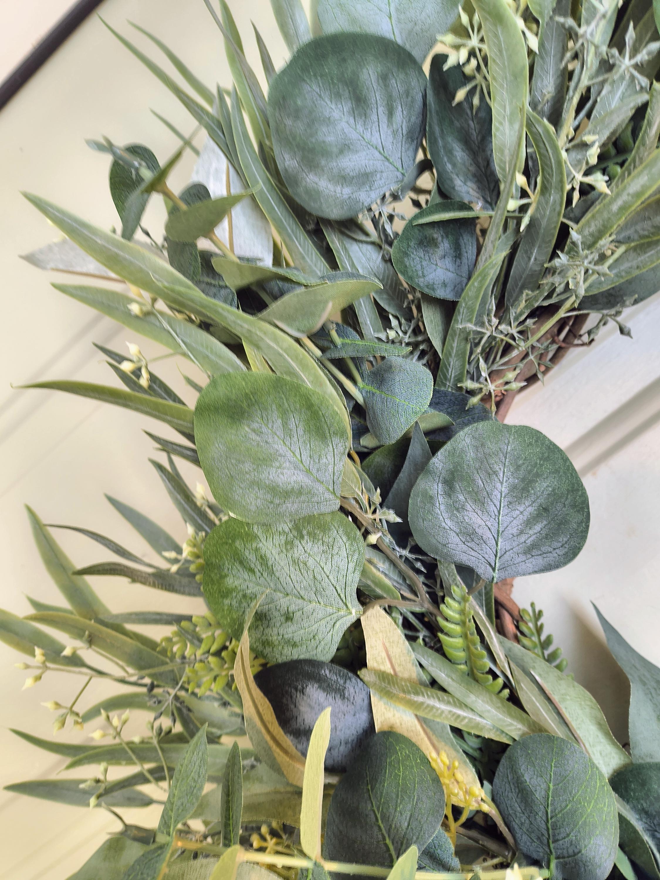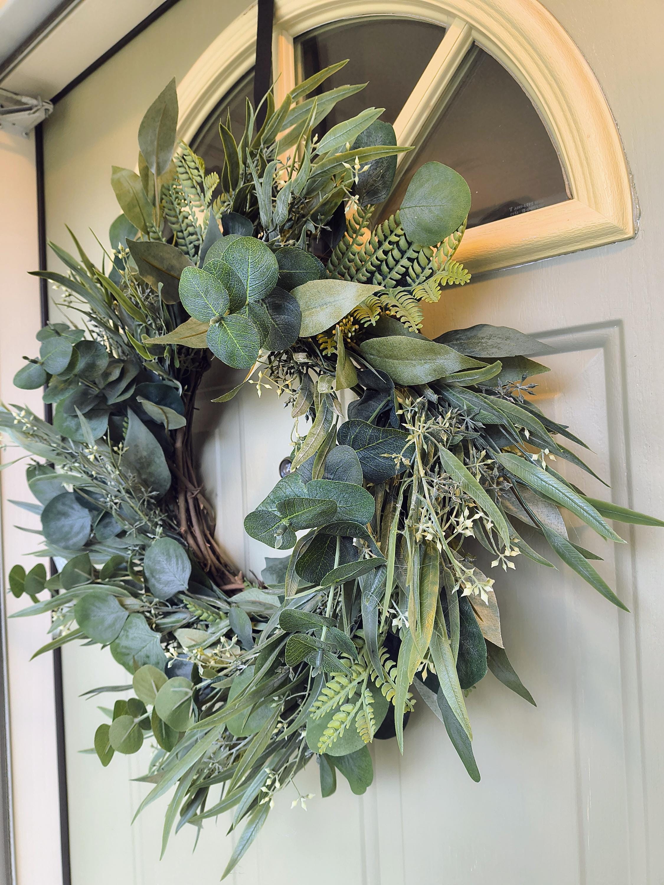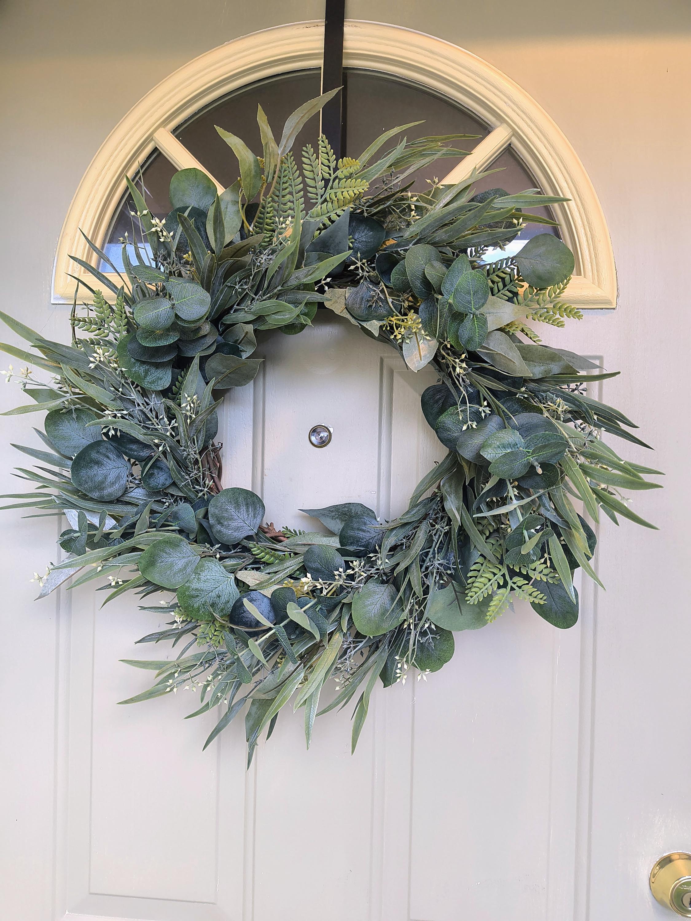 Bring understated elegance to your home with this handmade 23-inch eucalyptus wreath. Designed with a mix of lush faux greenery, this full, airy wreath makes the perfect statement for neutral, minimalist, farmhouse, or rustic styles — ideal for any season.
