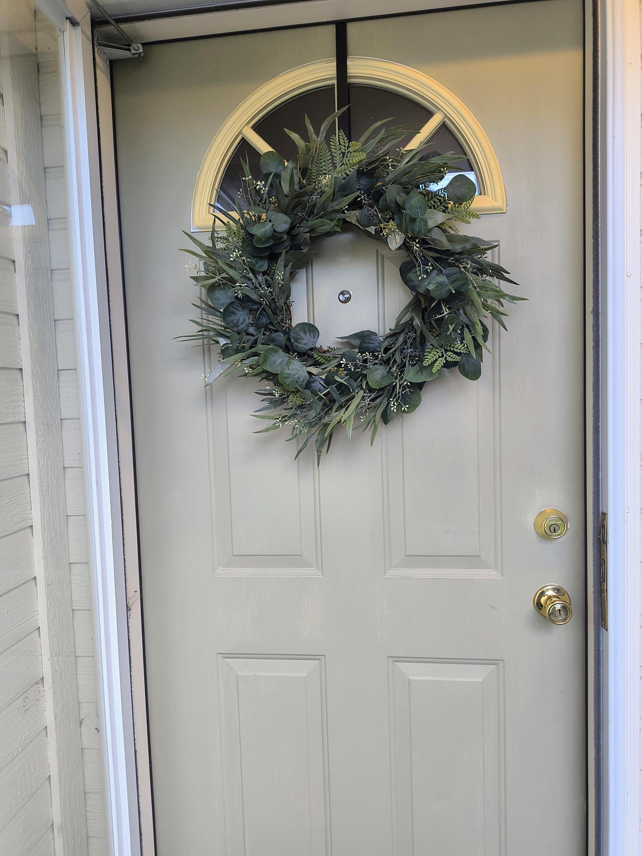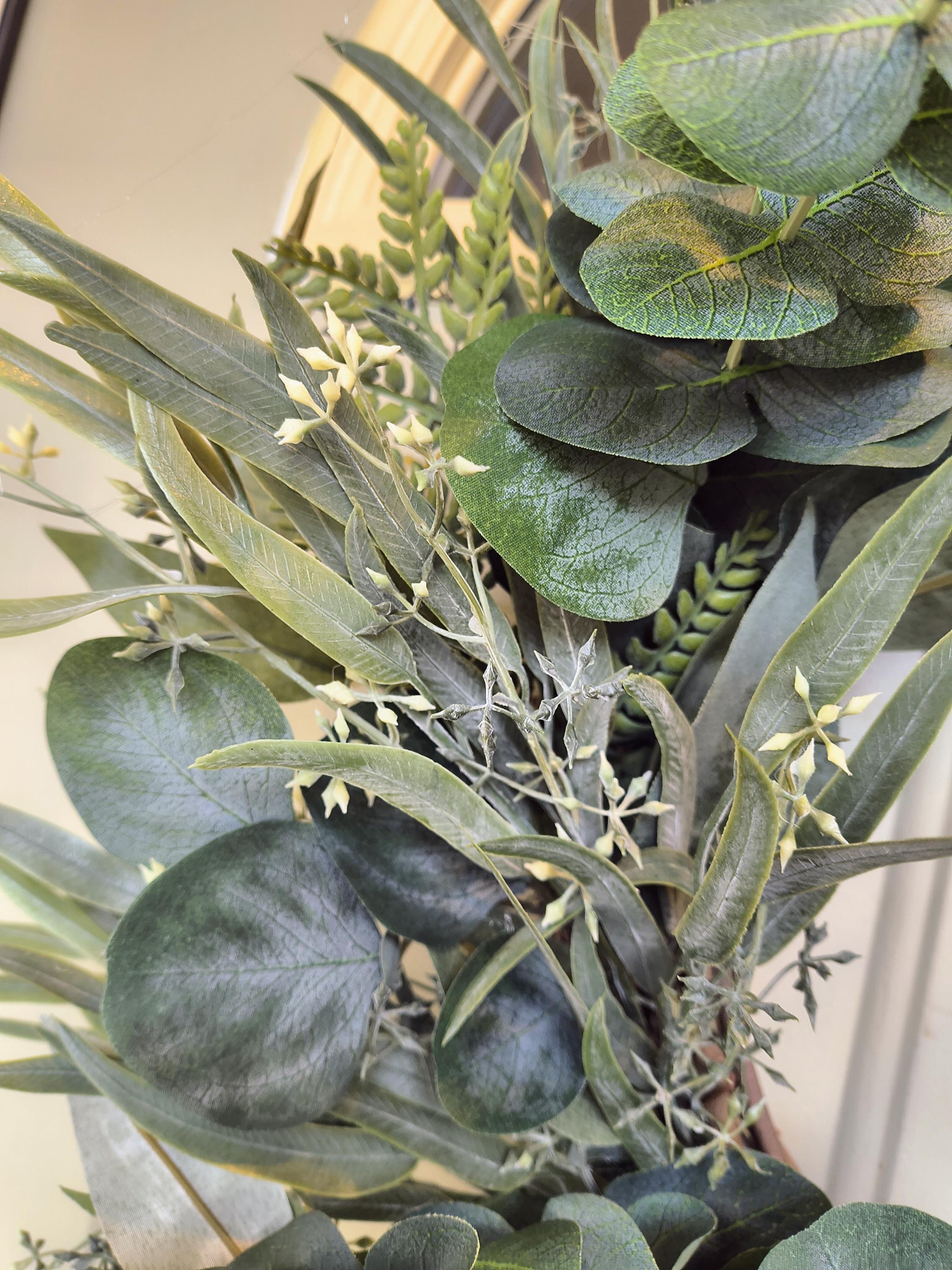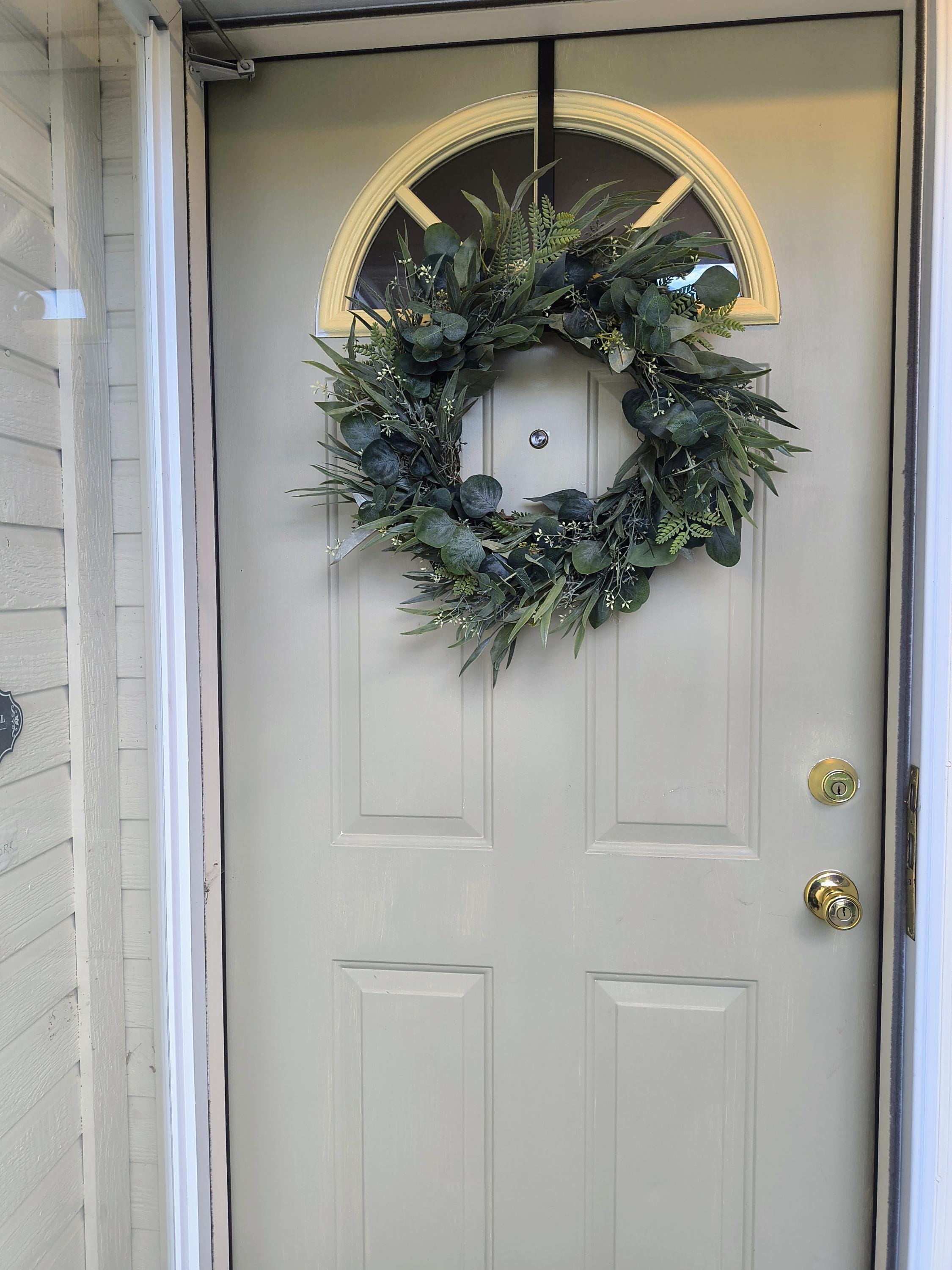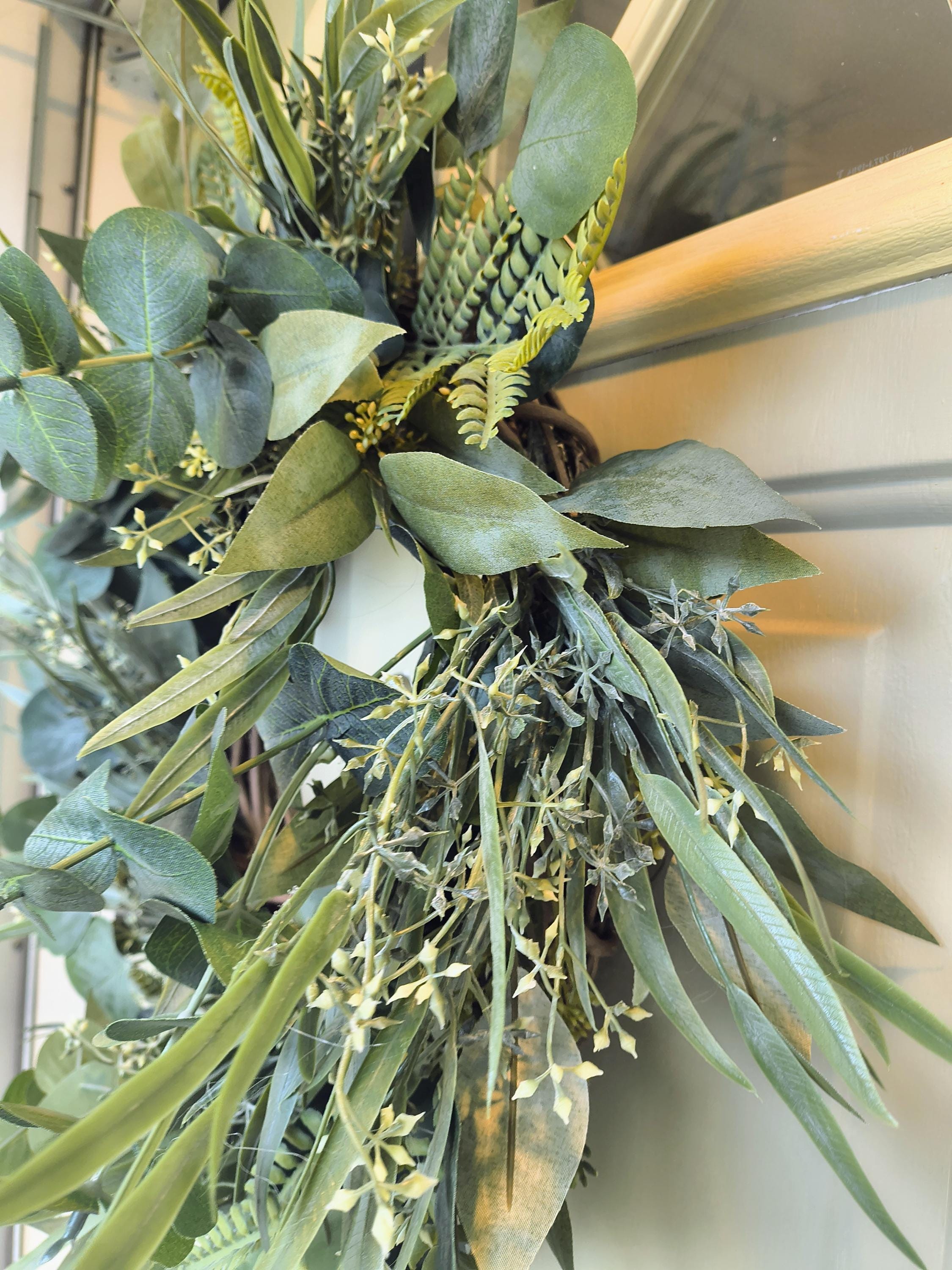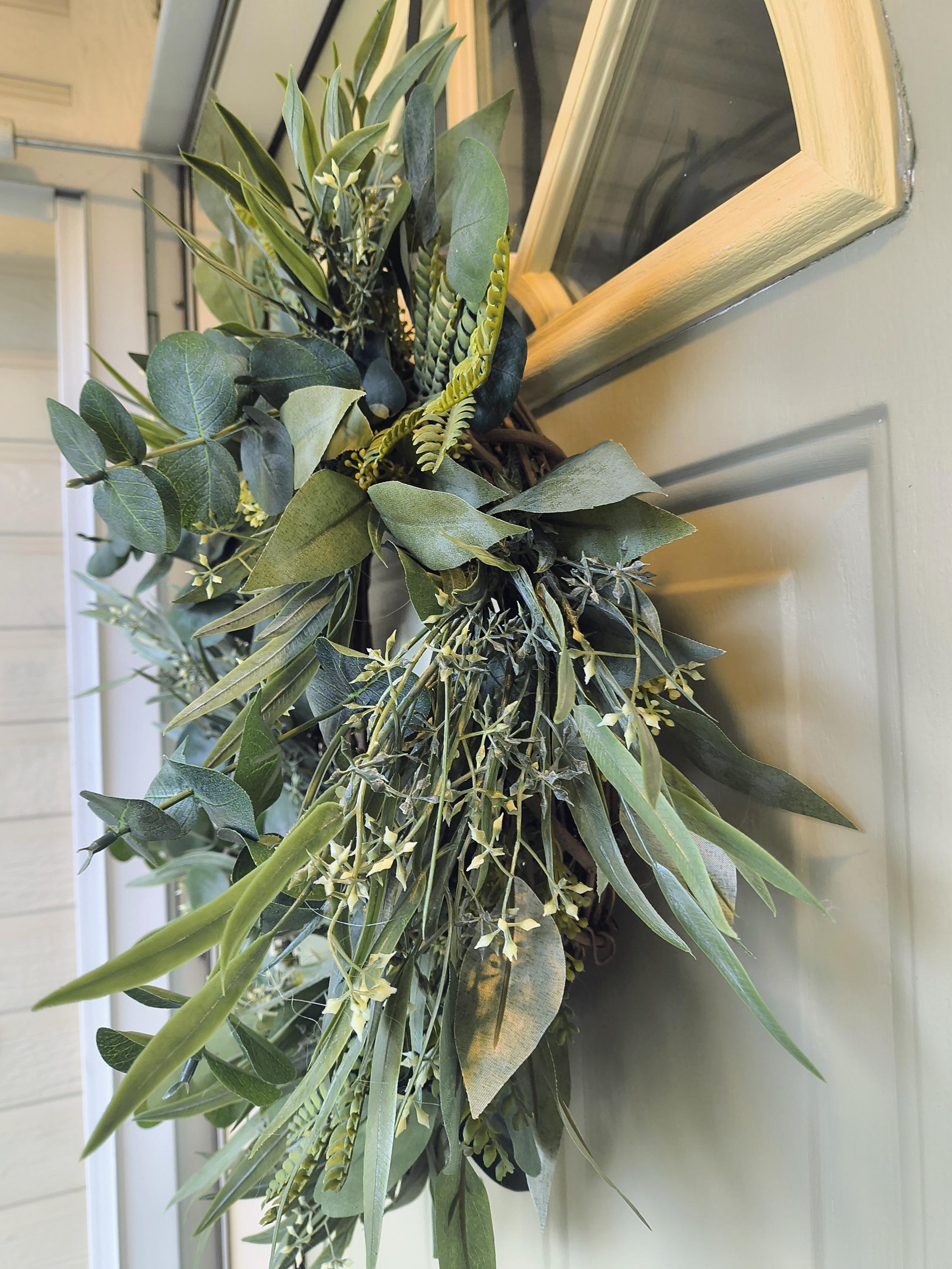 Bring understated elegance to your home with this handmade 23-inch eucalyptus wreath. Designed with a mix of lush faux greenery, this full, airy wreath makes the perfect statement for neutral, minimalist, farmhouse, or rustic styles — ideal for any season.