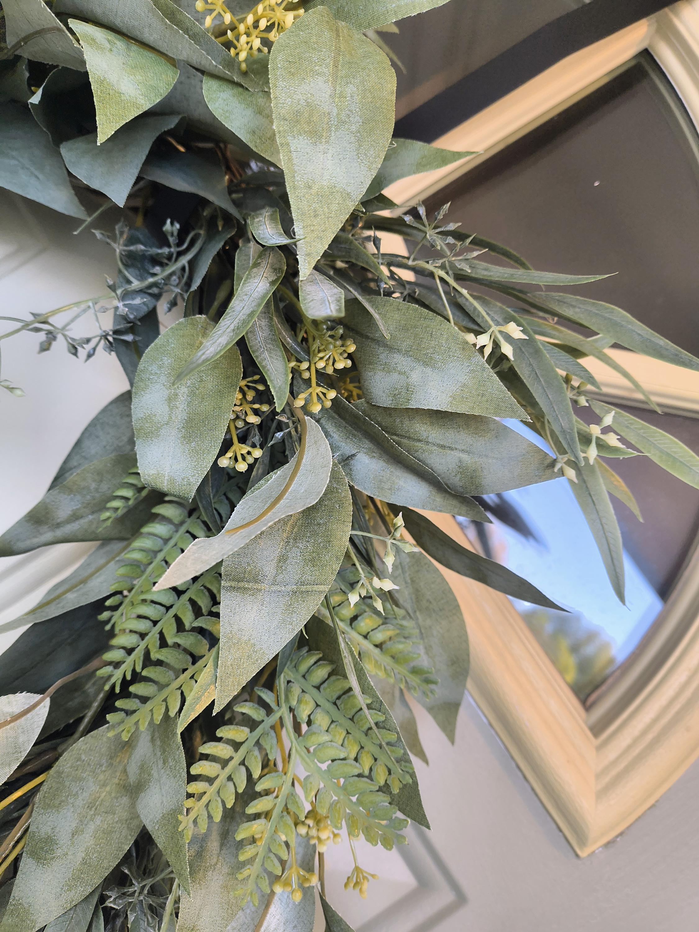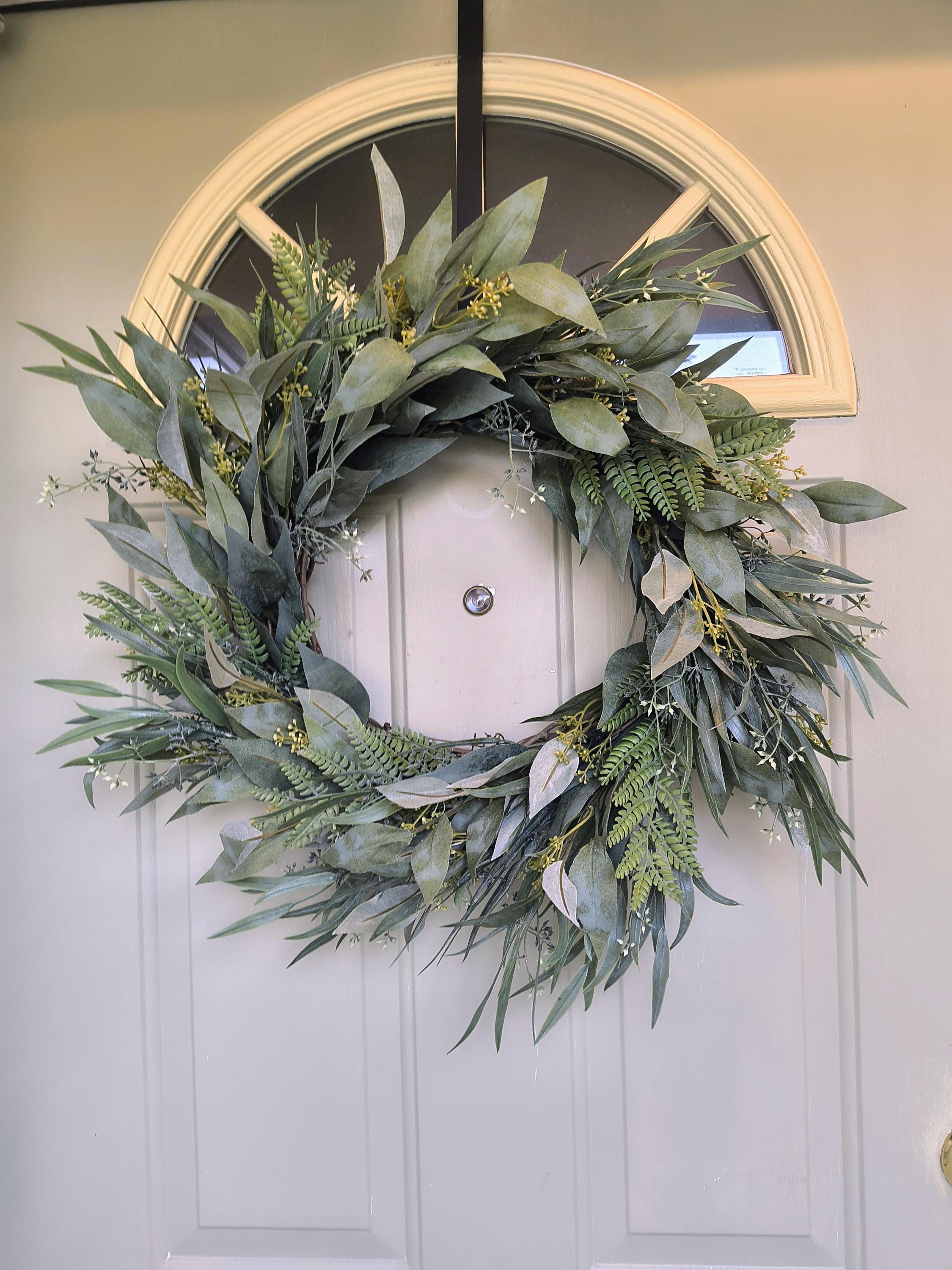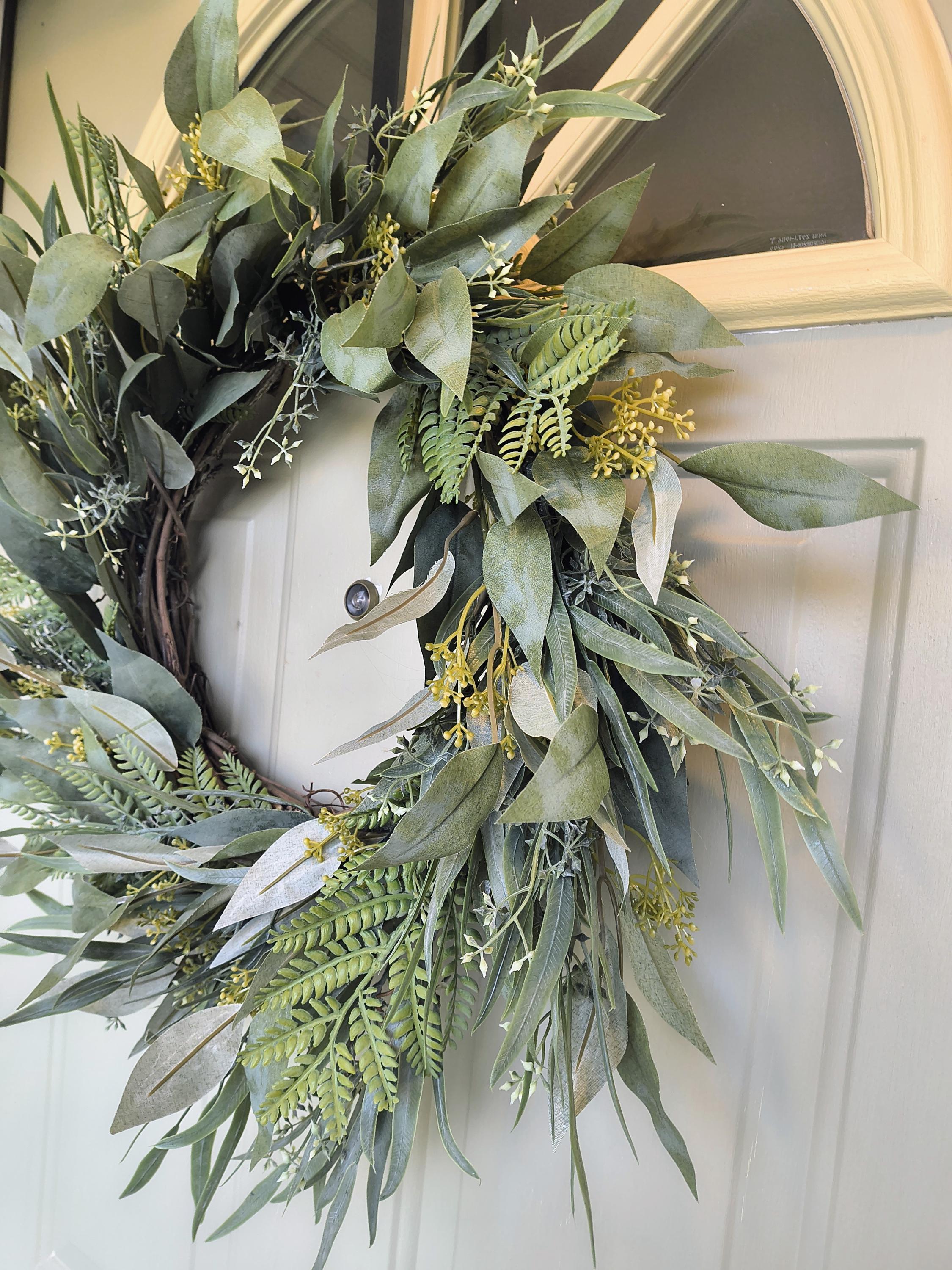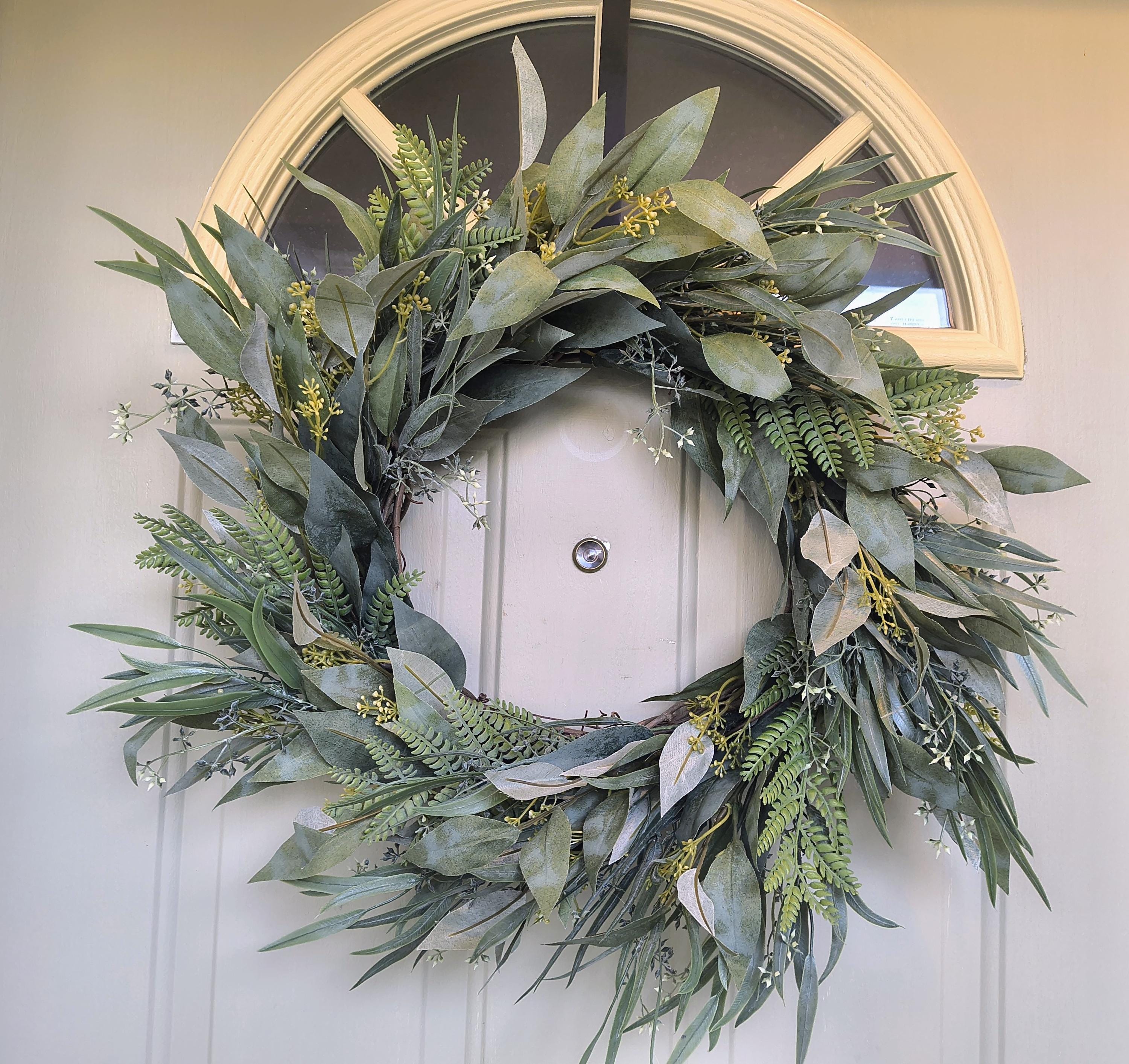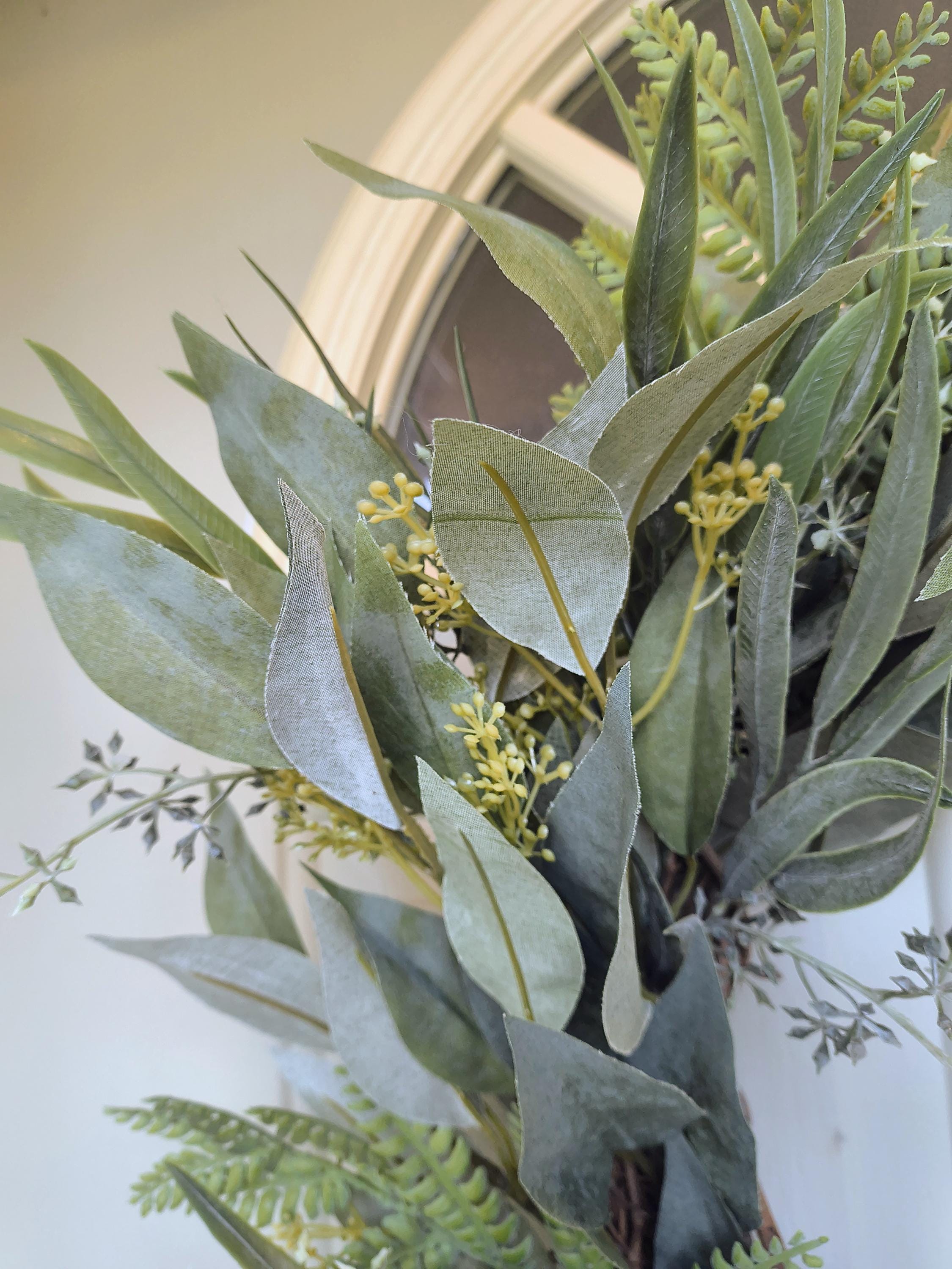🌿 Bring a touch of natural elegance to your home with this 23” rustic faux greenery wreath, featuring a full mix of wild eucalyptus, fern, and natural foliage for an effortlessly organic look.