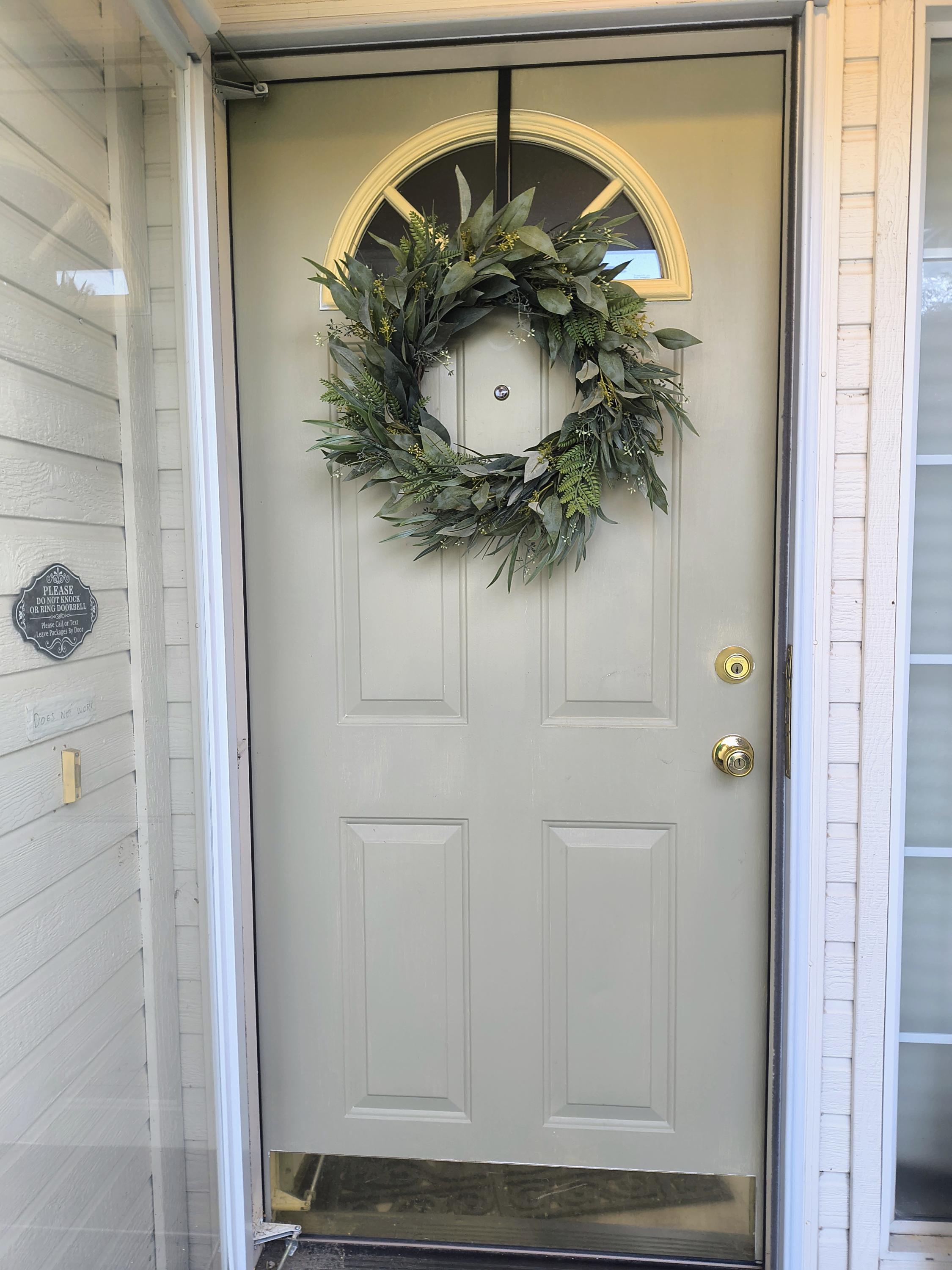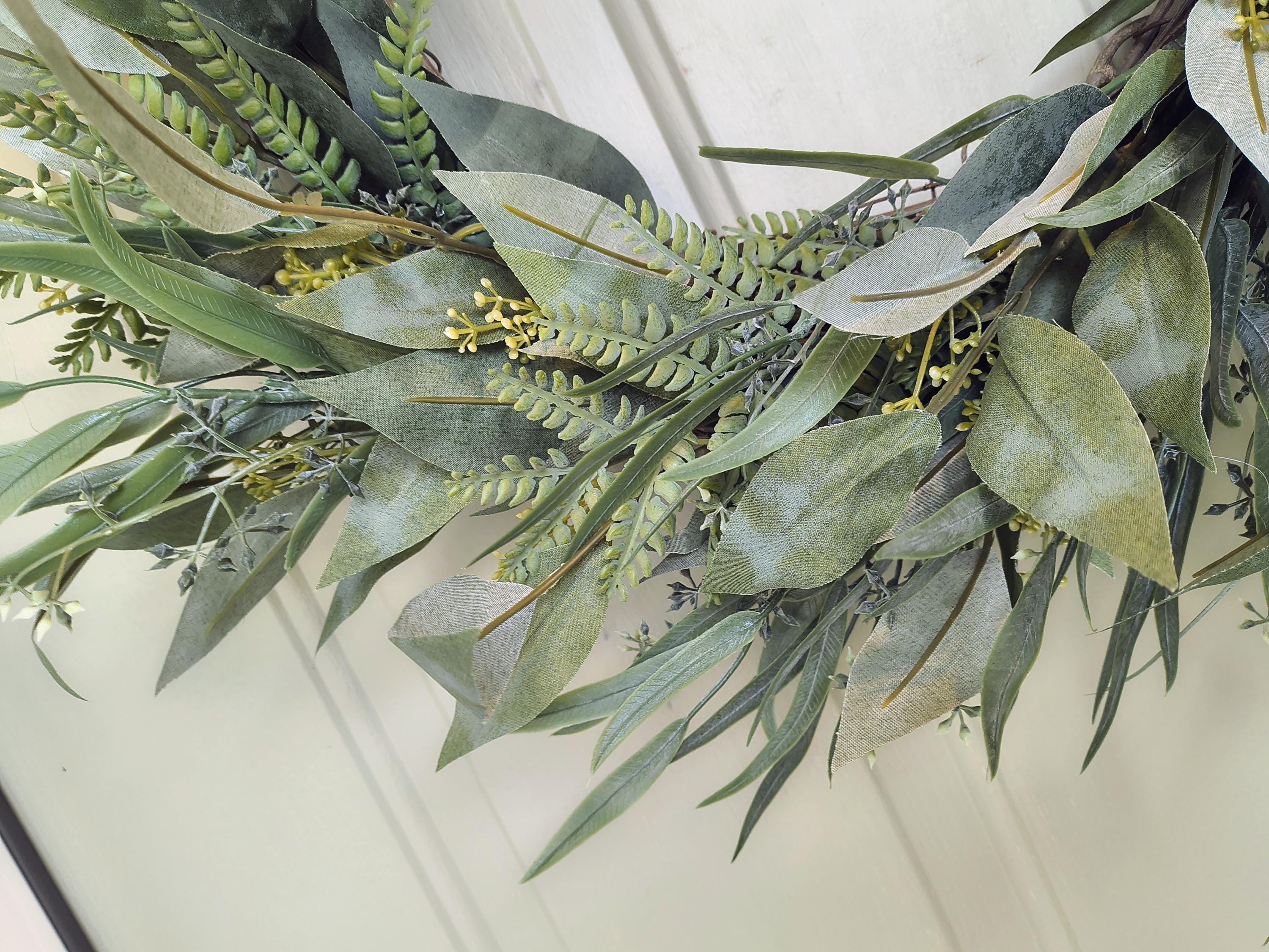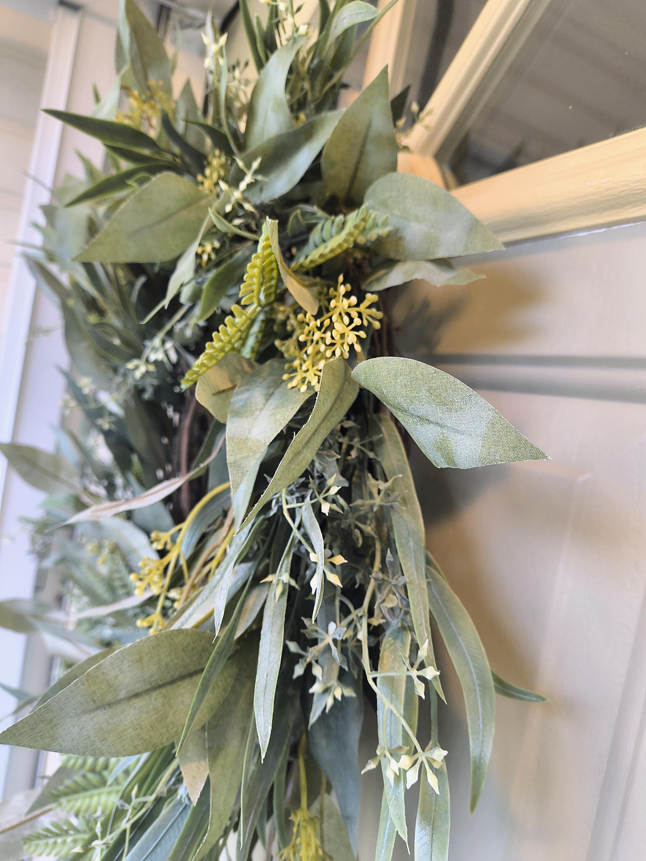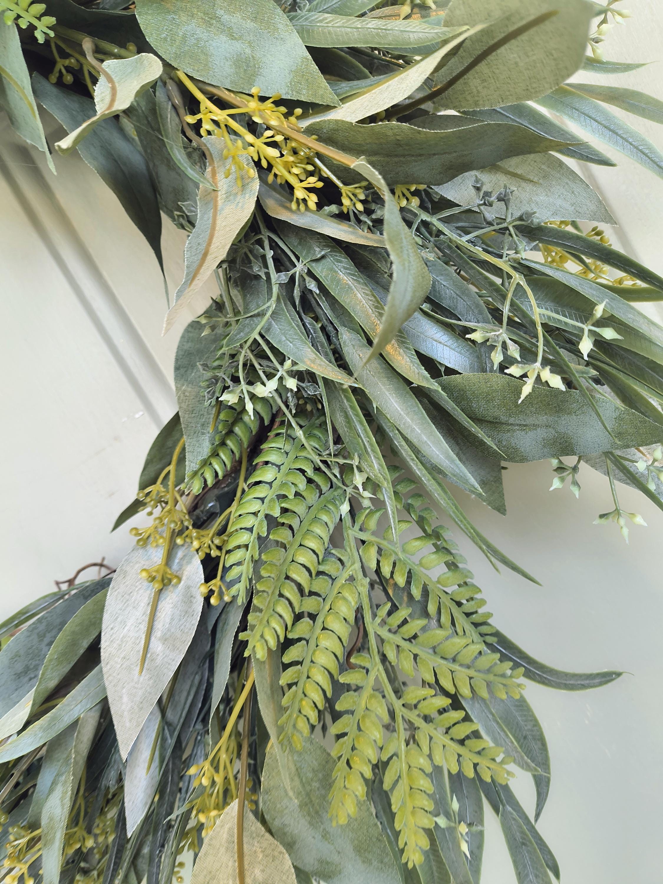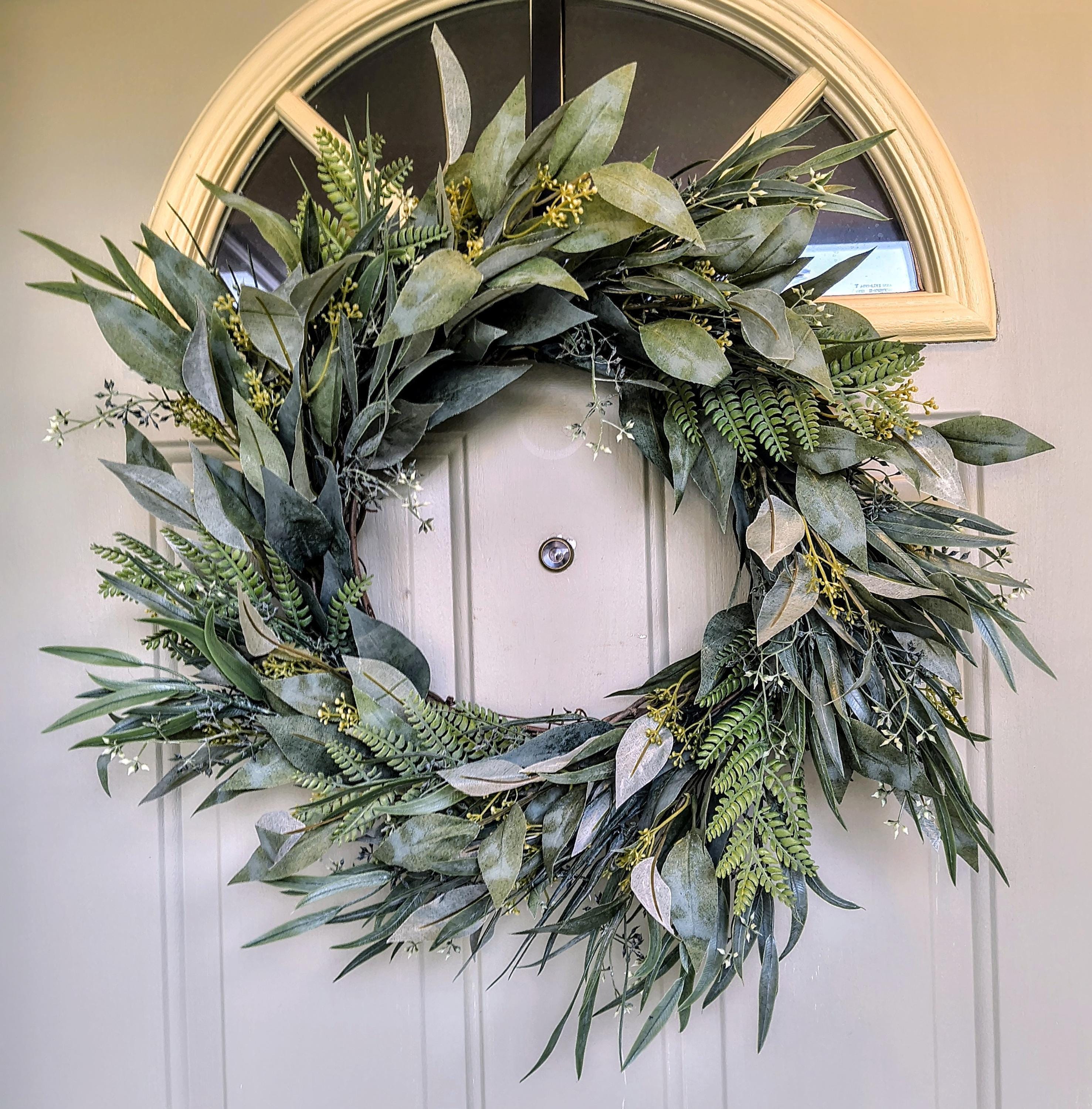 🌿 Bring a touch of natural elegance to your home with this 23” rustic faux greenery wreath, featuring a full mix of wild eucalyptus, fern, and natural foliage for an effortlessly organic look.