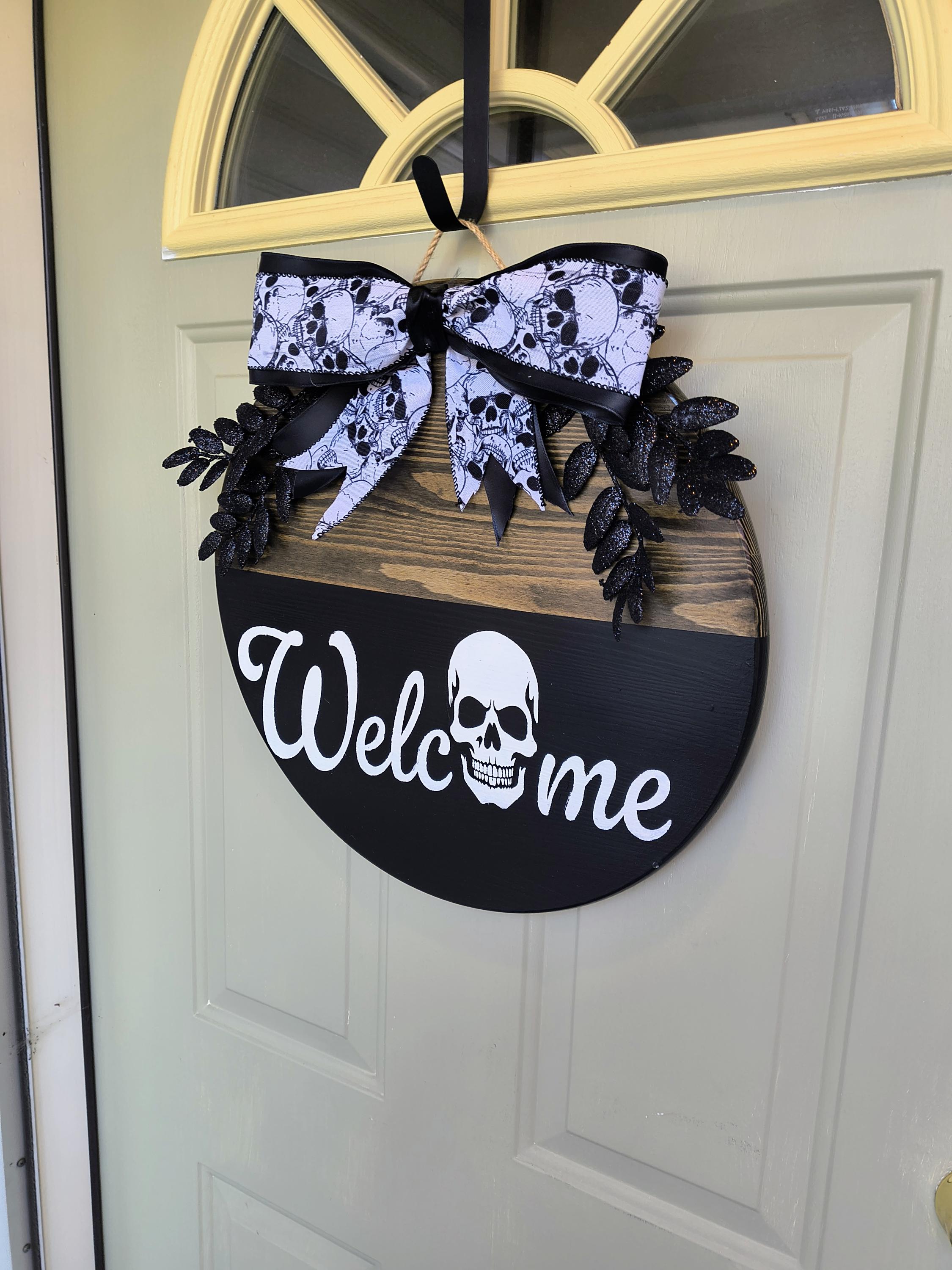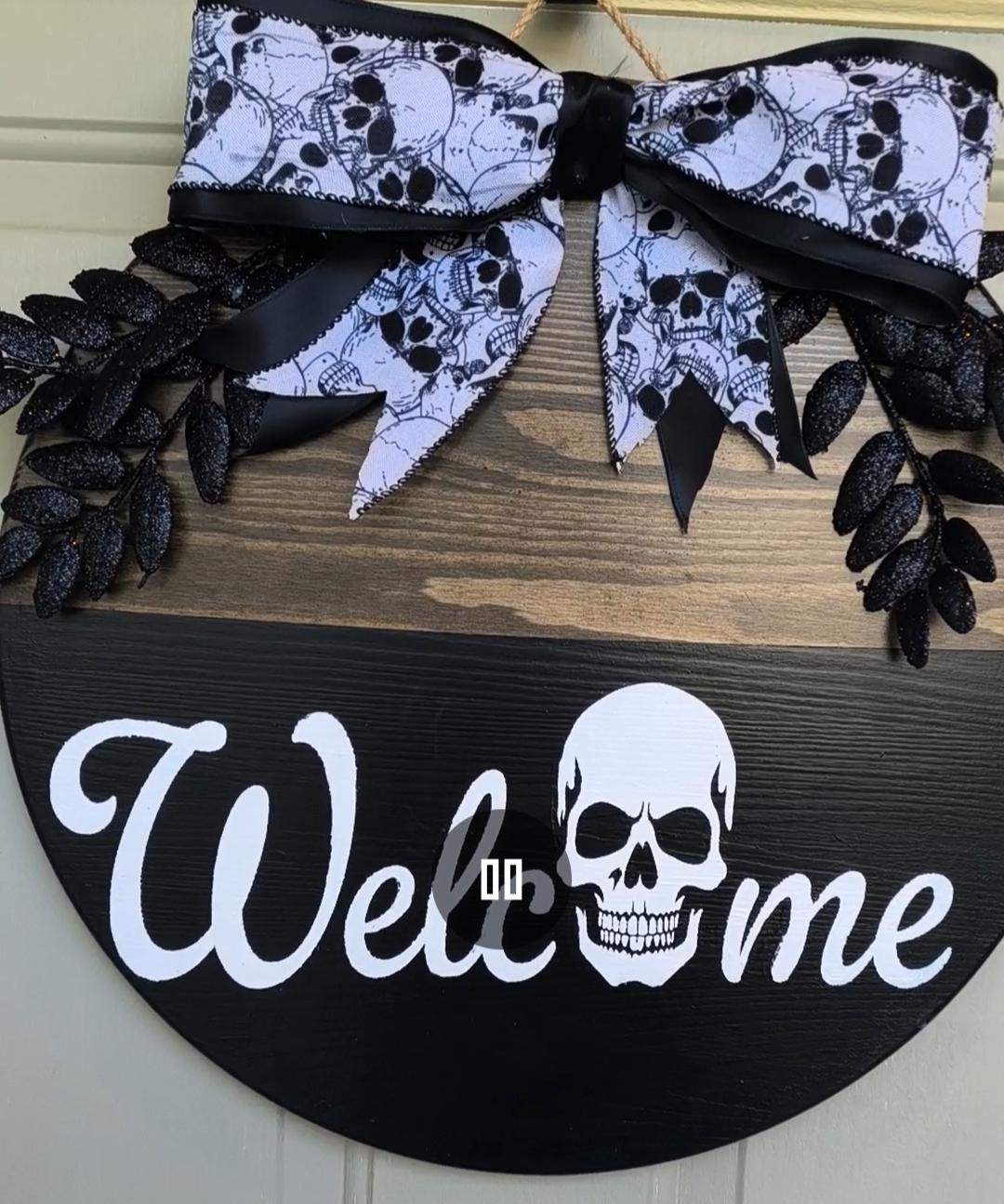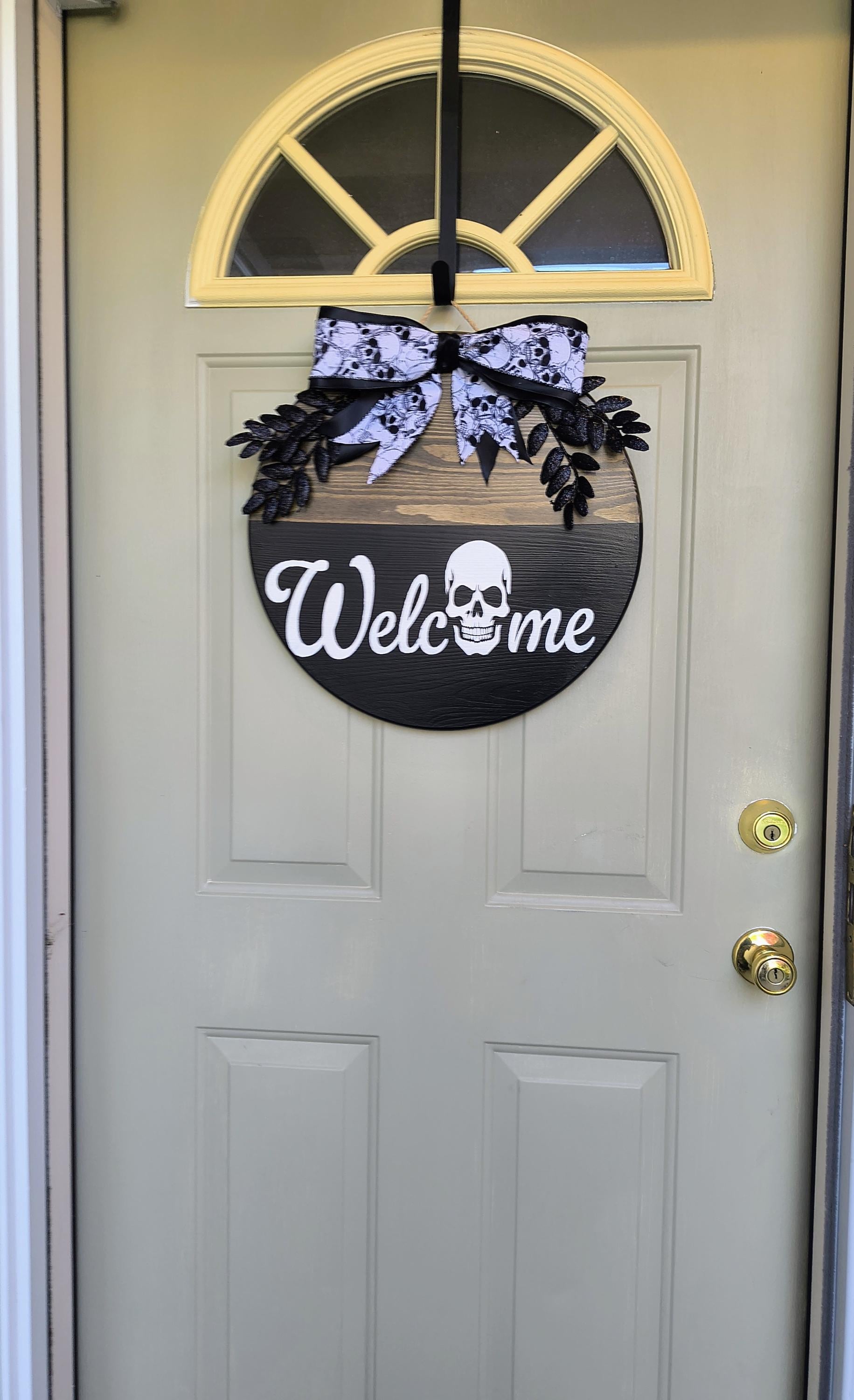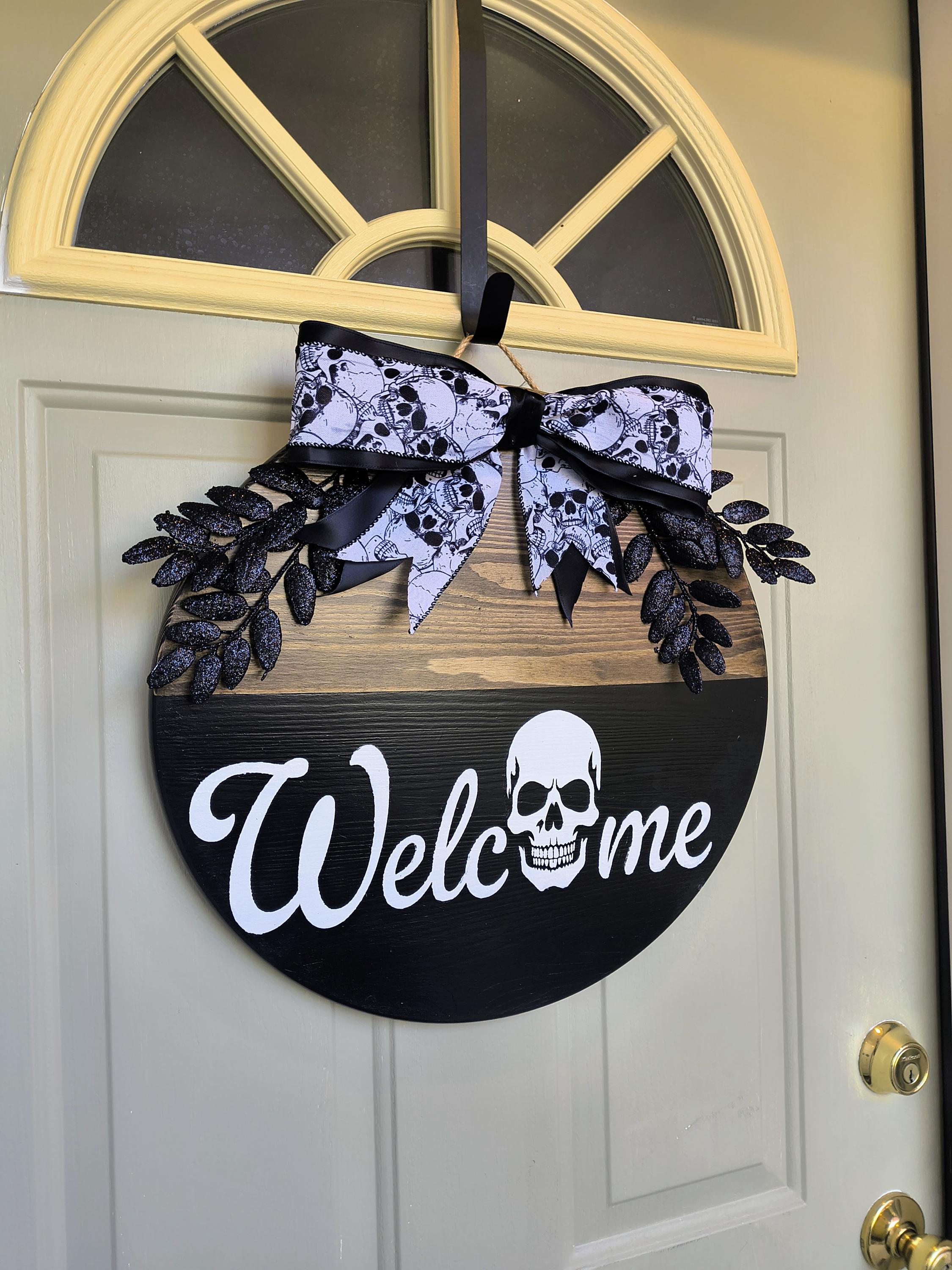 This handcrafted 18-inch “Welcome” skull door hanger combines rustic charm with spooky flair! Designed with a half wood/half black color block, it features white gothic script, a detailed skull graphic, glittery black leaves, and a bold skull-print bow. Whether you’re prepping for Halloween or rocking your dark side year-round, this piece sets the tone at first glance.