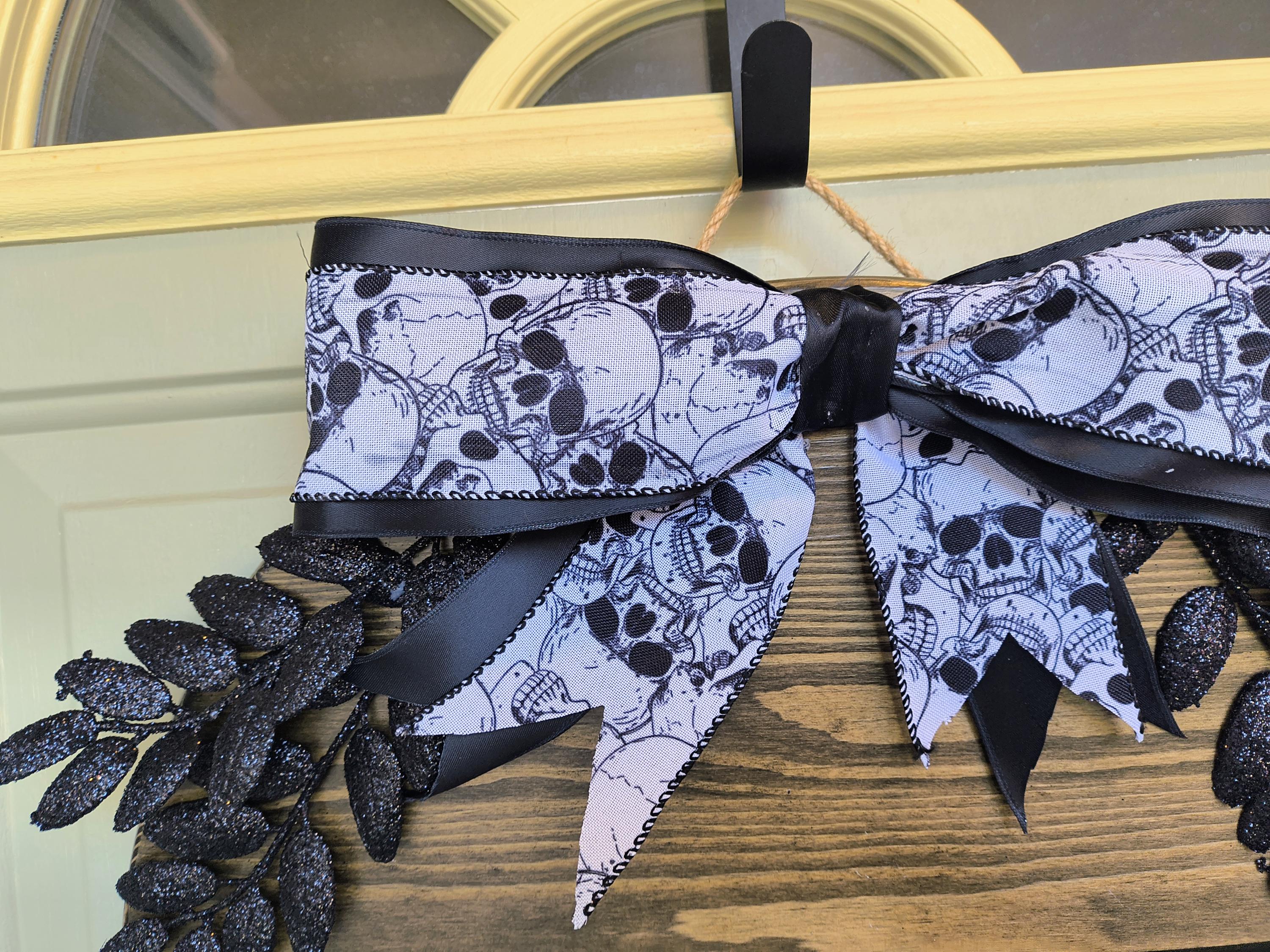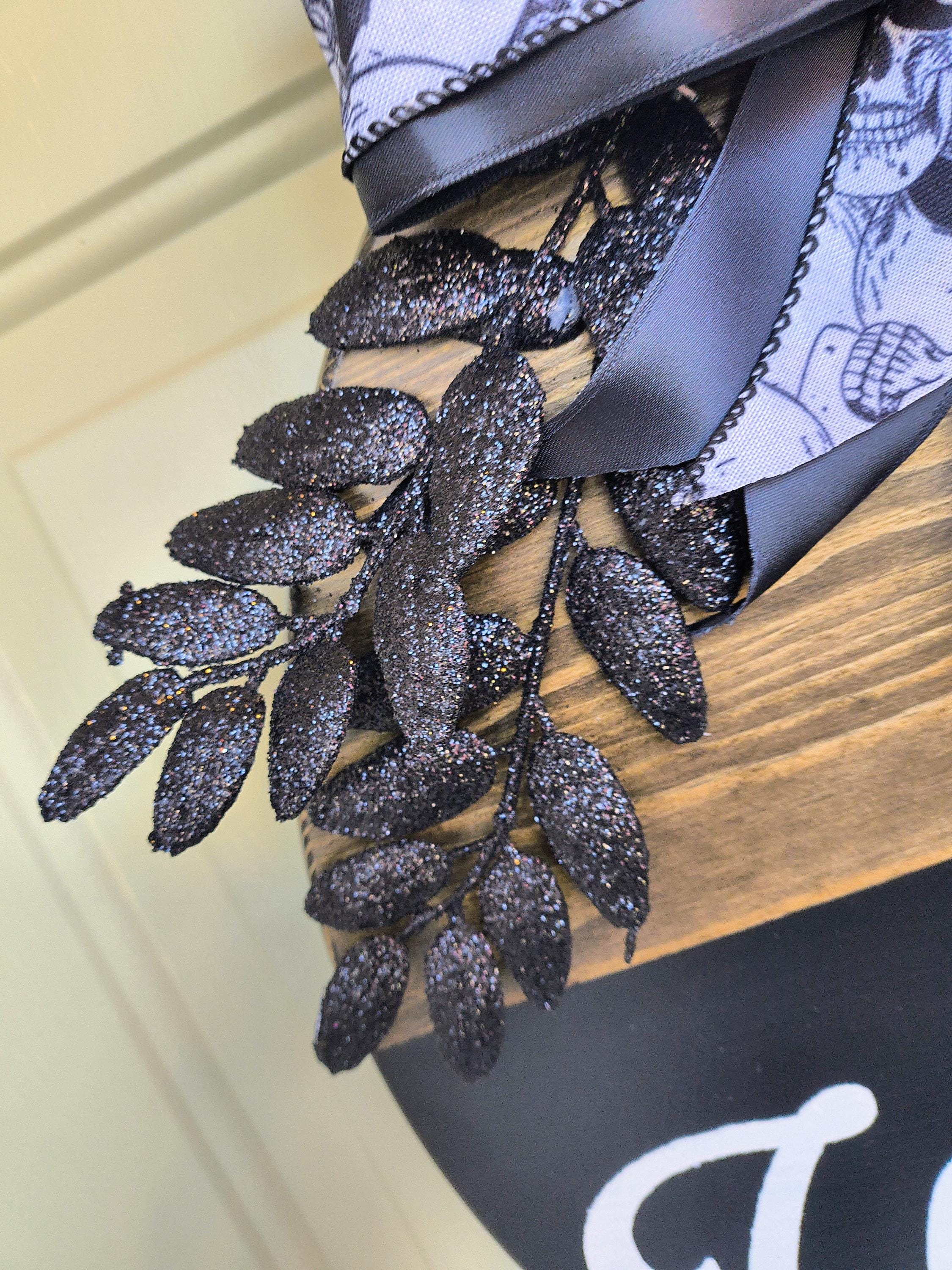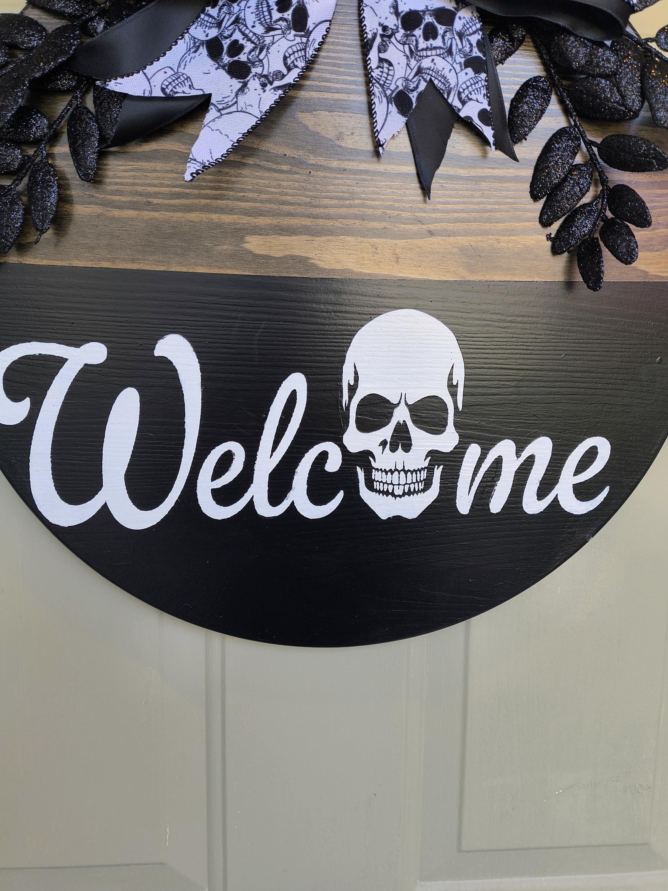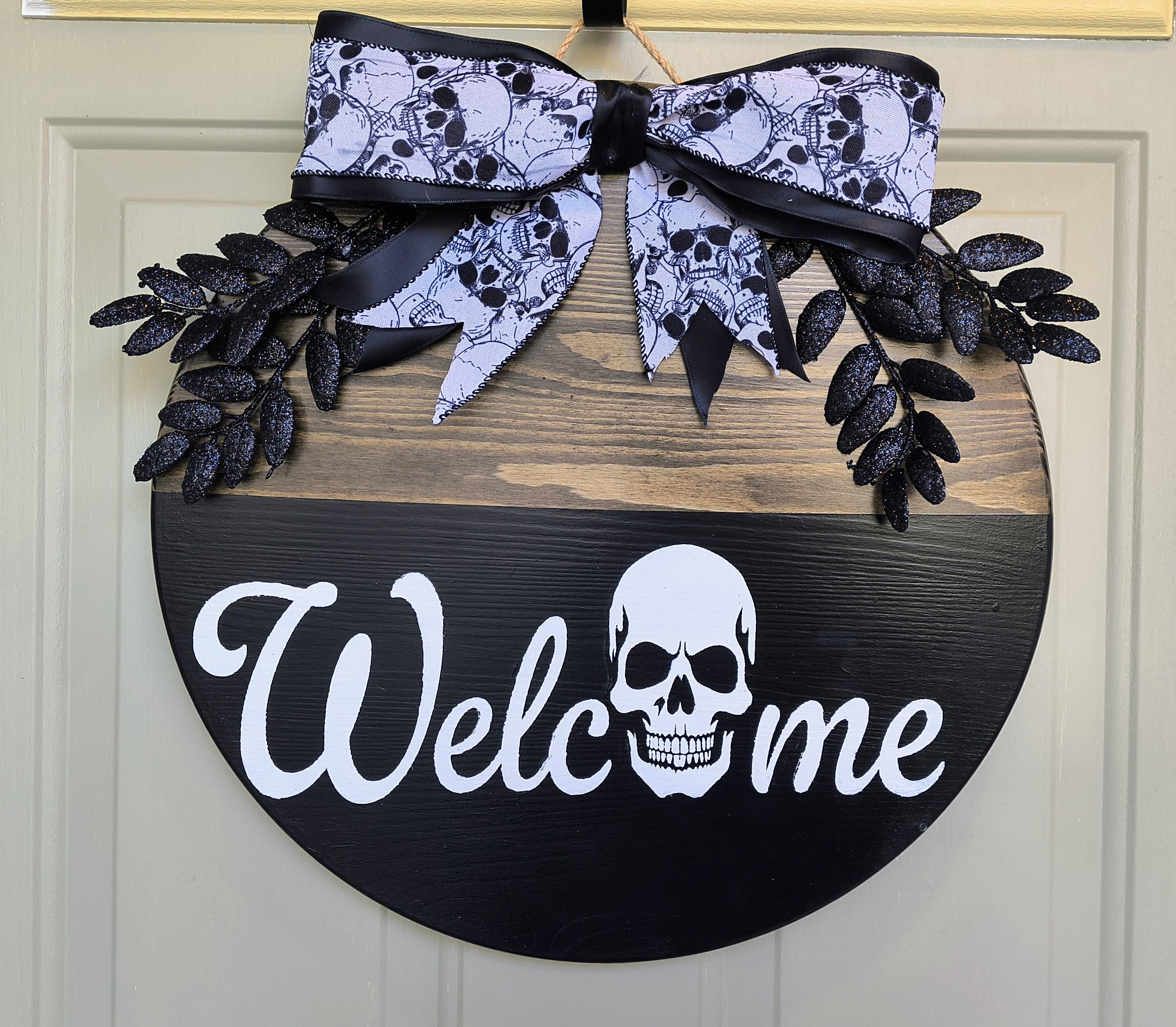 This handcrafted 18-inch “Welcome” skull door hanger combines rustic charm with spooky flair! Designed with a half wood/half black color block, it features white gothic script, a detailed skull graphic, glittery black leaves, and a bold skull-print bow. Whether you’re prepping for Halloween or rocking your dark side year-round, this piece sets the tone at first glance.