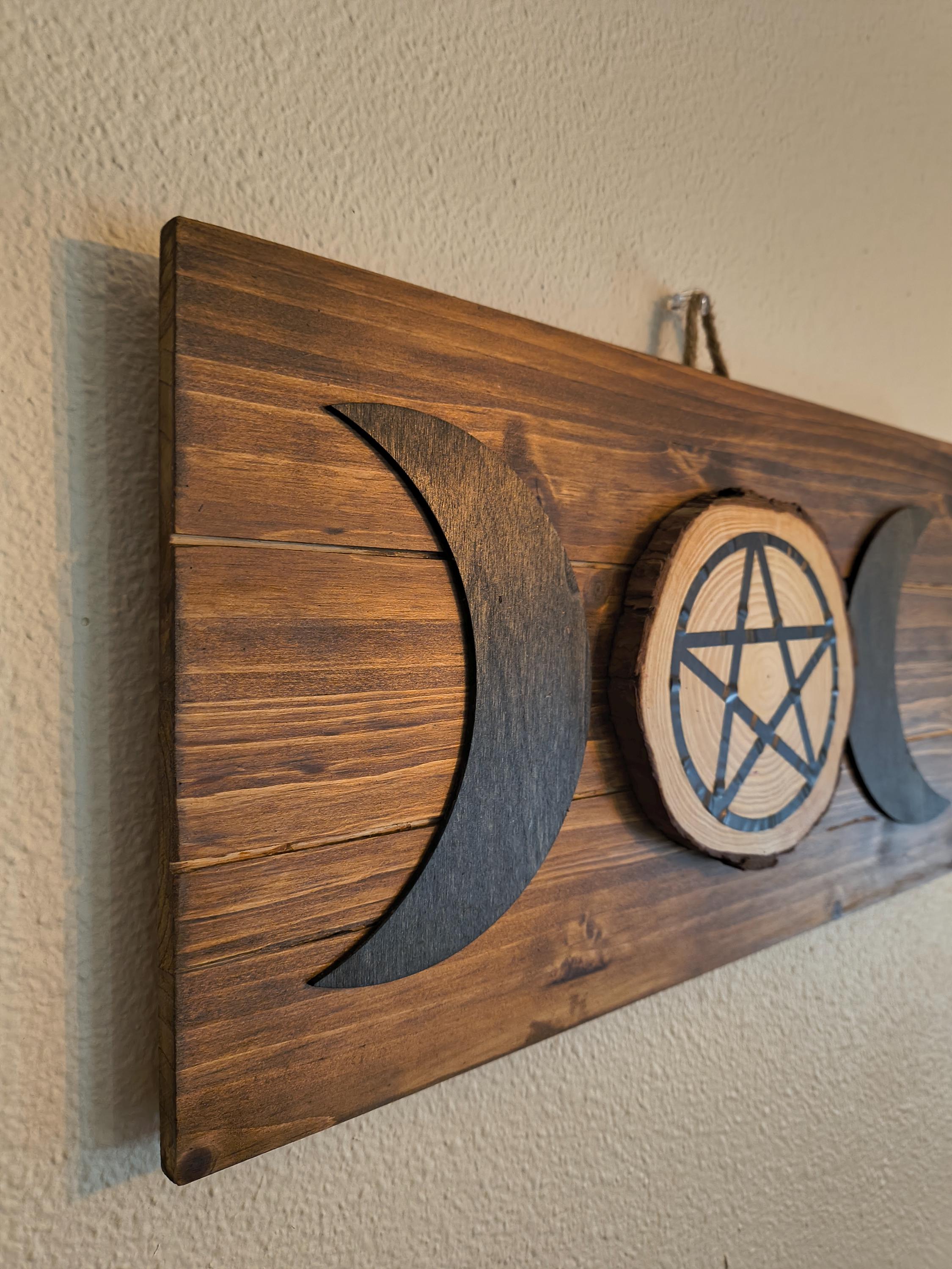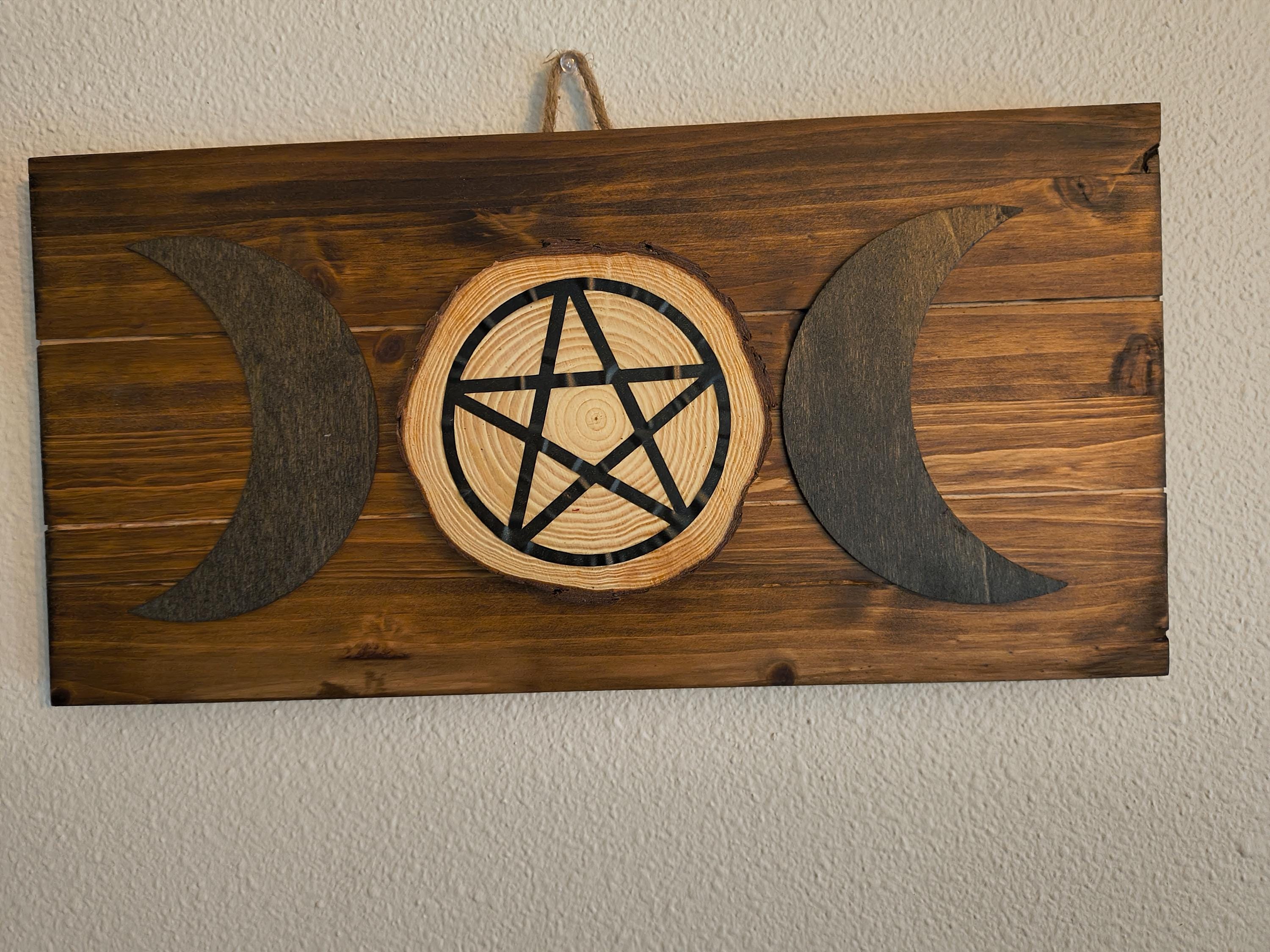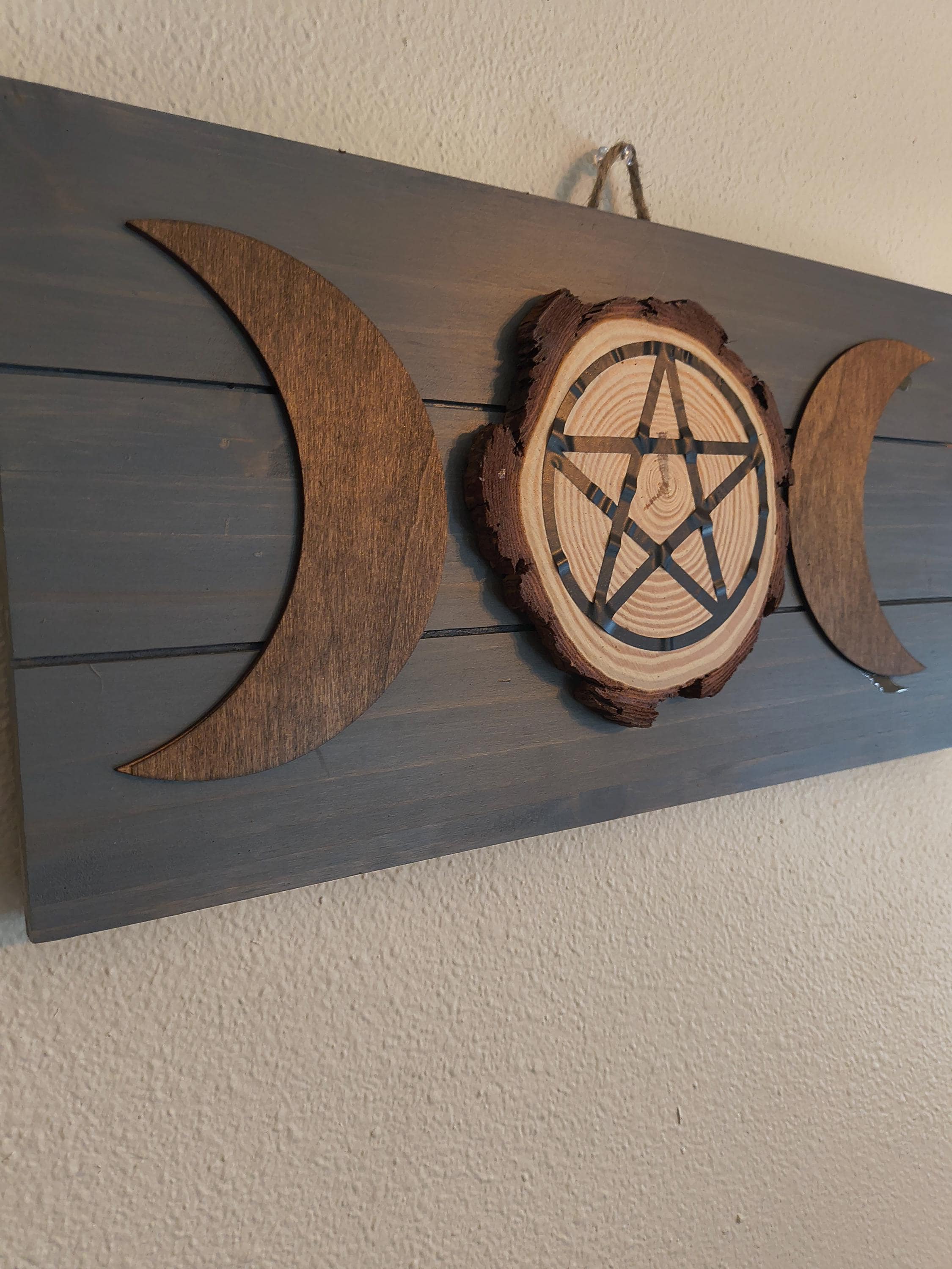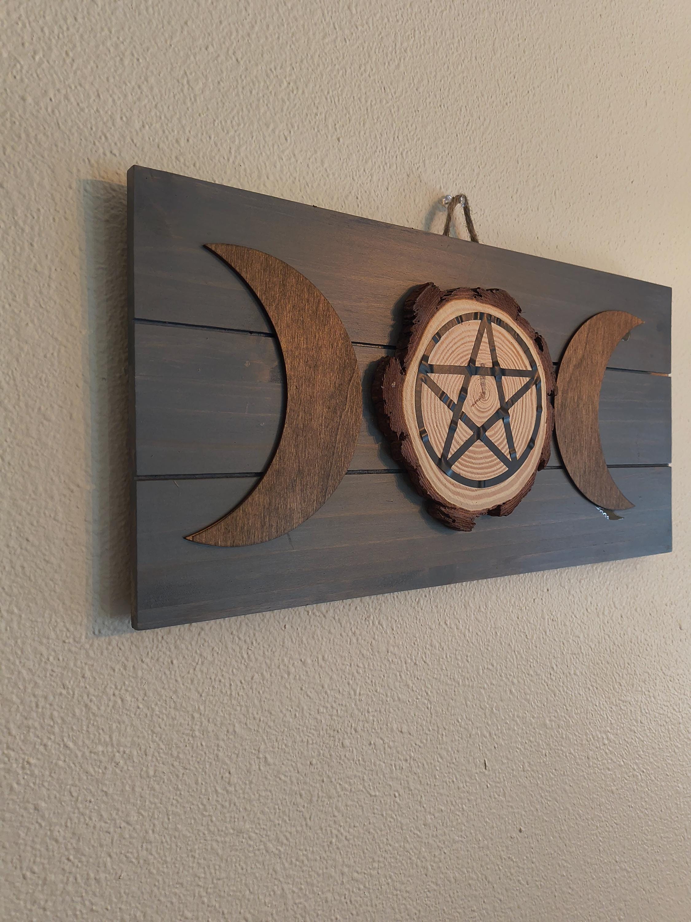 🌙 Embrace the power of the divine feminine with this handcrafted Triple Moon wall plaque, featuring a wood-burned pentacle on a raw wood slice, flanked by rich, crescent moons on a stained wood background.