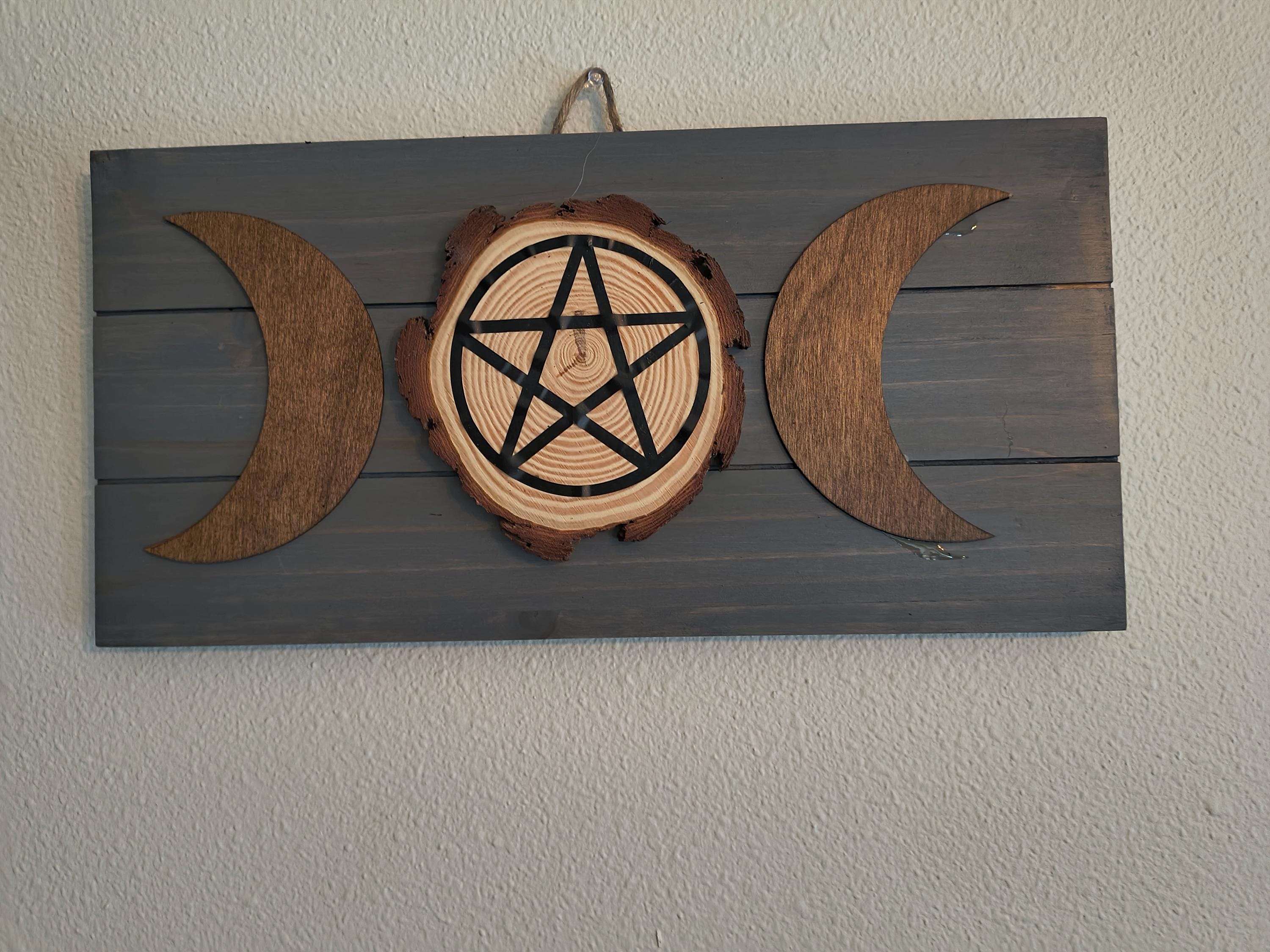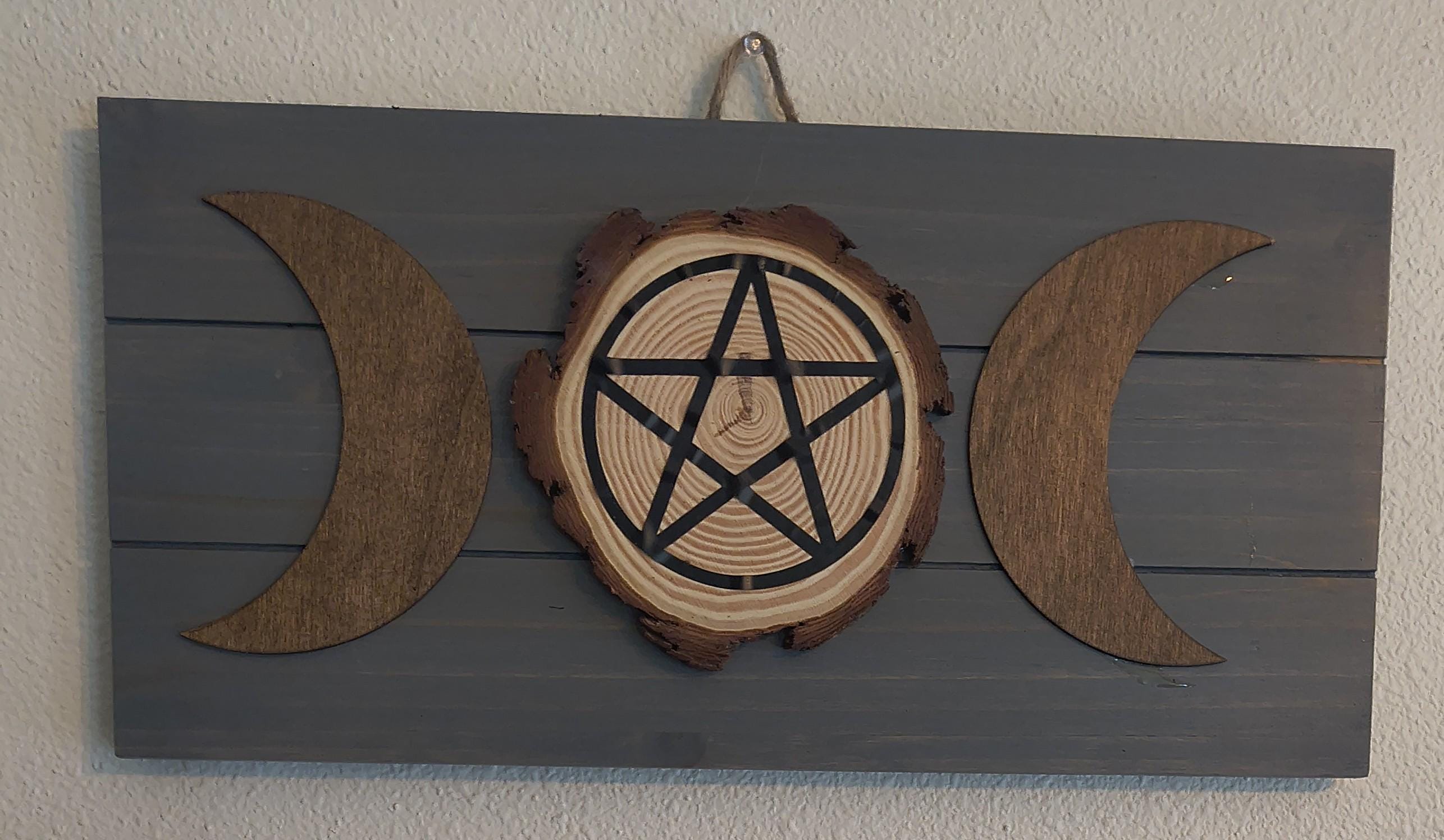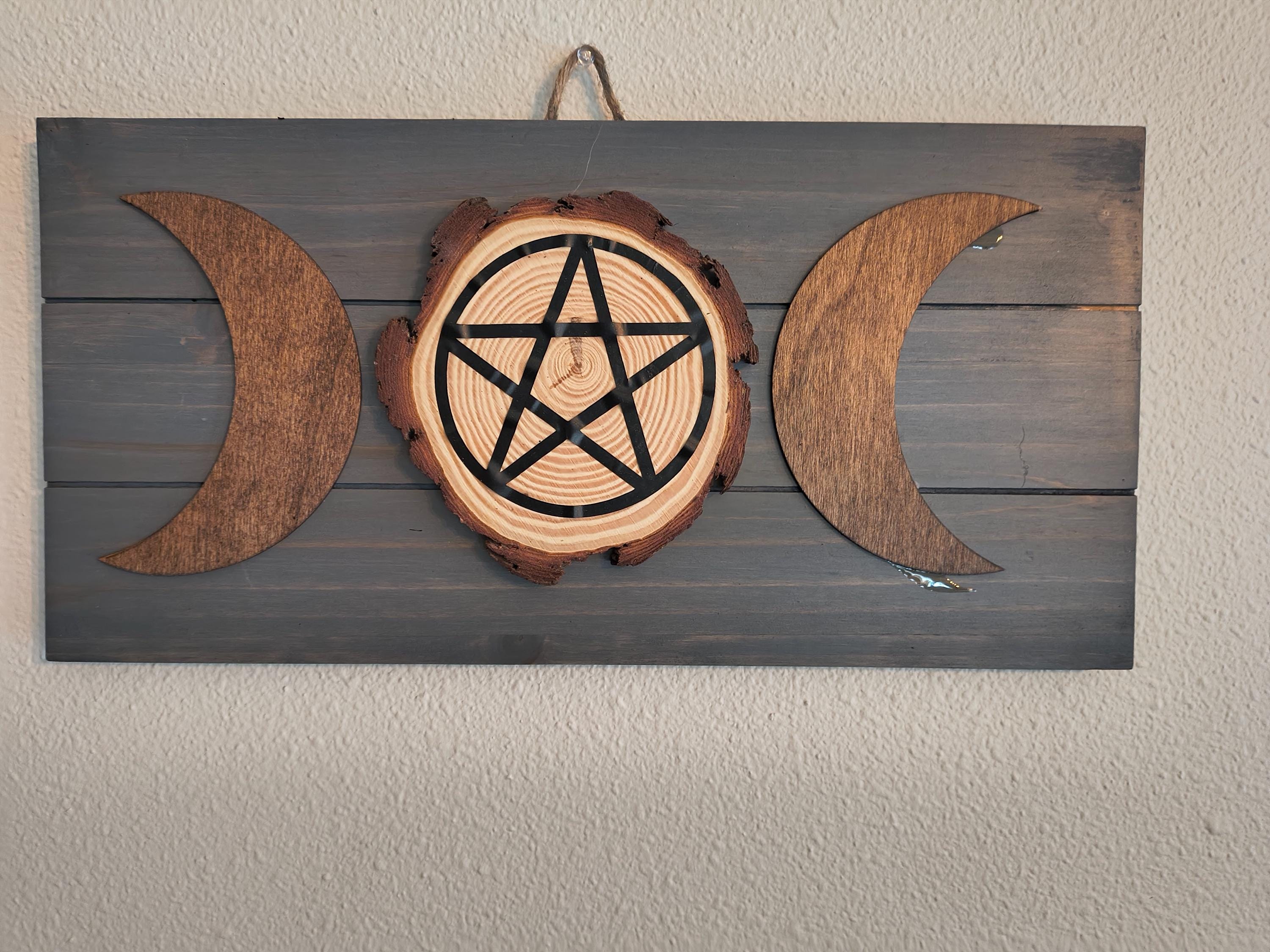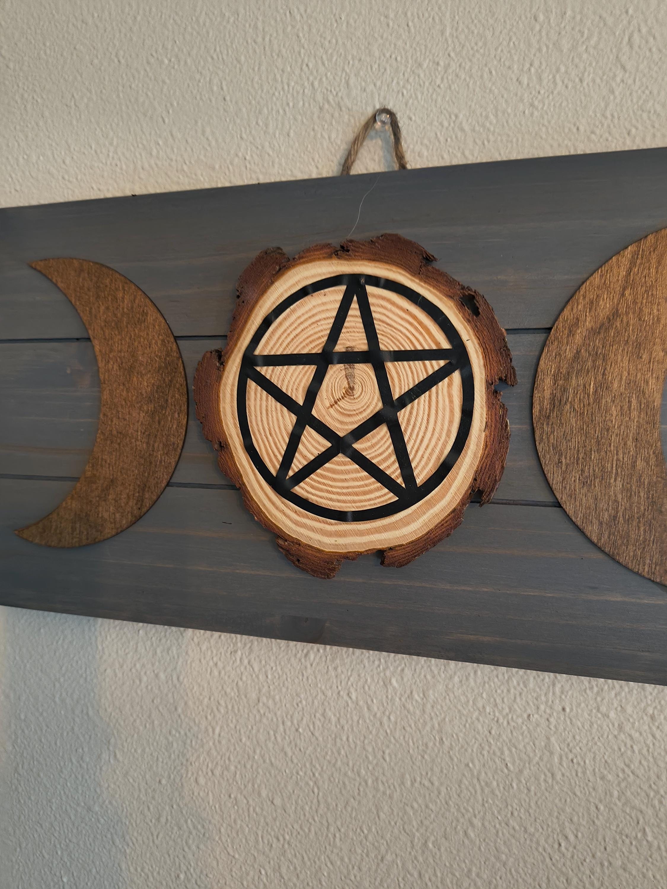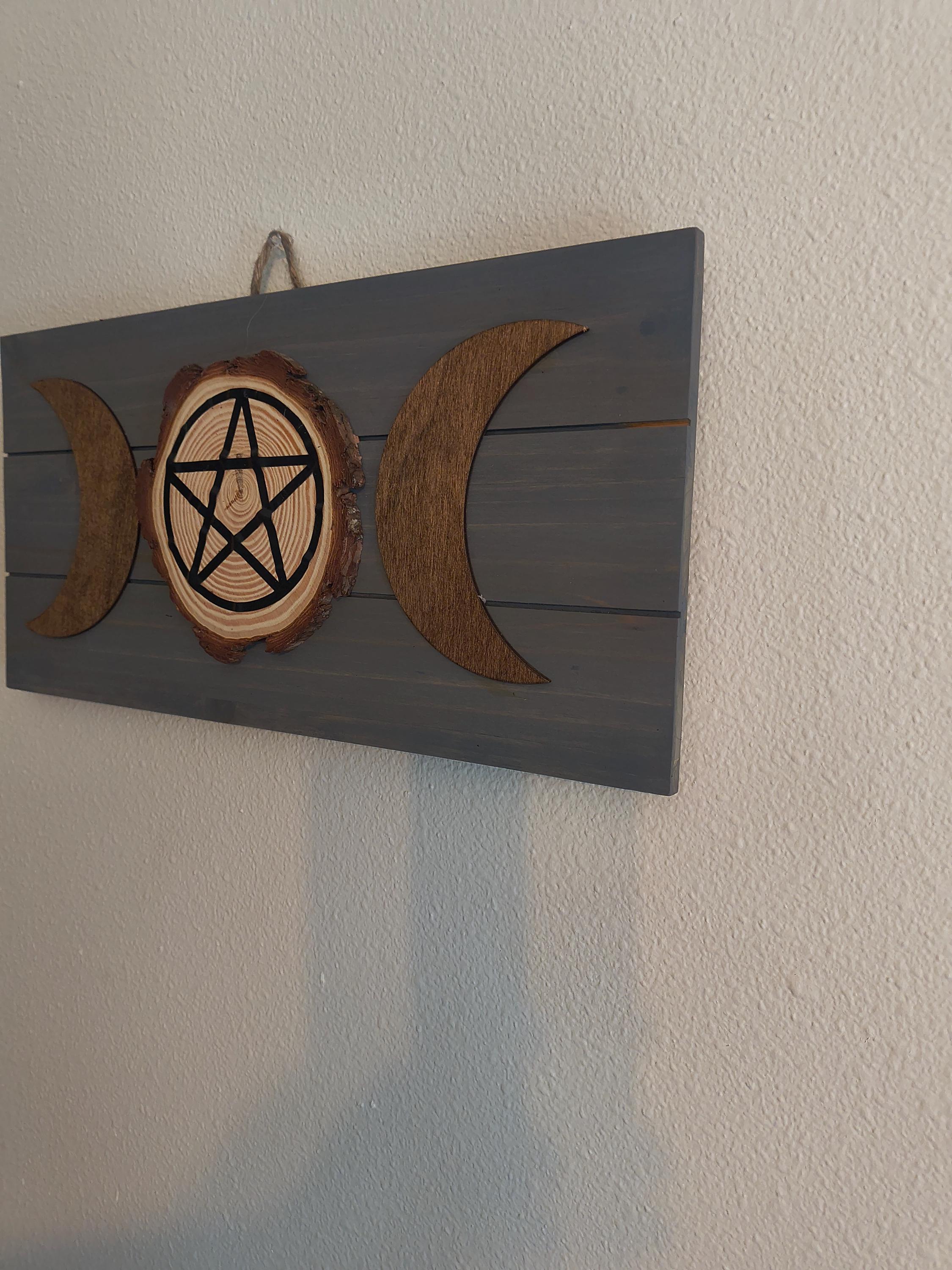 🌙 Embrace the power of the divine feminine with this handcrafted Triple Moon wall plaque, featuring a wood-burned pentacle on a raw wood slice, flanked by rich, crescent moons on a stained wood background.