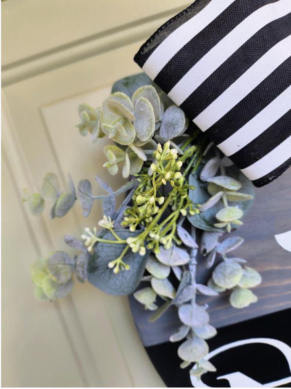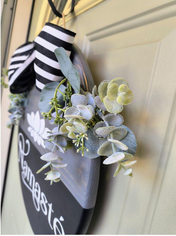 Crafted with care, this round wooden sign features a black and natural wood background, elegant faux eucalyptus greenery, and a bold black-and-white striped bow. The white lotus and graceful typography add a modern boho touch—perfect for any yoga lover, meditation room, or zen front porch.