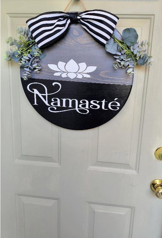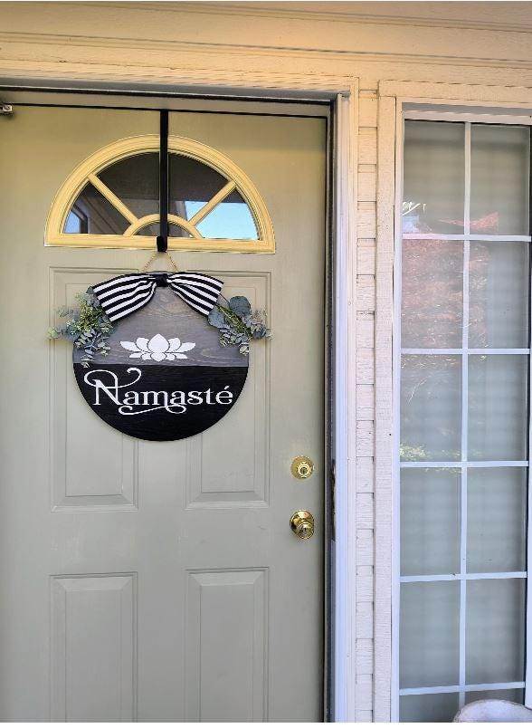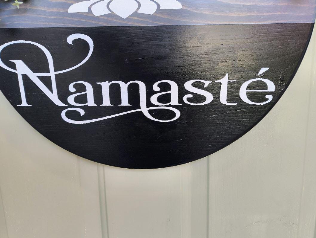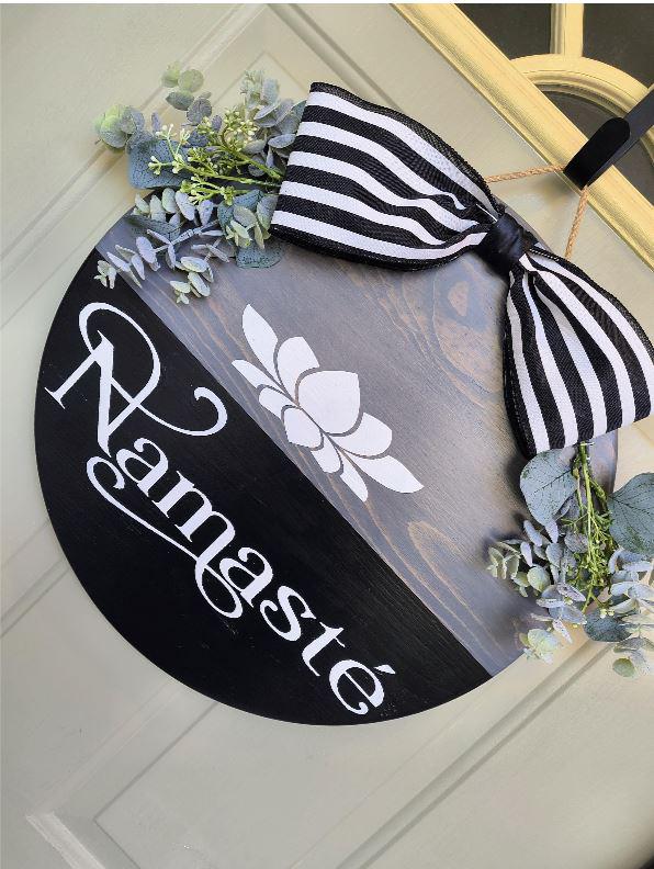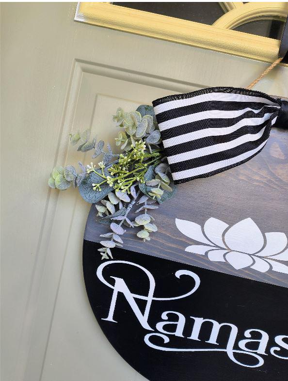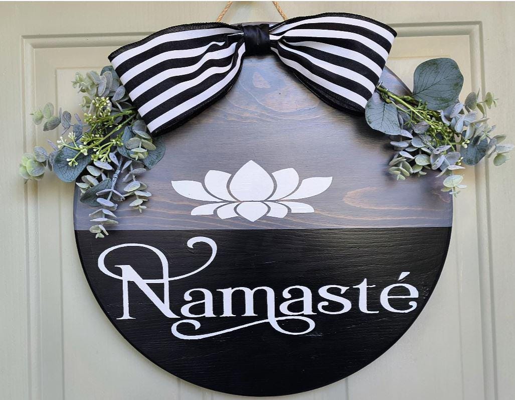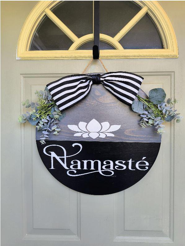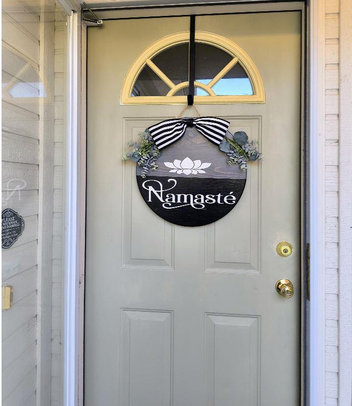 Welcome peace and calm to your space with this handmade “Namaste” door hanger.