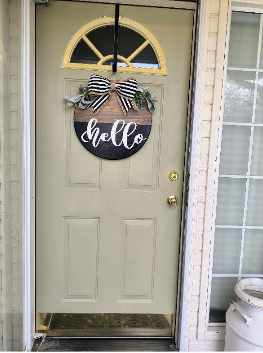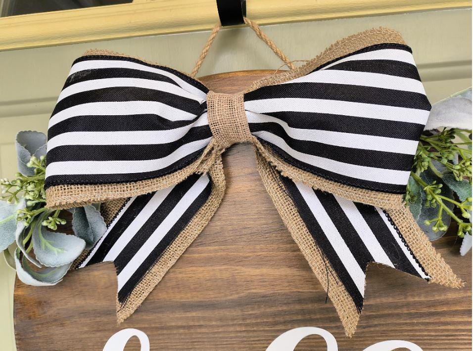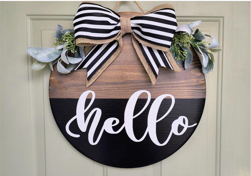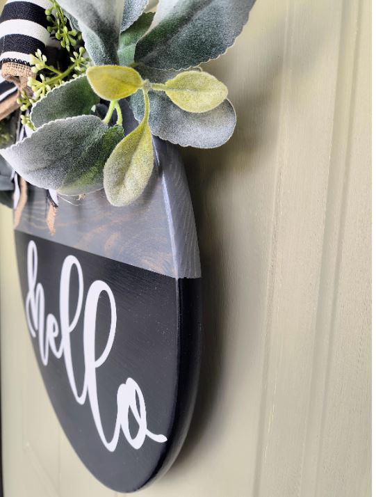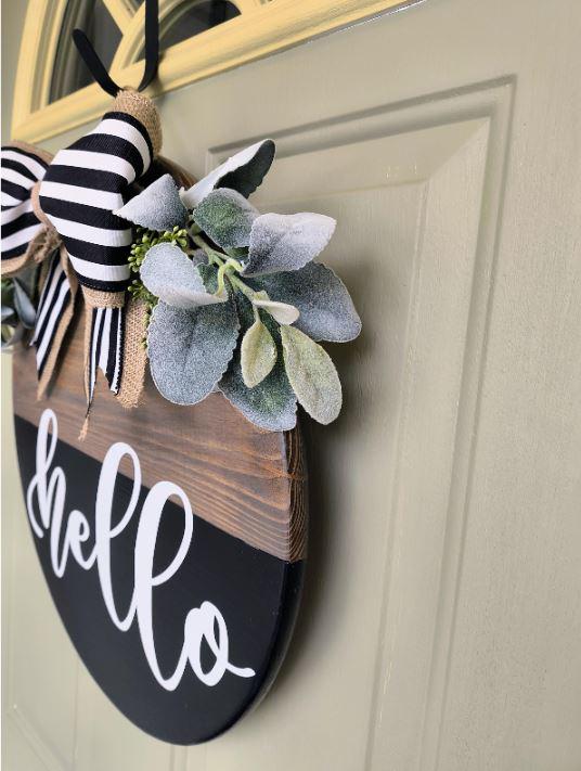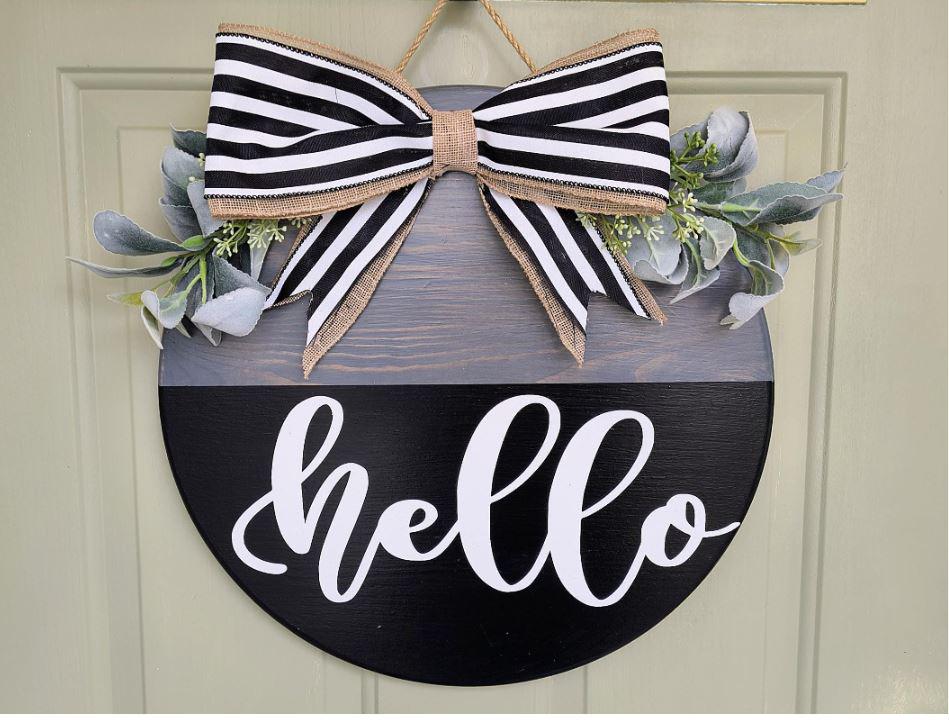 Say hello in style with this handmade 18-inch “Hello” wooden door hanger, the perfect way to welcome guests all year long. This piece features a trendy black-and-natural wood color block design, accented with a bold black-and-white striped bow and soft faux greenery for a fresh farmhouse-meets-modern look.