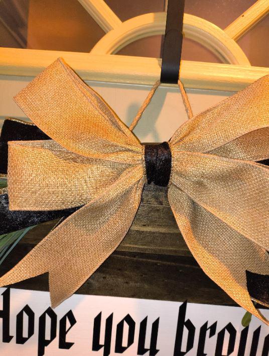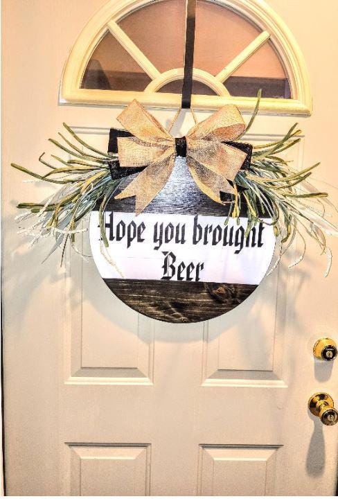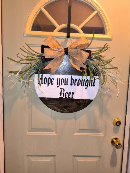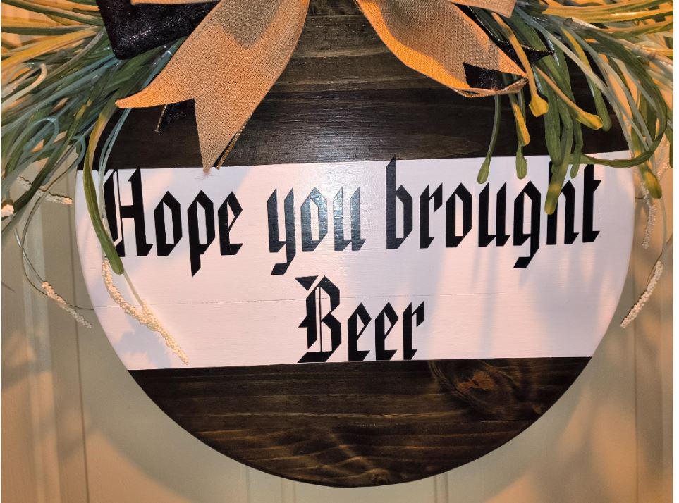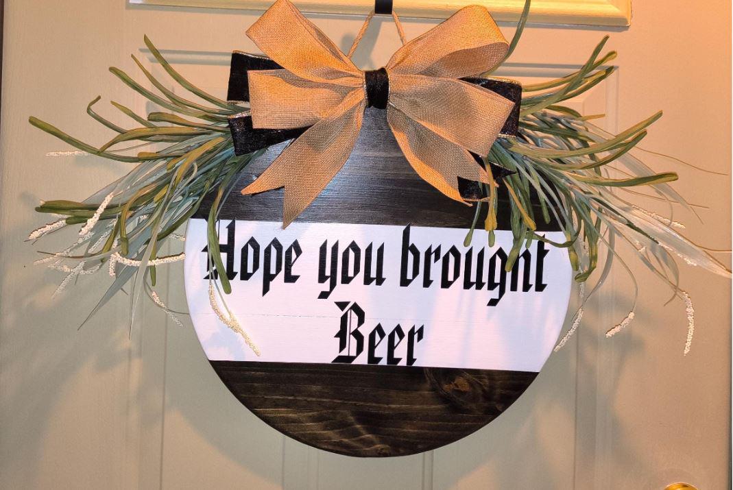 🍻 Got beer? This handmade 18-inch wooden door hanger is the perfect way to welcome guests with a laugh! Featuring bold gothic lettering that reads “Hope You Brought Beer”, it’s accented with faux greenery and a rustic burlap bow — ready to hang and raise eyebrows.