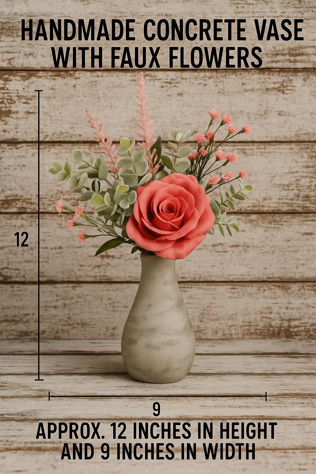 Handmade Concrete Vase with Faux Flowers – Rustic Table Decor – 12" Tall – Custom Floral Arrangement – Gift for Her – Shelf or Entryway Accent