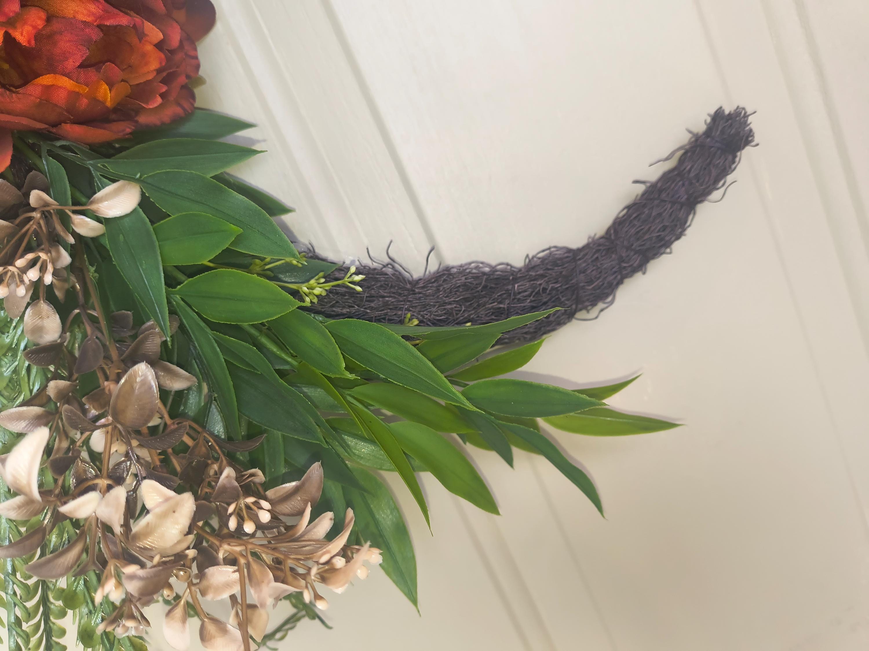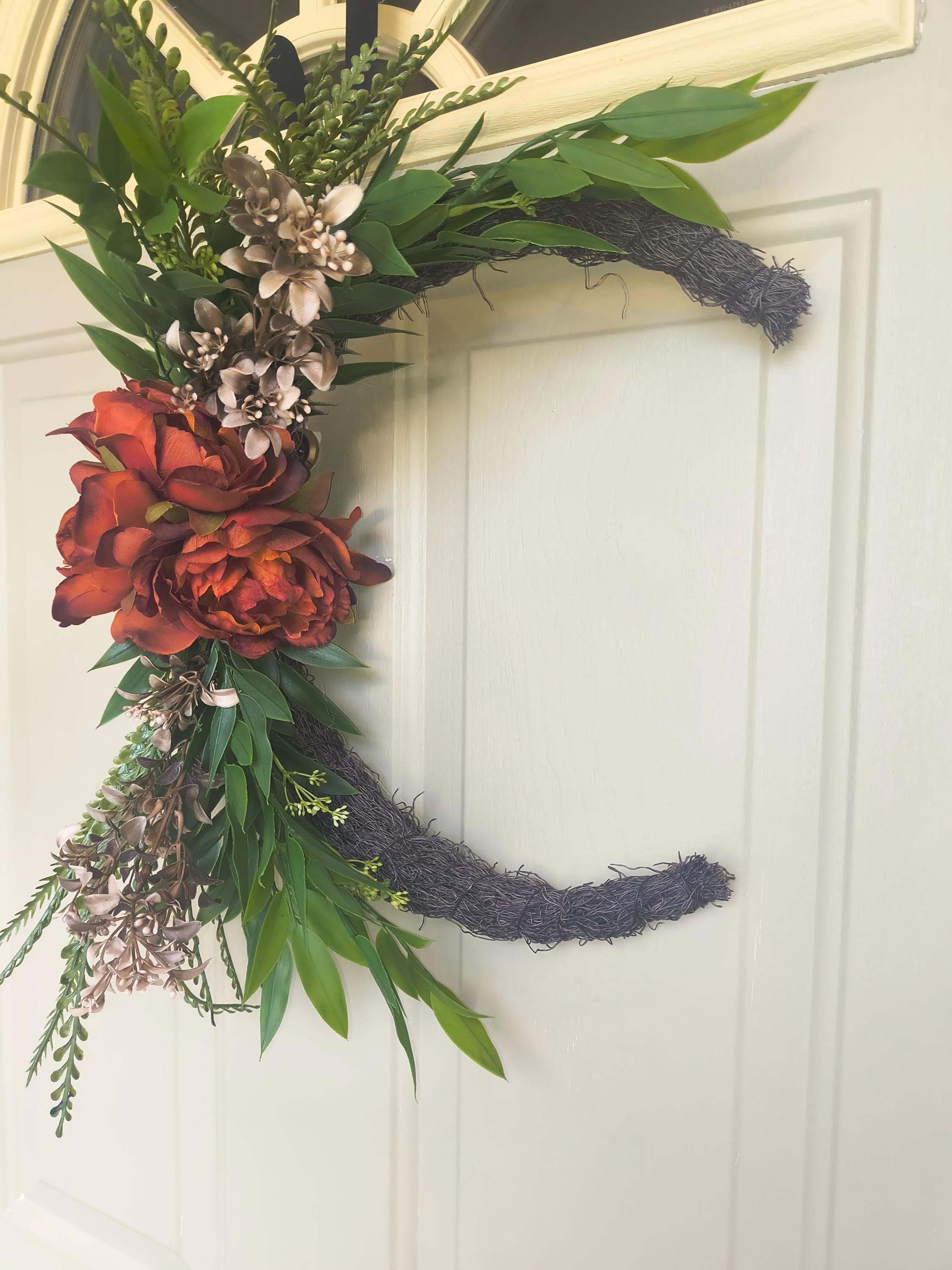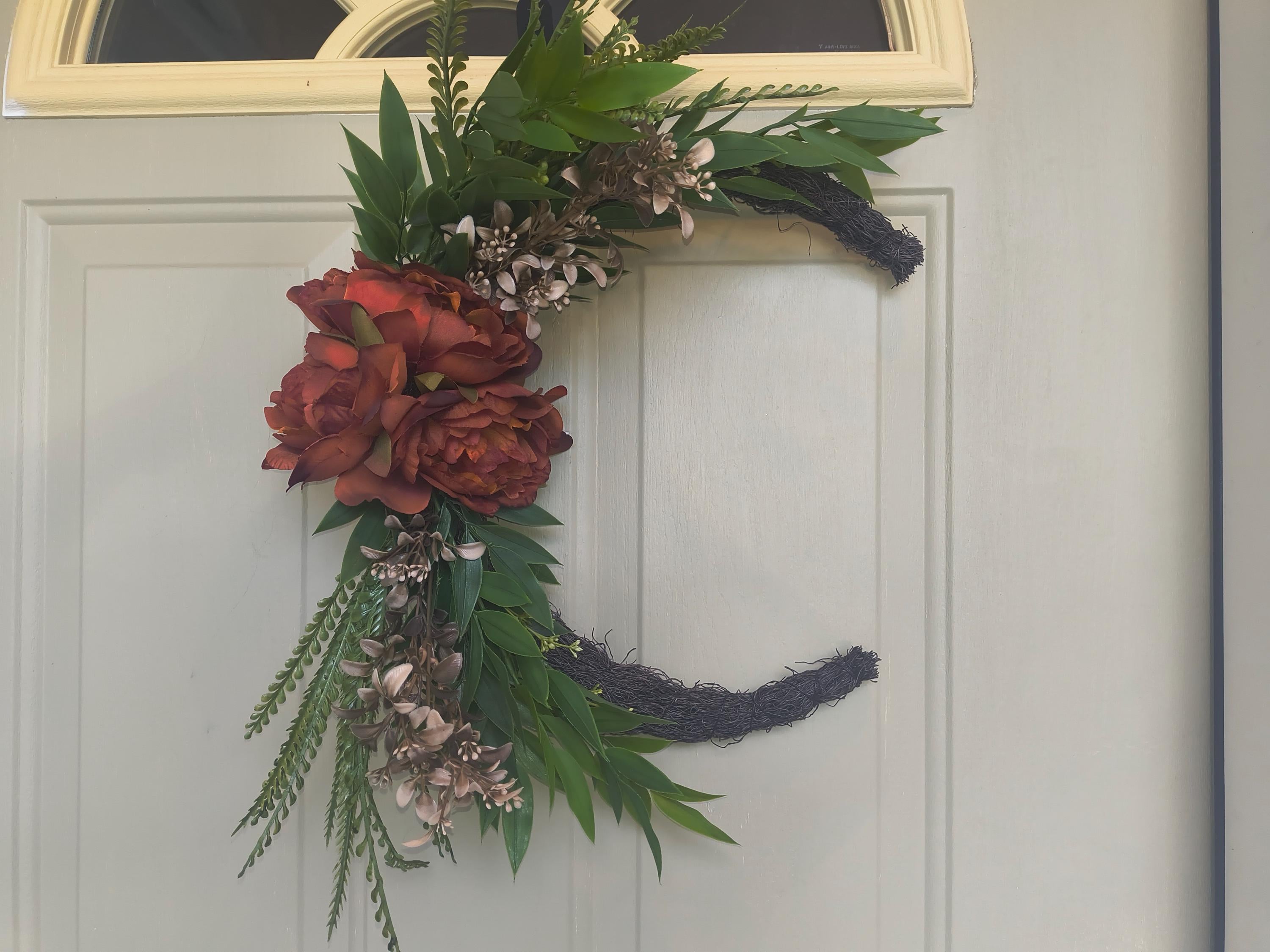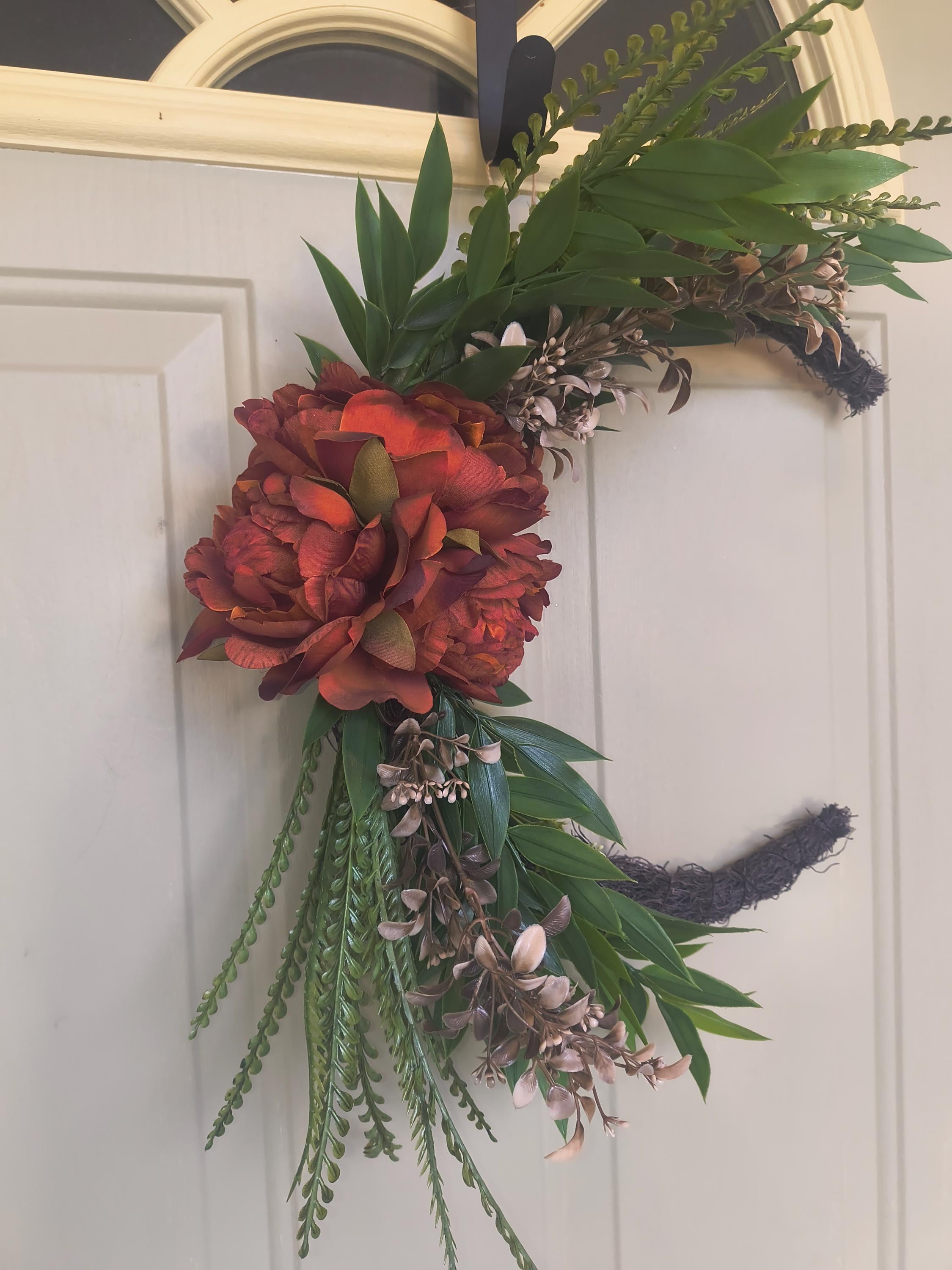 🌙 Add a touch of celestial magic to your space with this handcrafted crescent moon wreath, adorned with deep burnt orange roses, brown and green foliage and rustic grapevine. Perfect for moon lovers, witches, and lovers of gothic or celestial decor, this wreath makes a stunning statement on any door, wall, or altar.