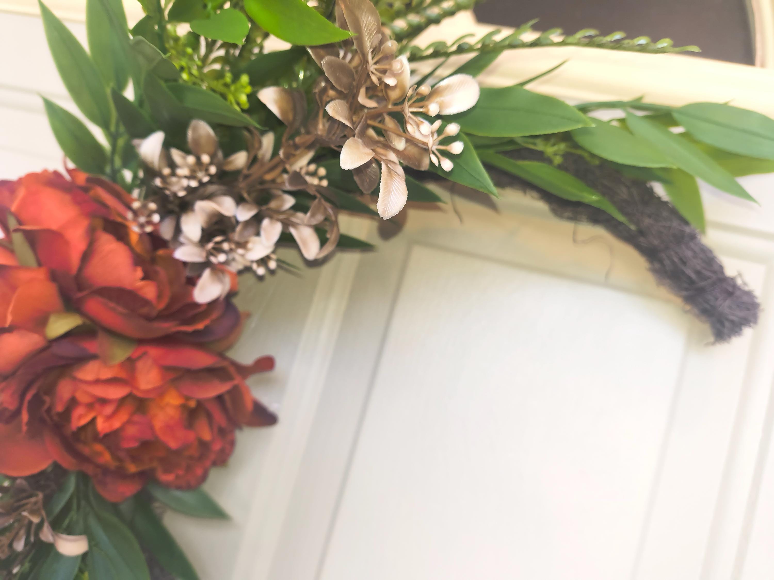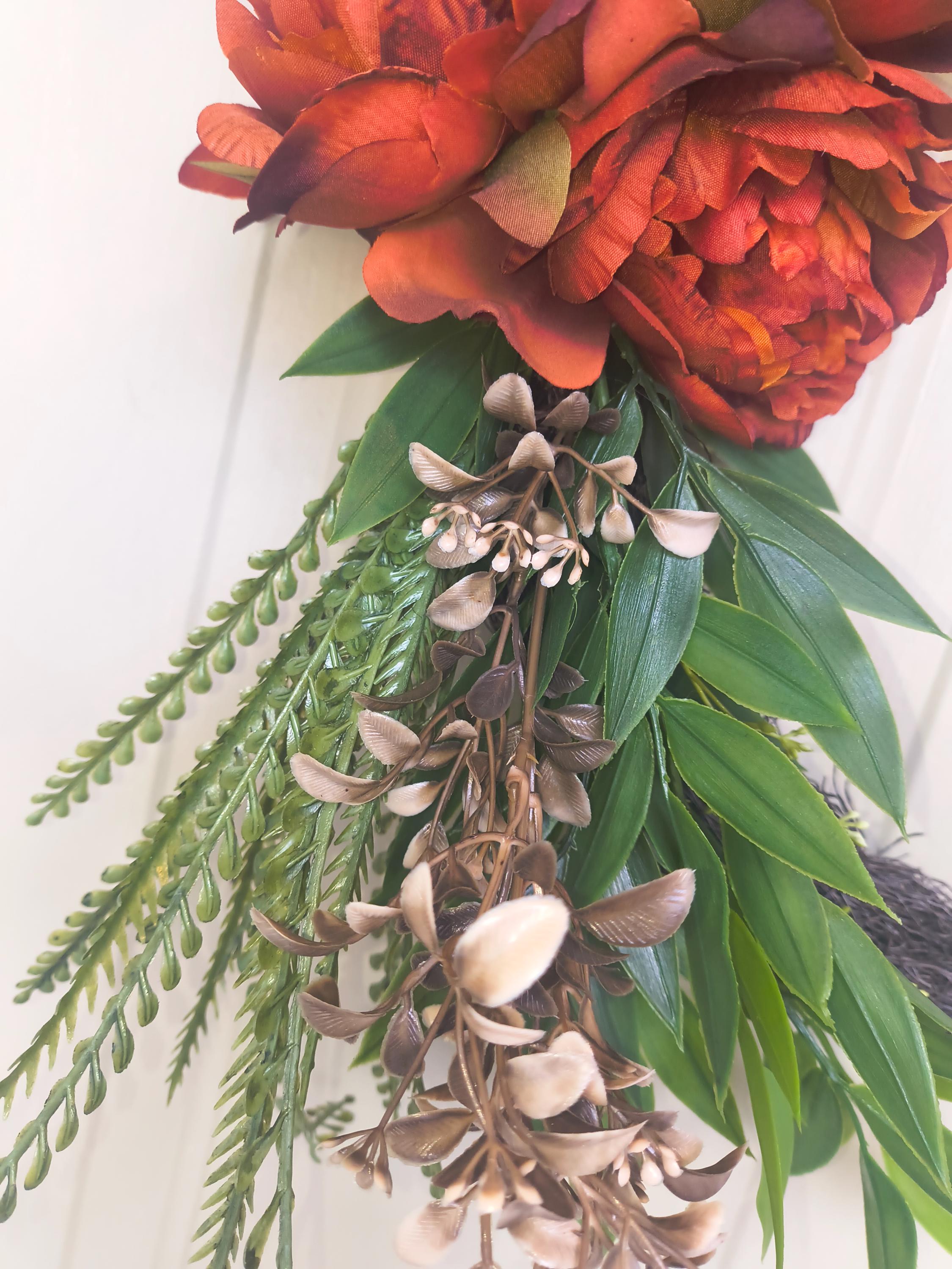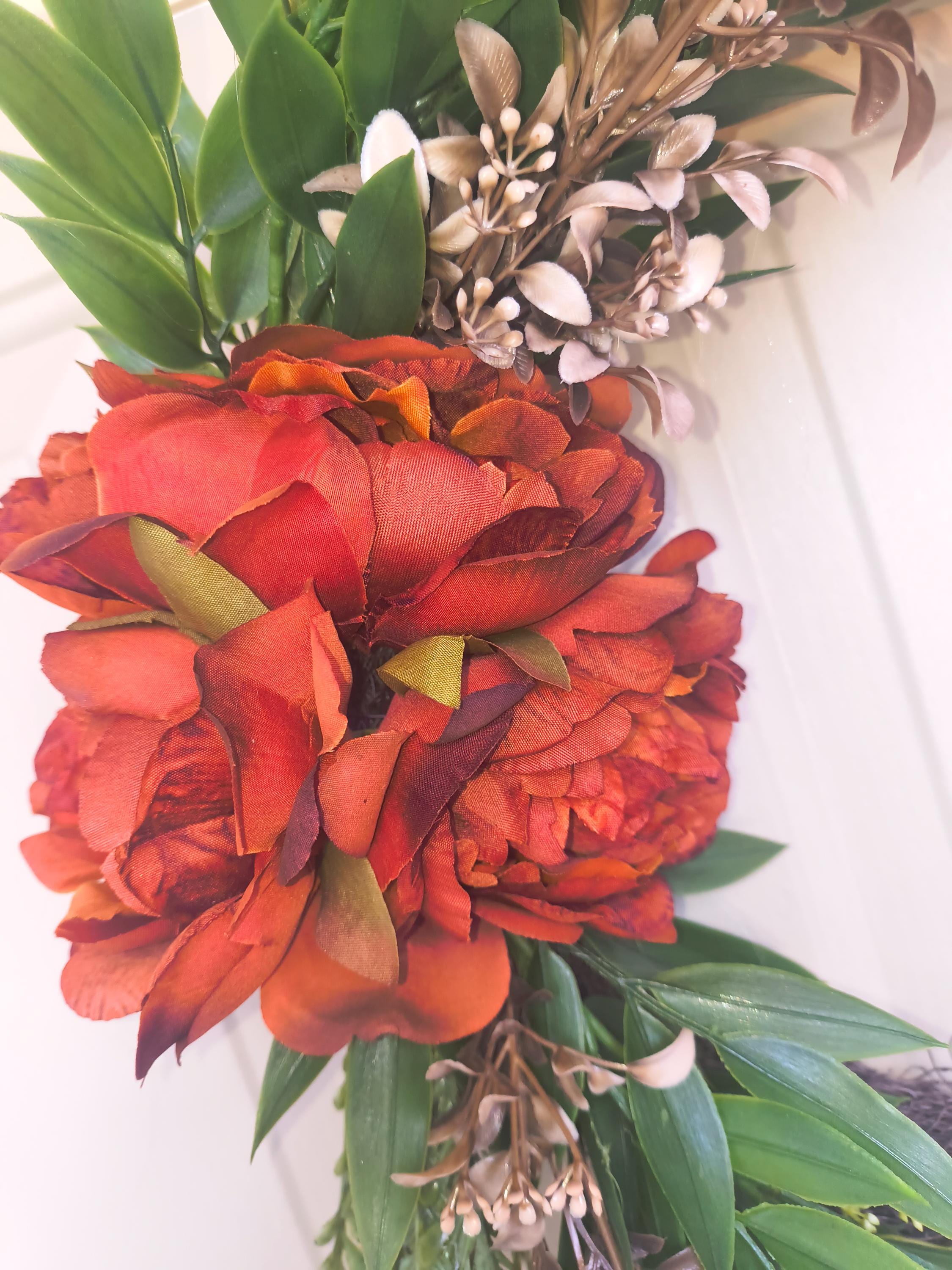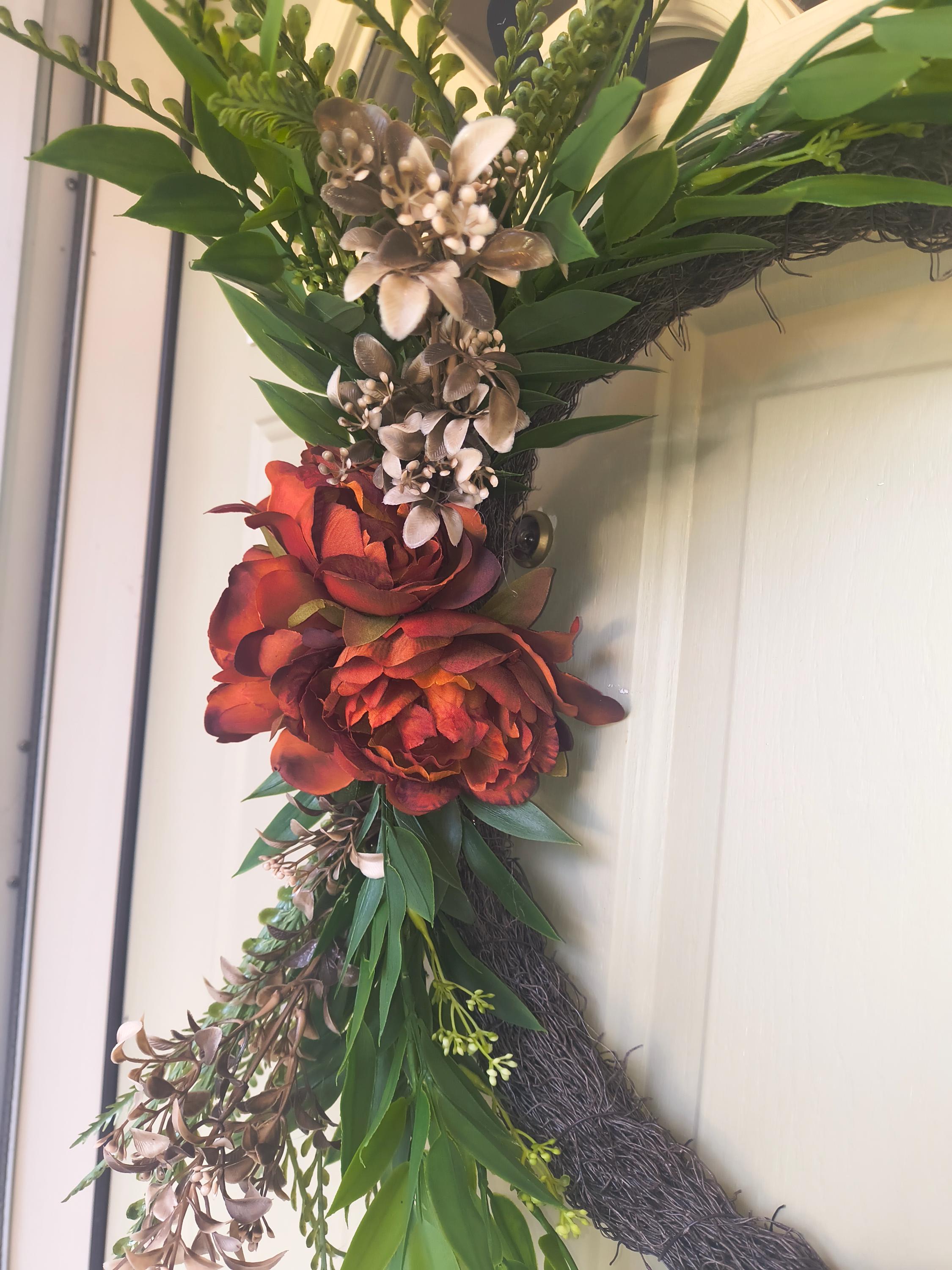 🌙 Add a touch of celestial magic to your space with this handcrafted crescent moon wreath, adorned with deep burnt orange roses, brown and green foliage and rustic grapevine. Perfect for moon lovers, witches, and lovers of gothic or celestial decor, this wreath makes a stunning statement on any door, wall, or altar.