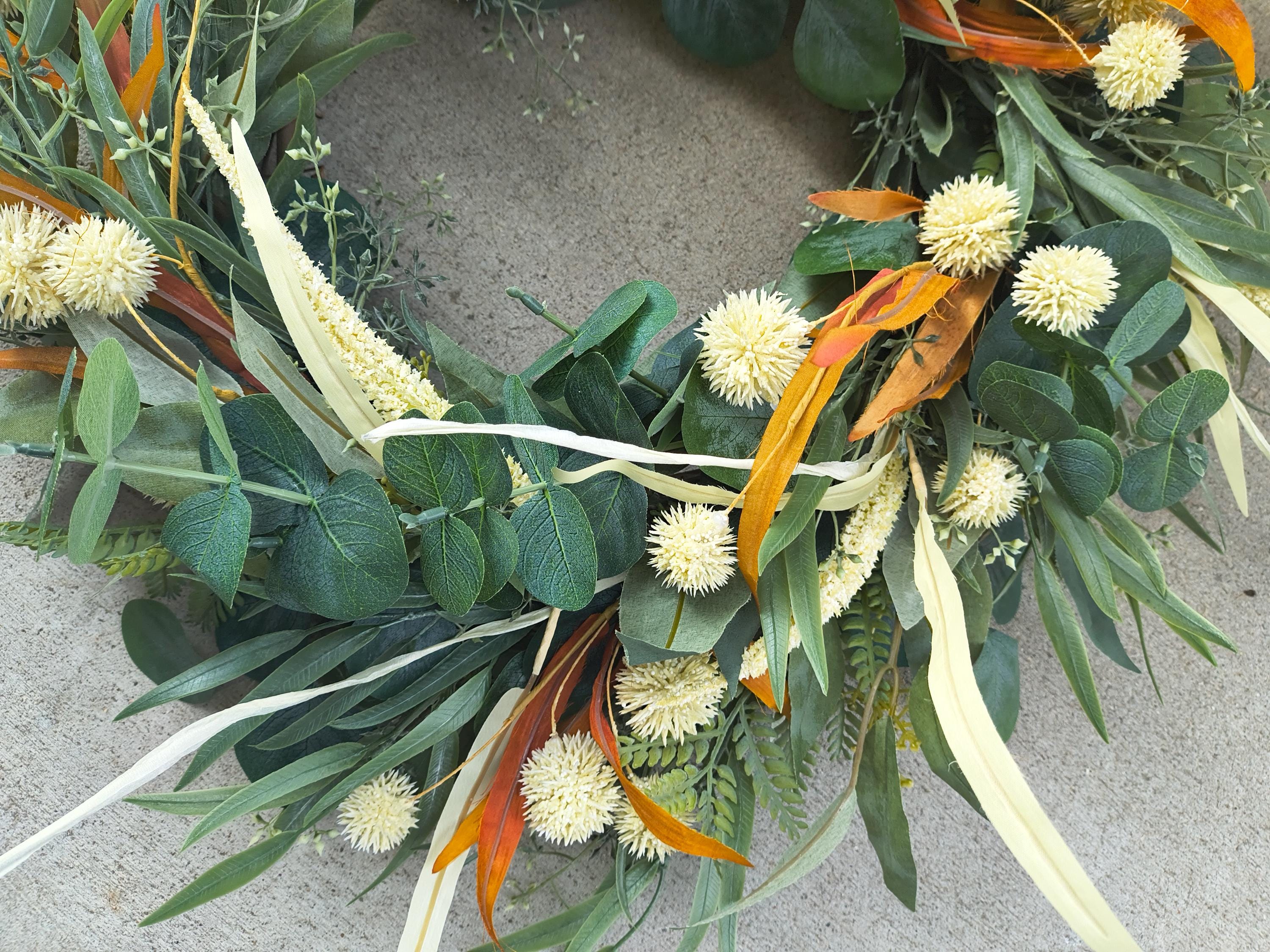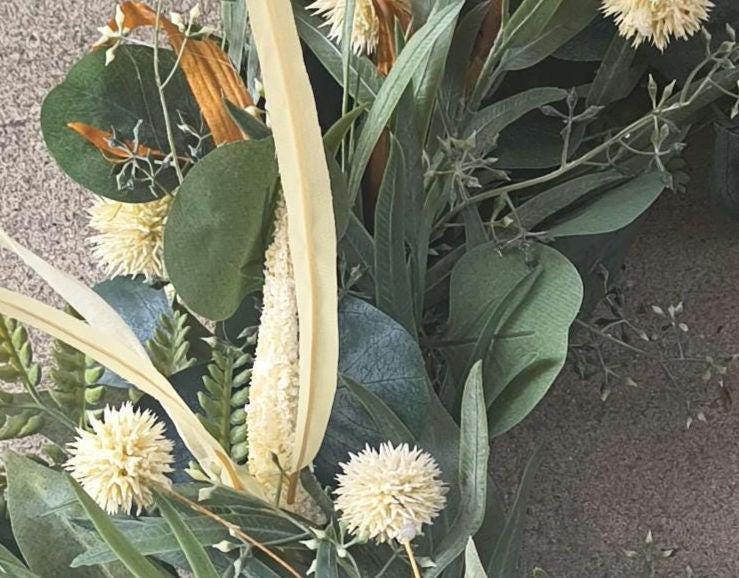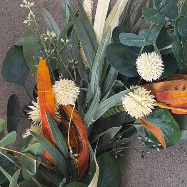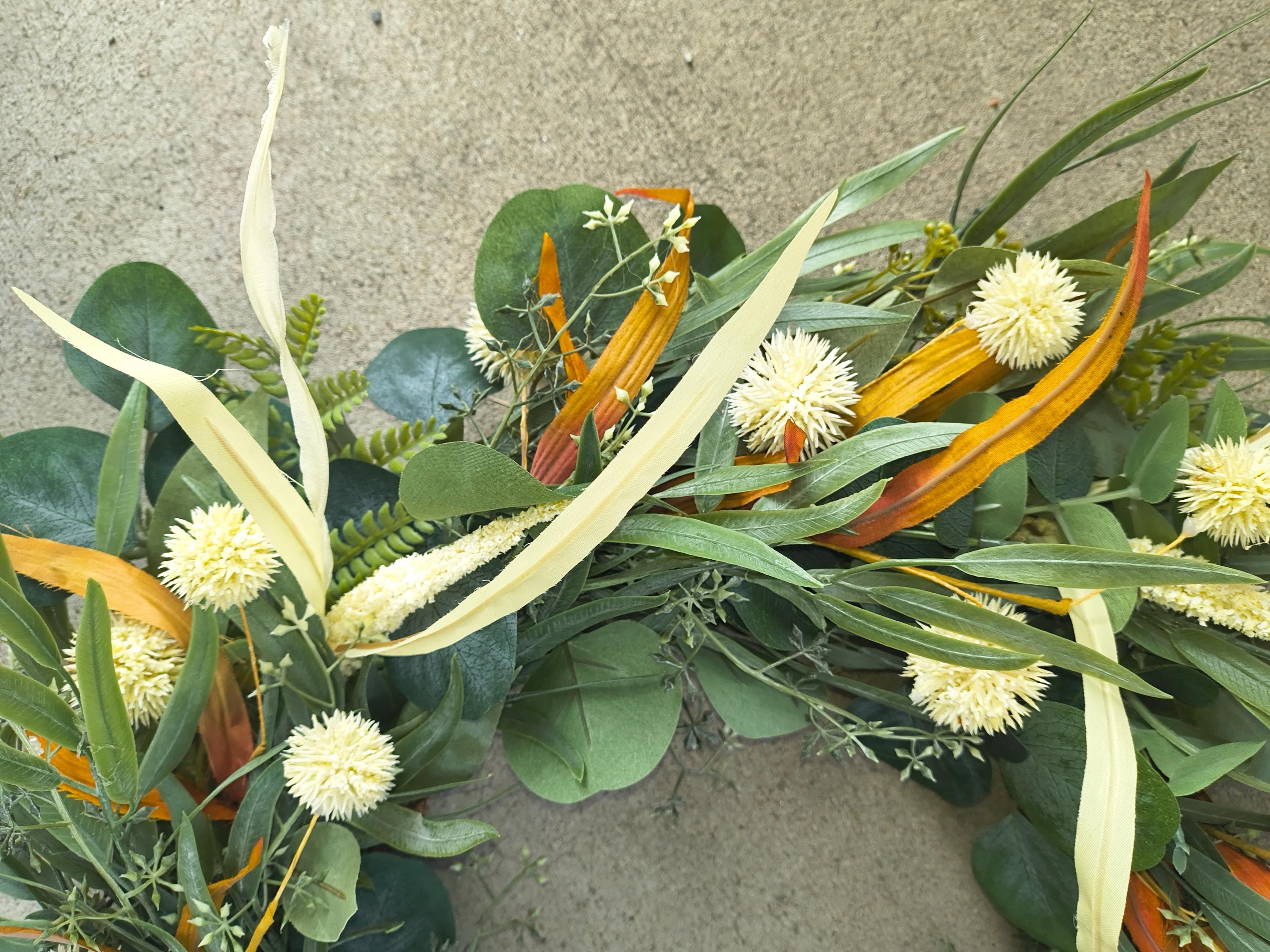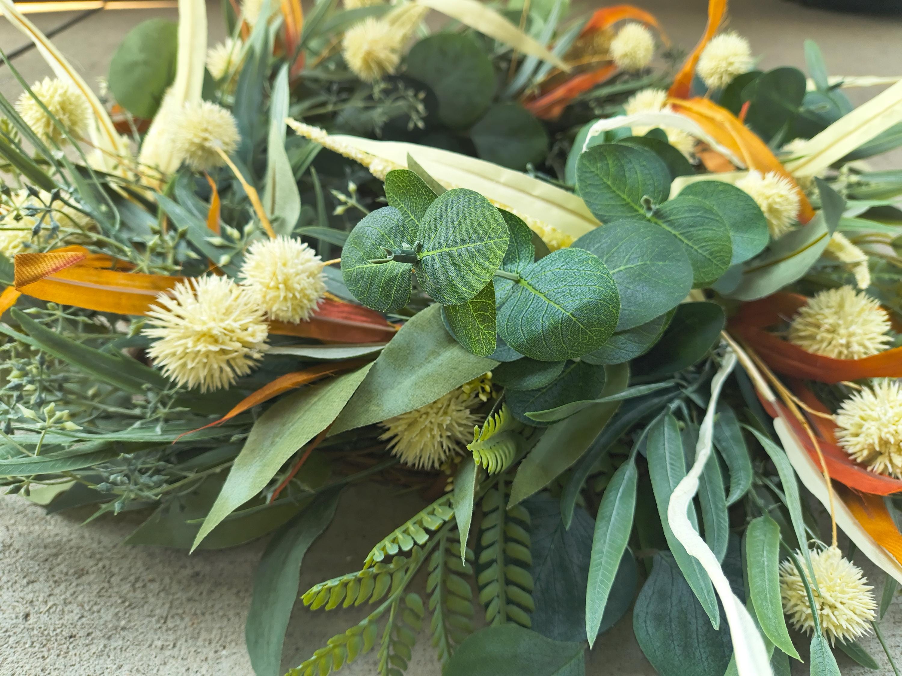 • Faux eucalyptus, ferns, and soft fall filler greenery