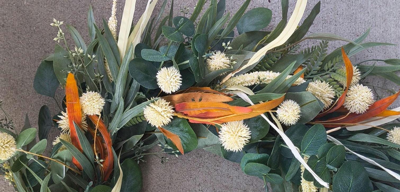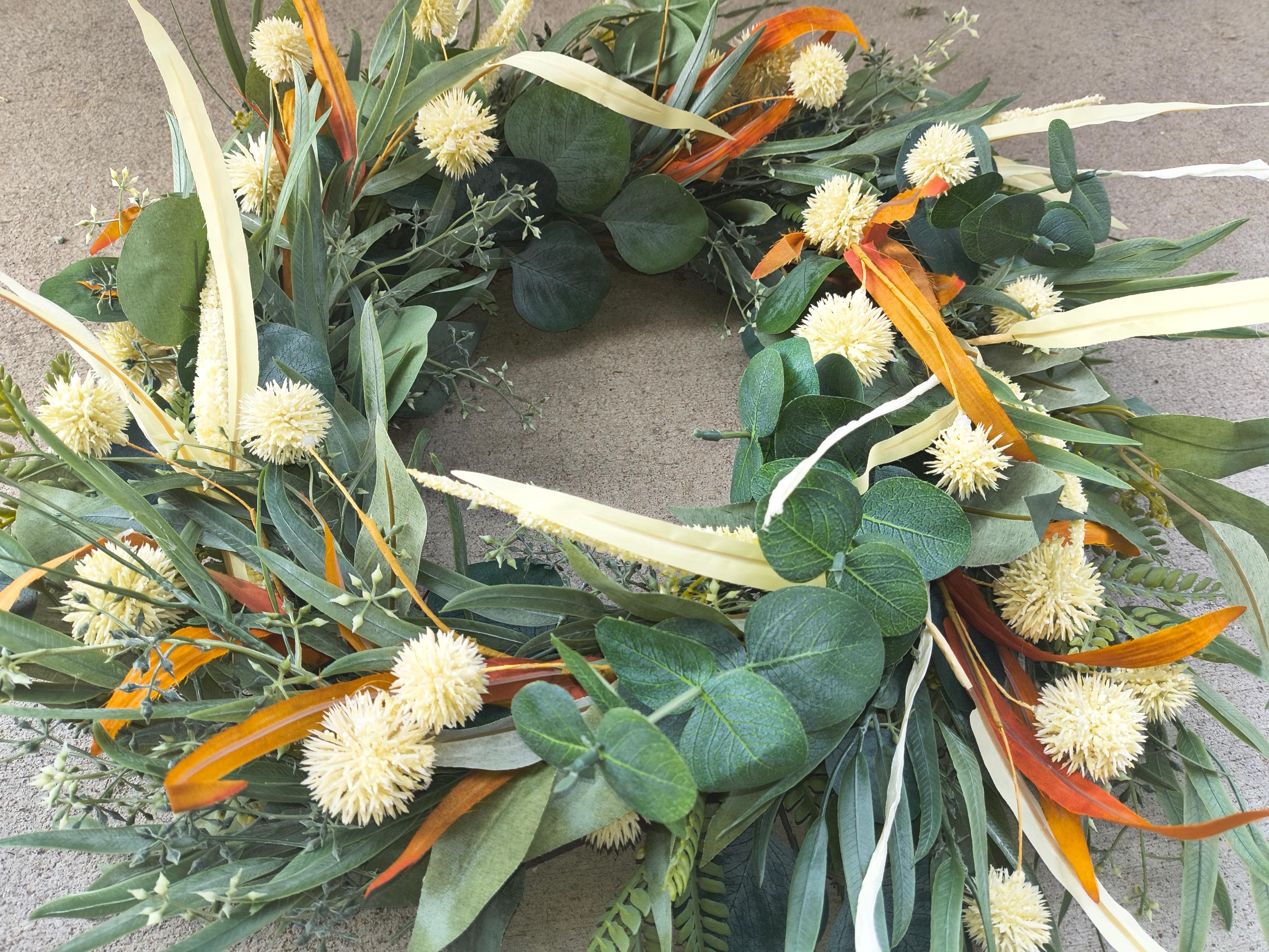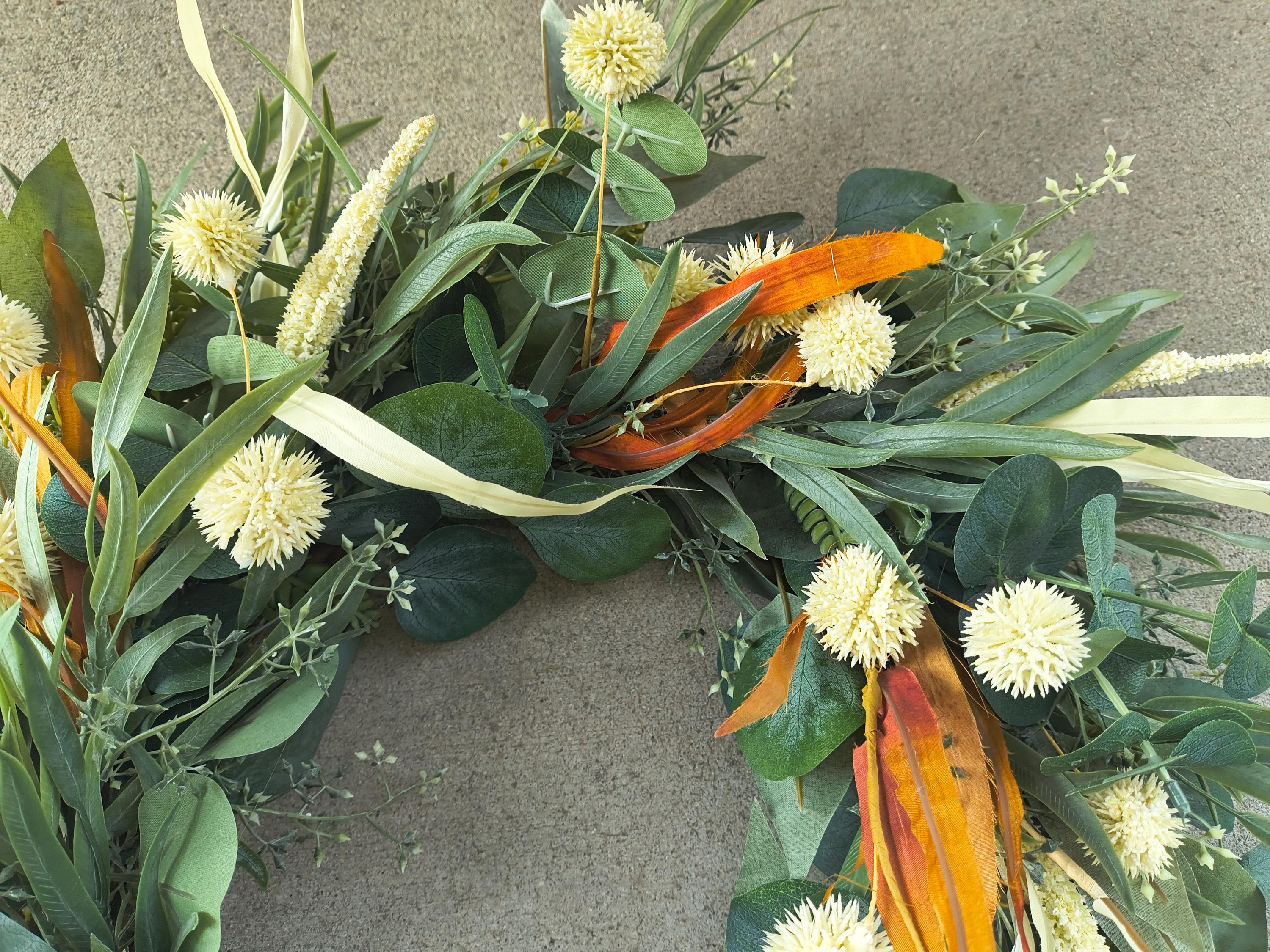• Faux eucalyptus, ferns, and soft fall filler greenery