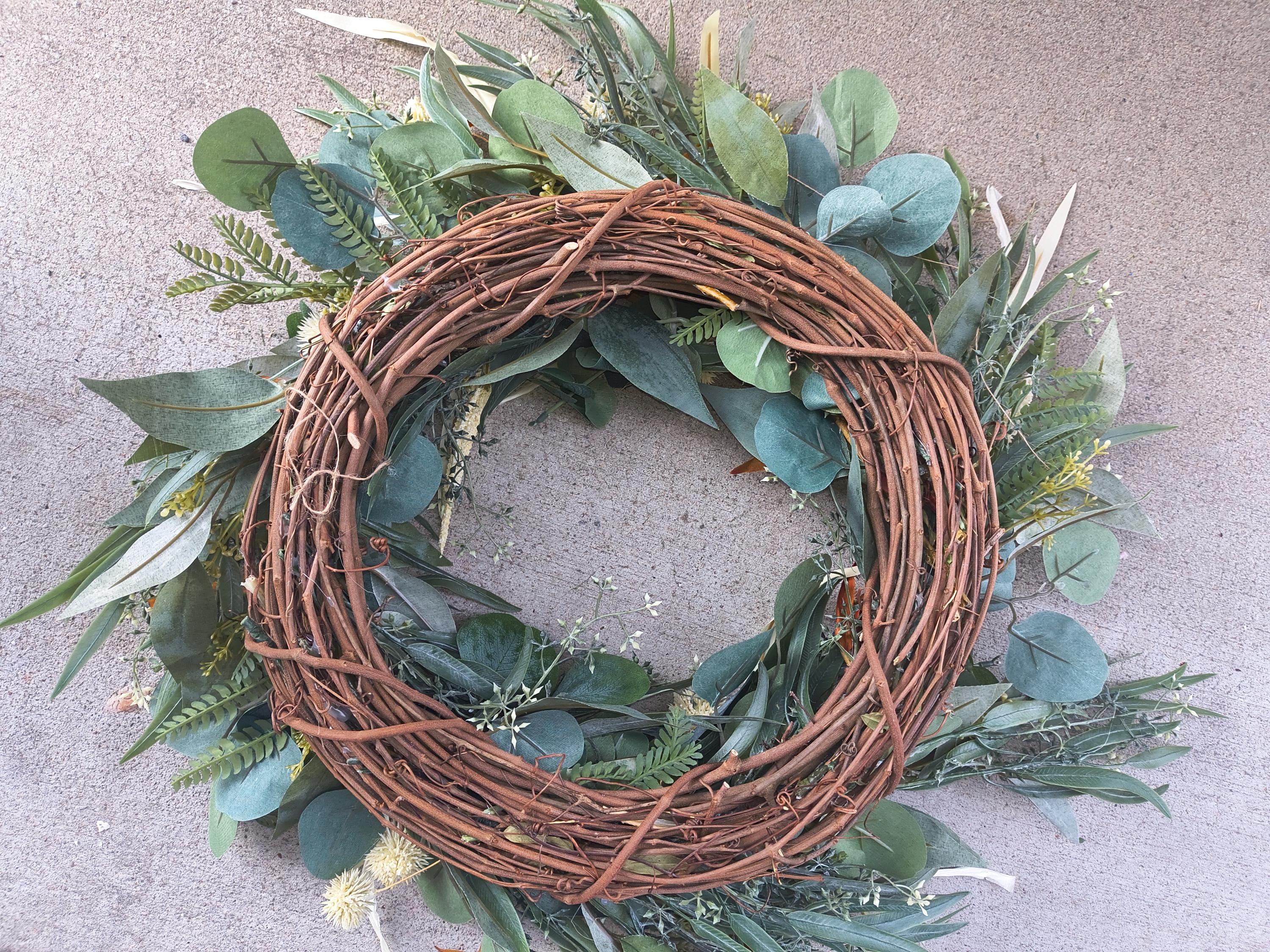 🌿 Bring a touch of natural elegance to your home with this 23” rustic faux greenery wreath, featuring a full mix of wild eucalyptus, fern, and natural foliage for an effortlessly organic look.