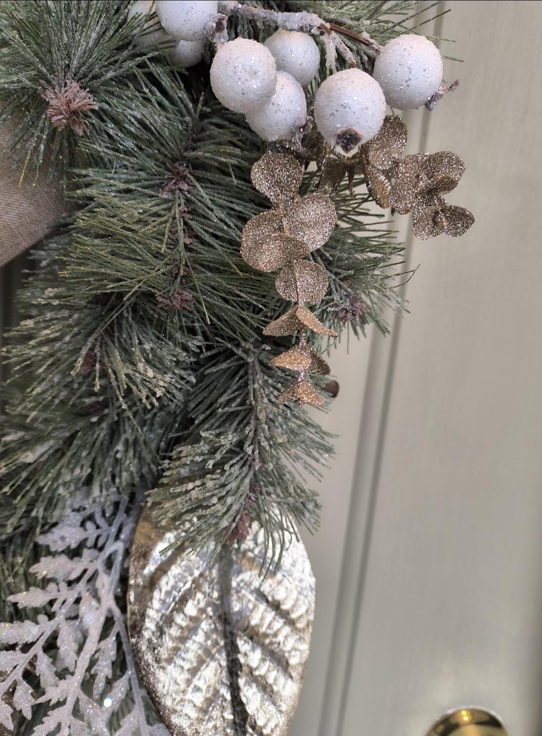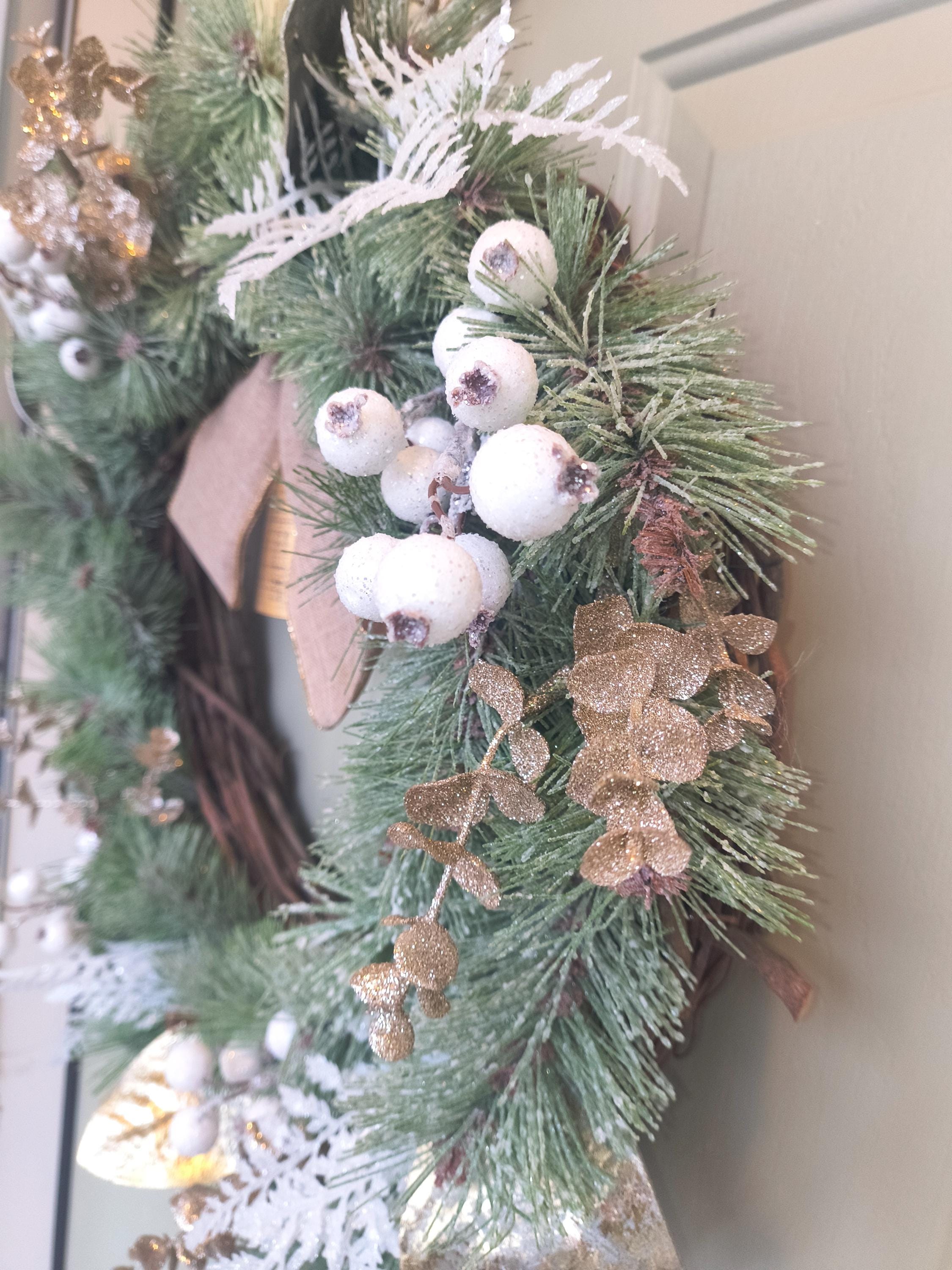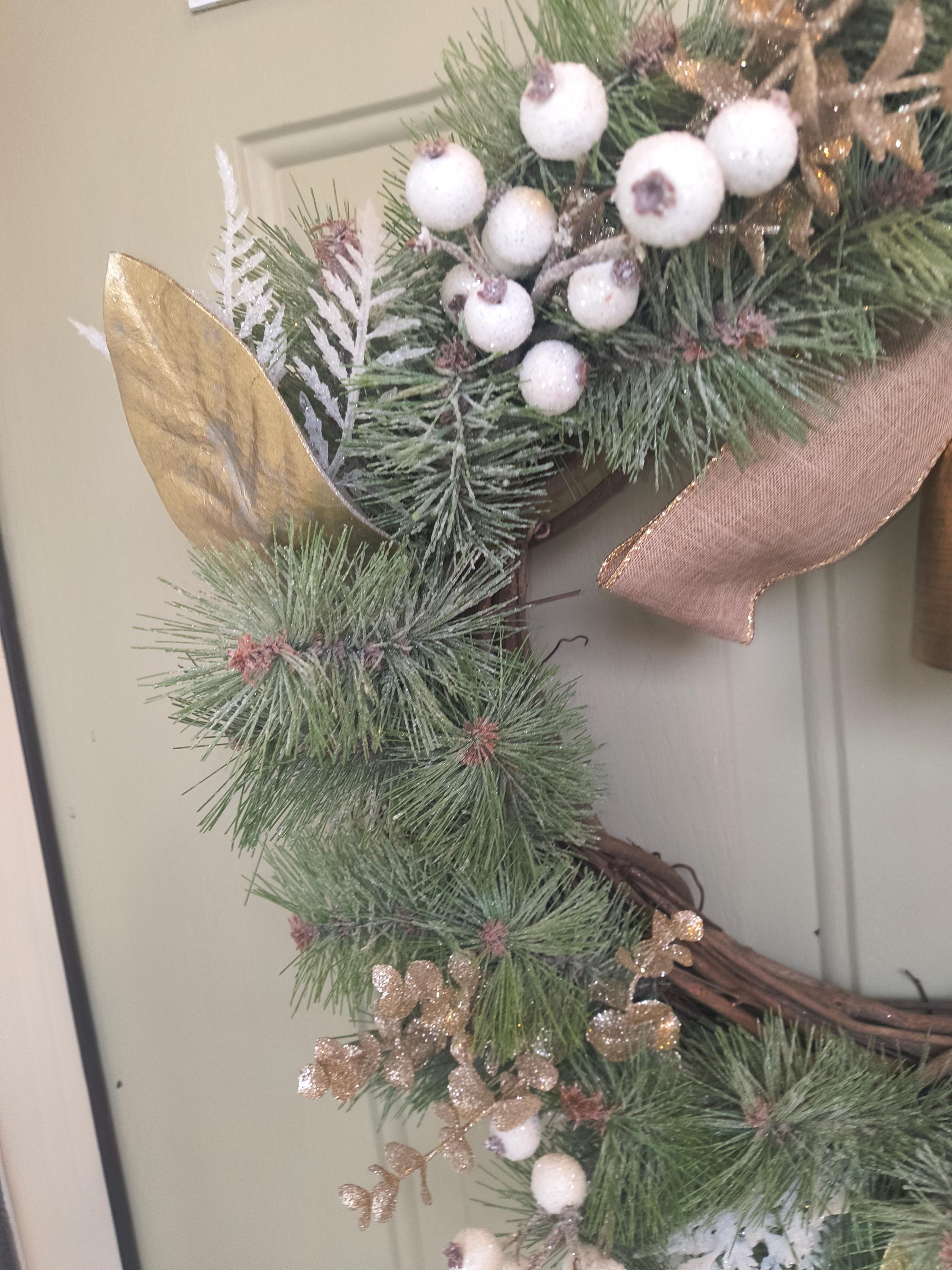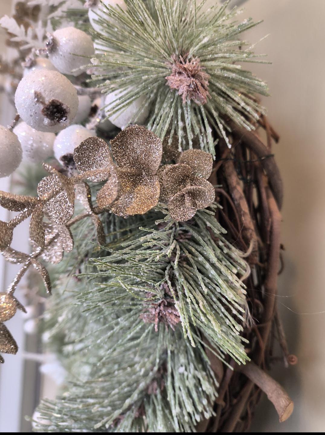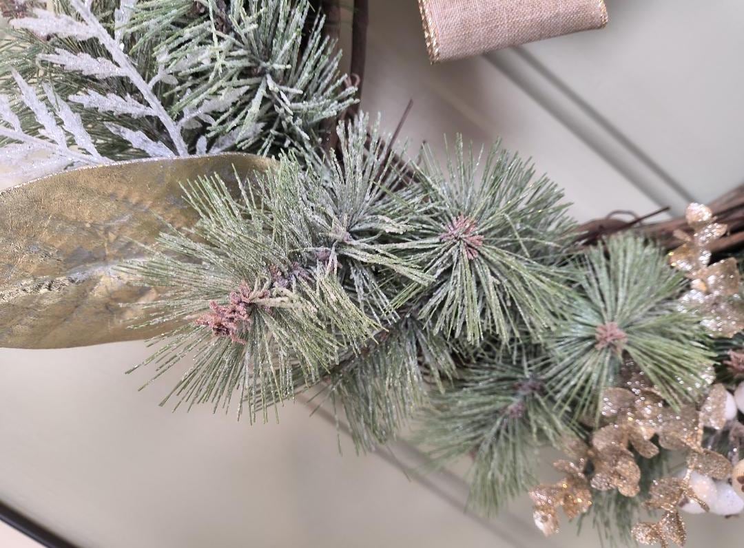 🌿 Bring a touch of natural elegance to your home this winter with this 23” rustic Christmas wreath, featuring a full mix of faux snowy pine, gold magnolia leaves, fern and berries