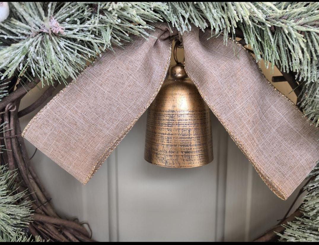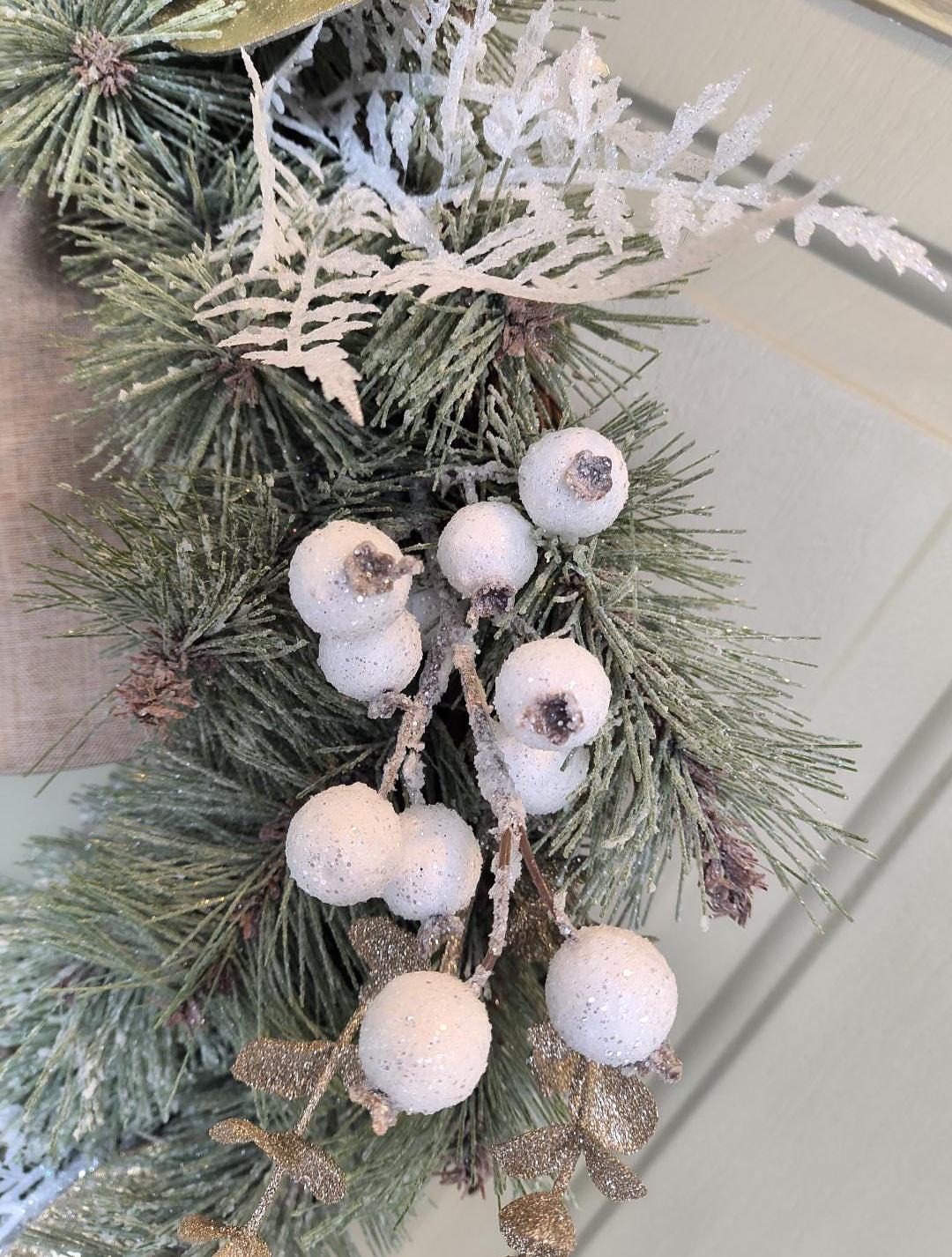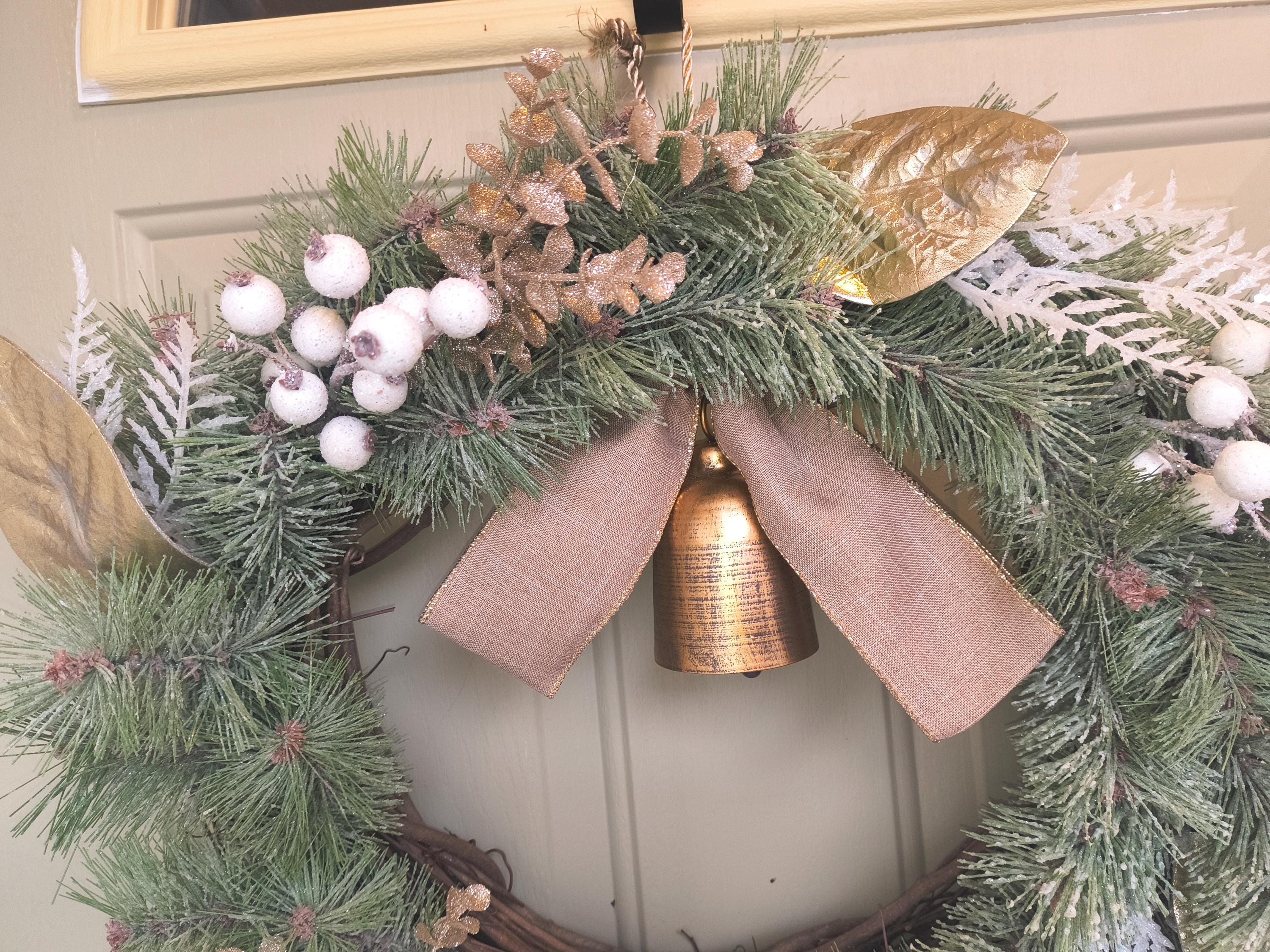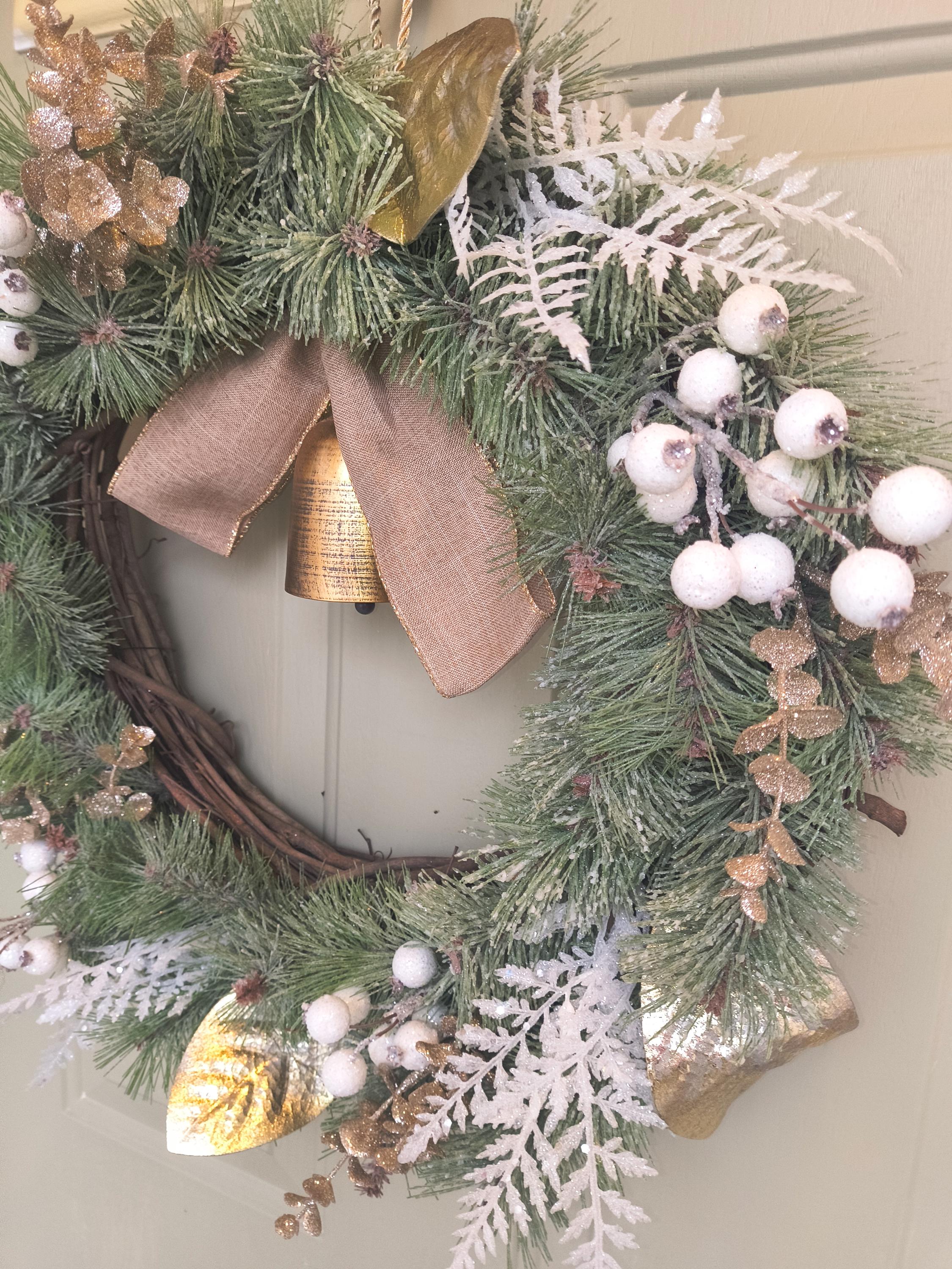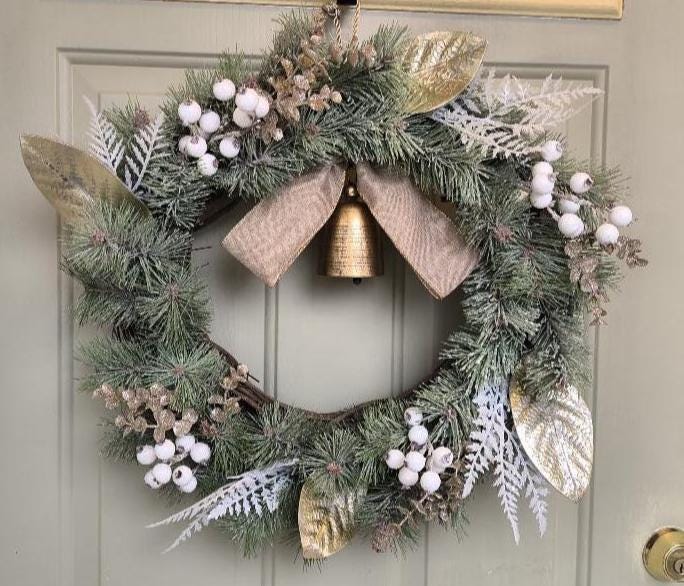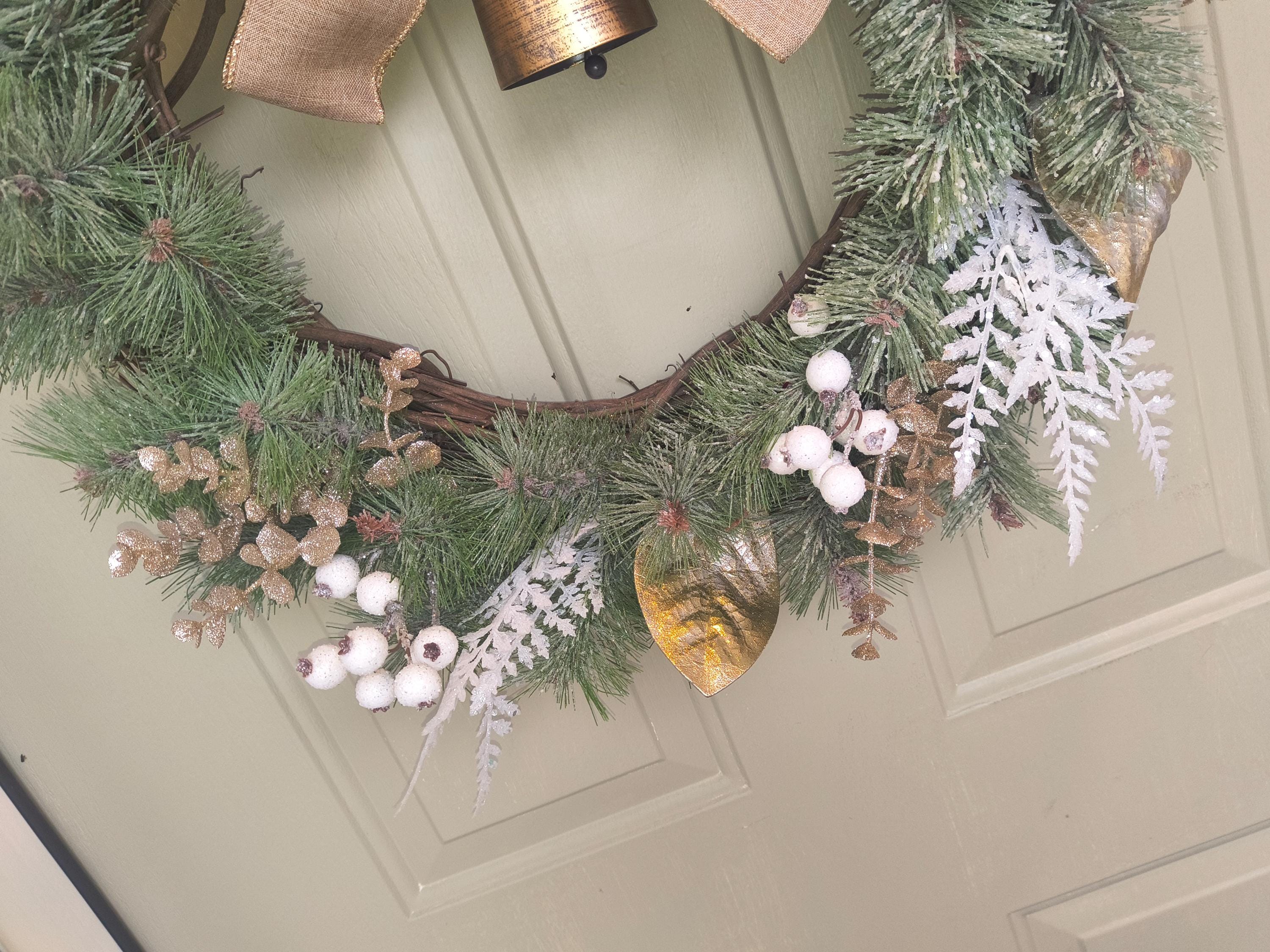 🌿 Bring a touch of natural elegance to your home this winter with this 23” rustic Christmas wreath, featuring a full mix of faux snowy pine, gold magnolia leaves, fern and berries