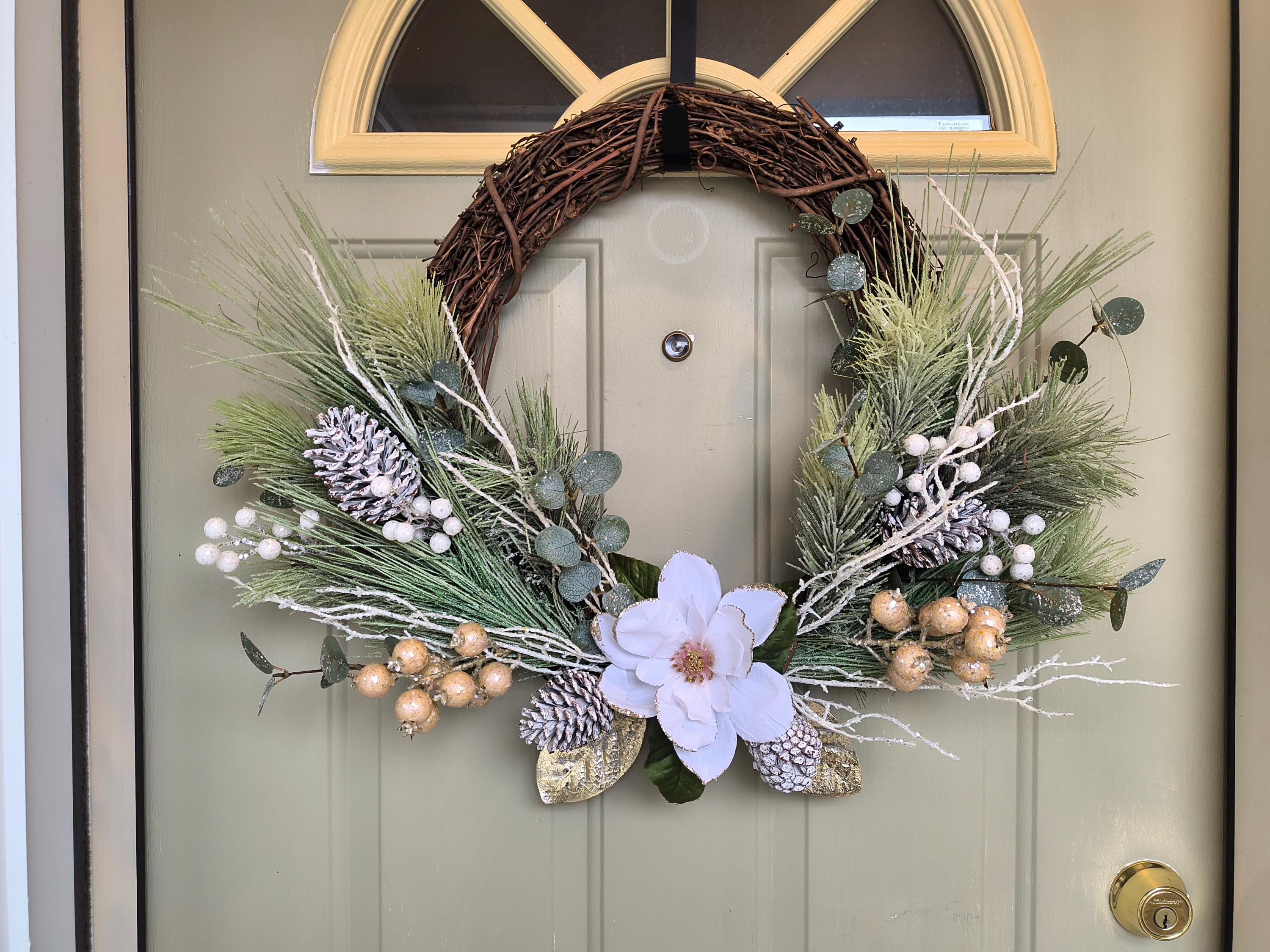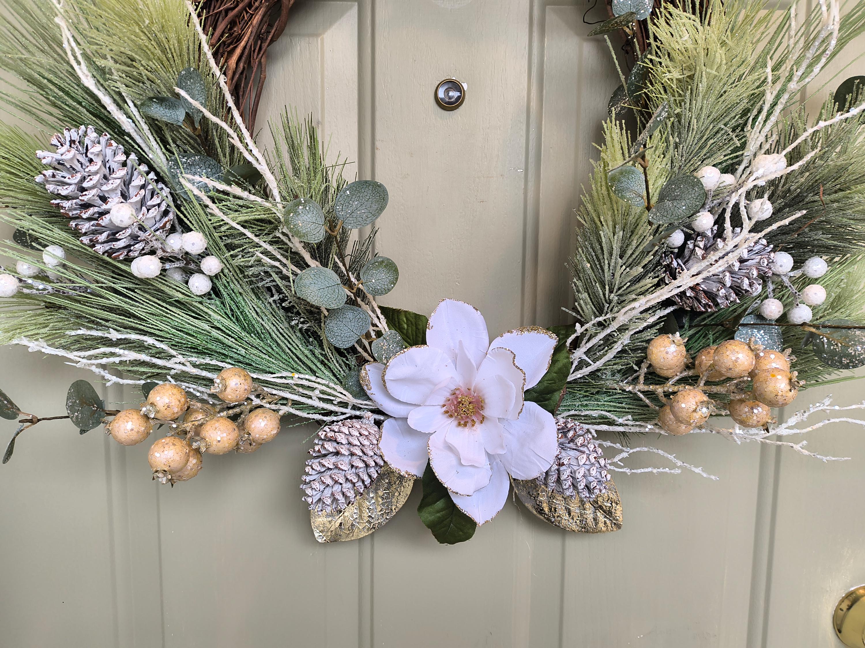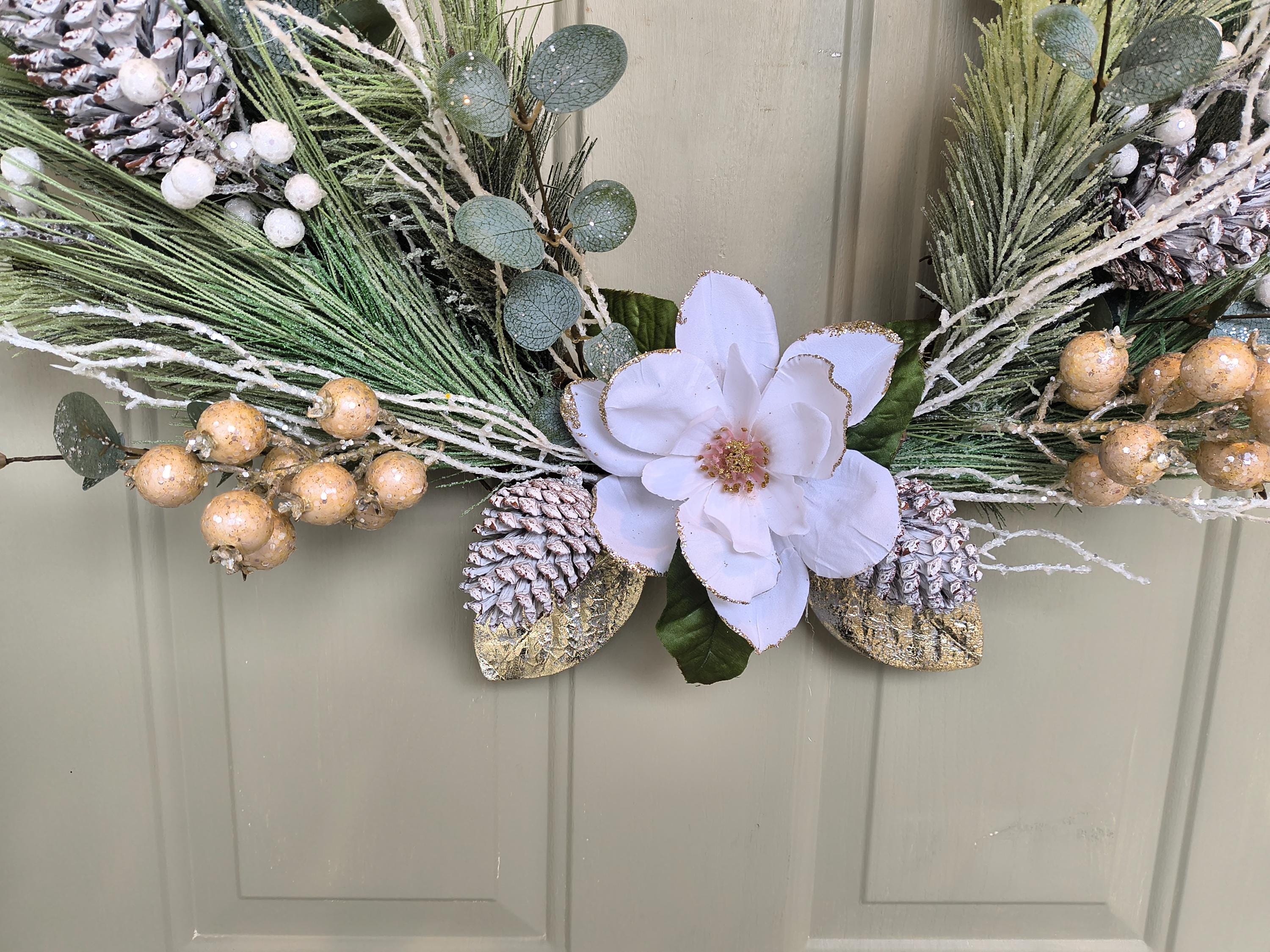 • Faux Pine, berries, gold and white accents