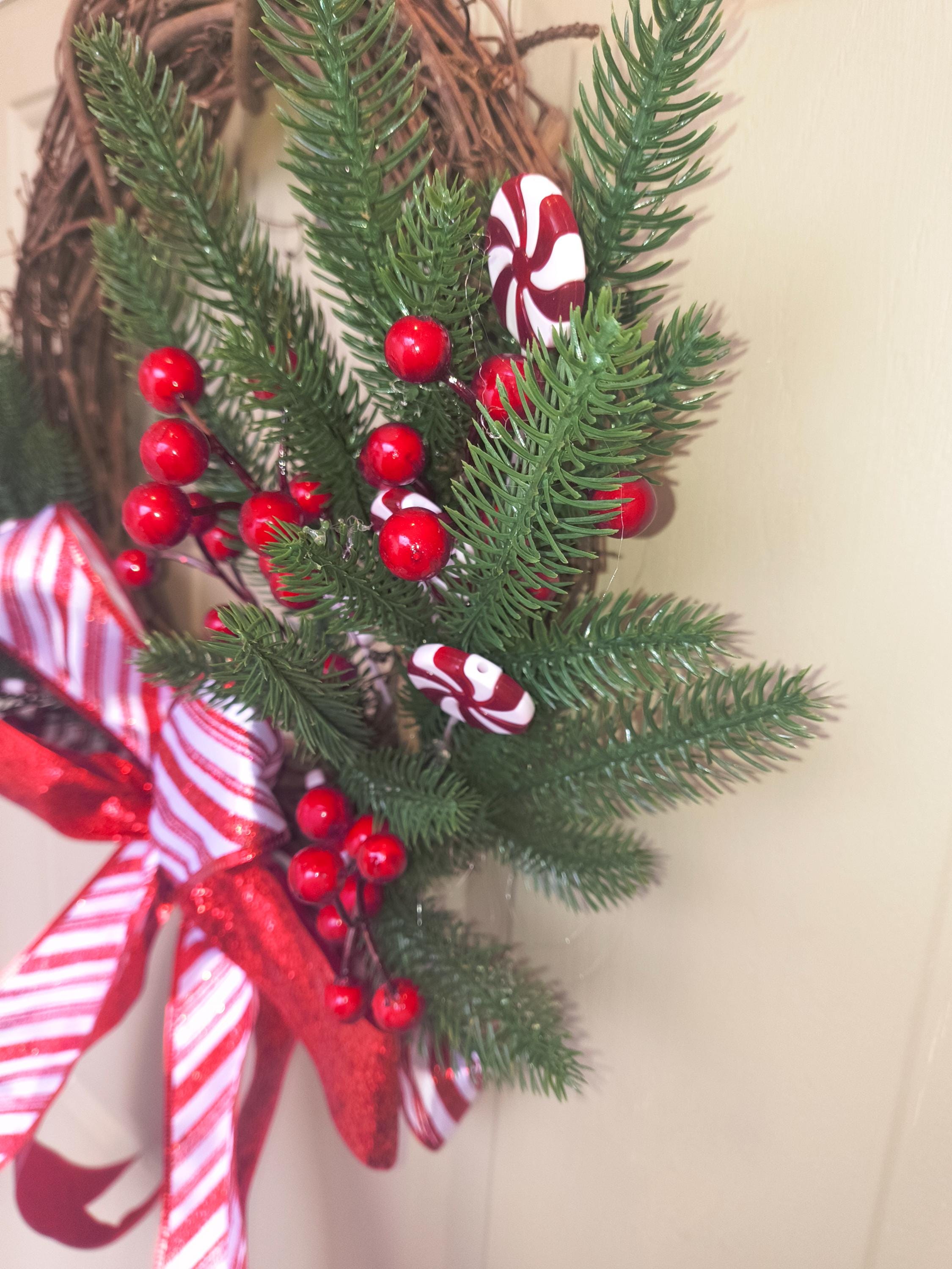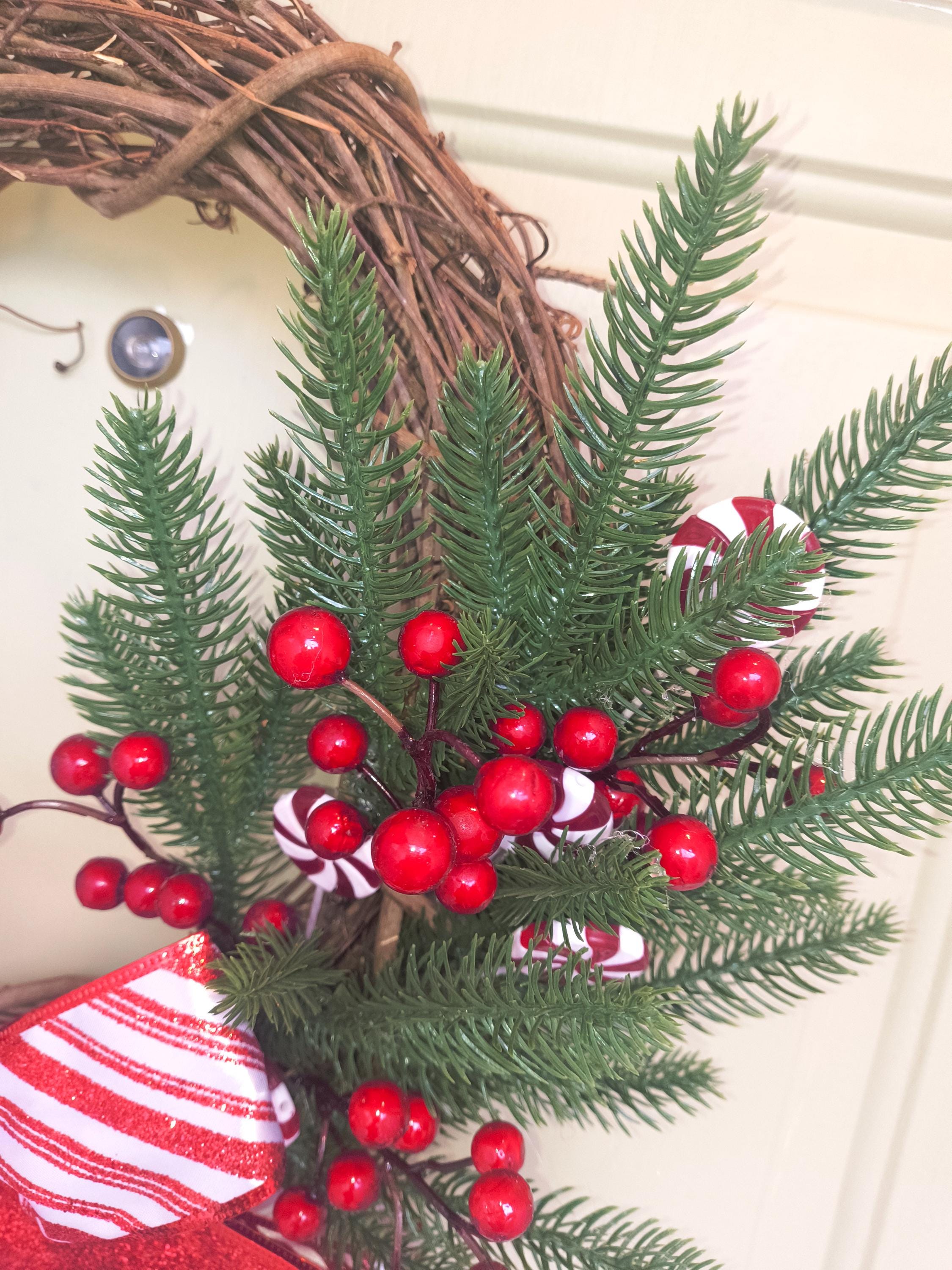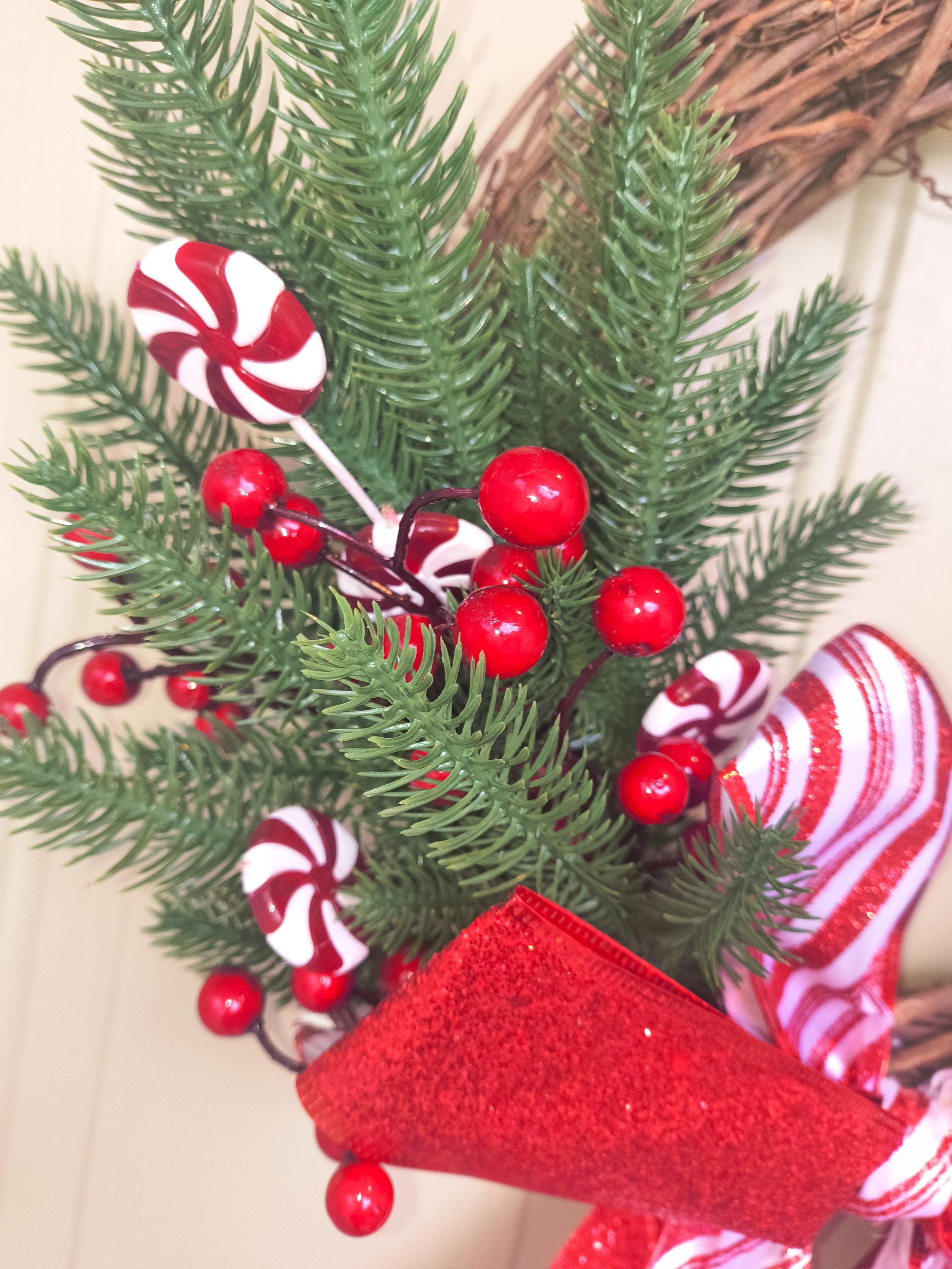 • Faux Pine, Berries, candy cane suckers and candy cane striped bow