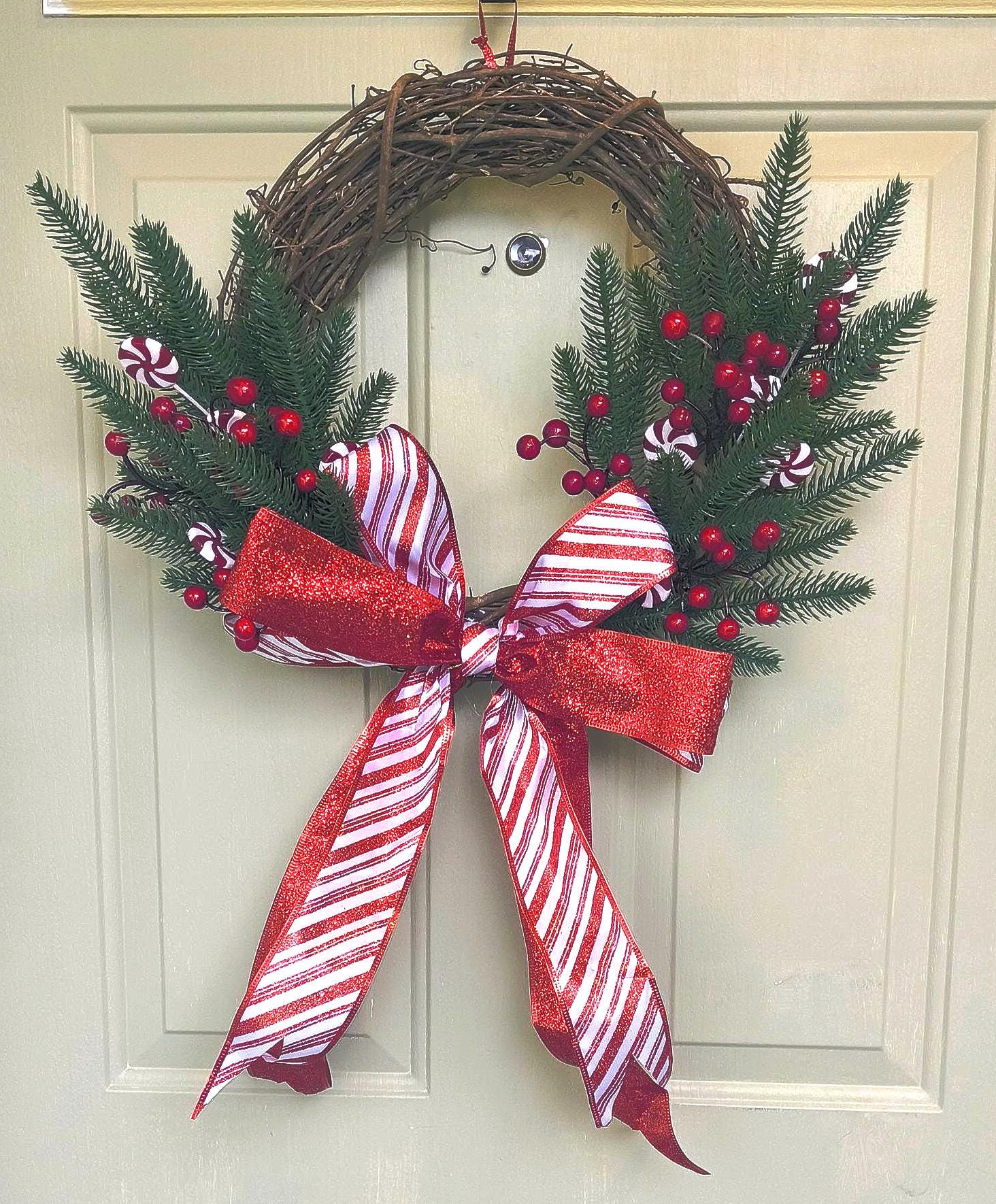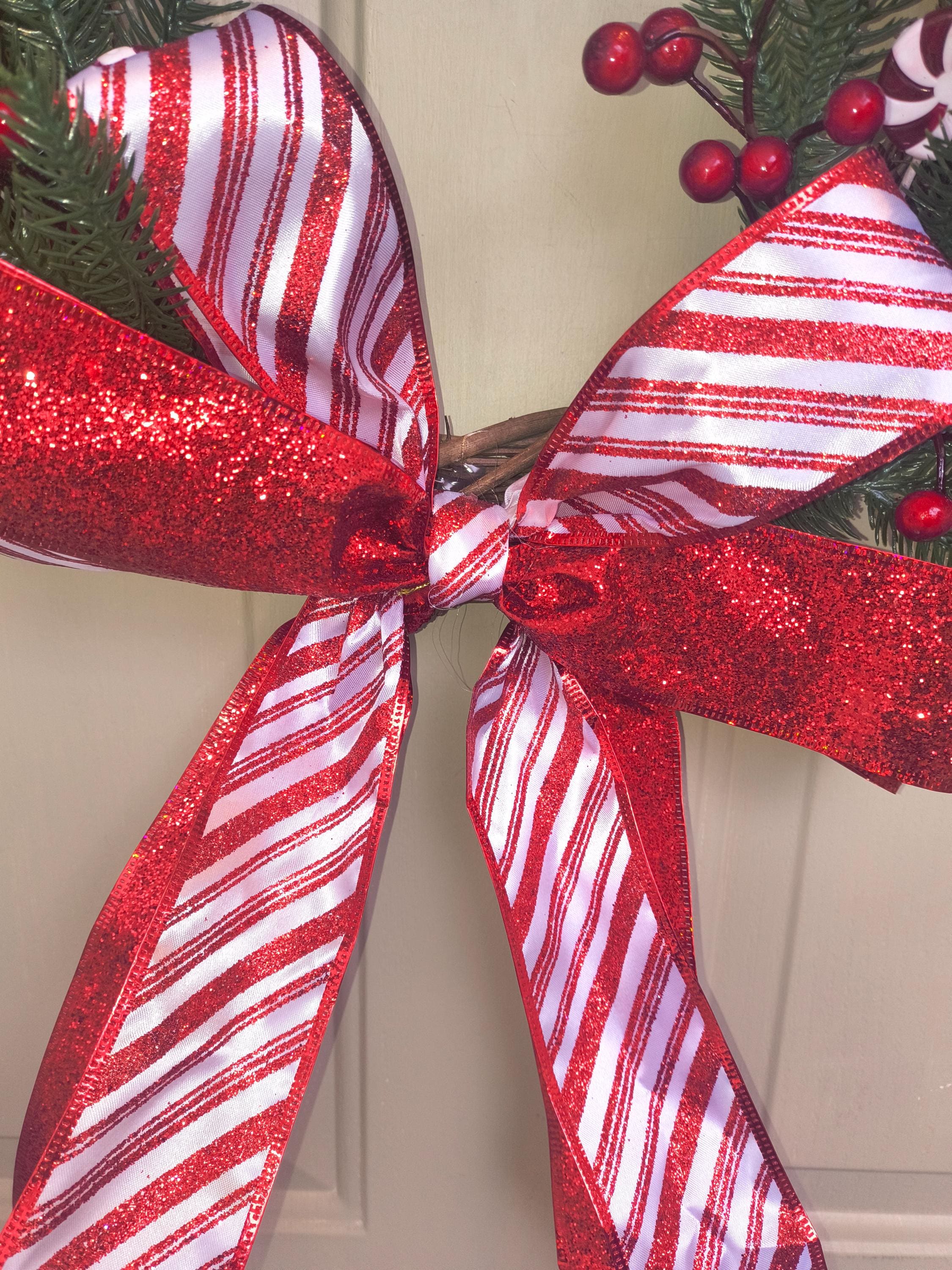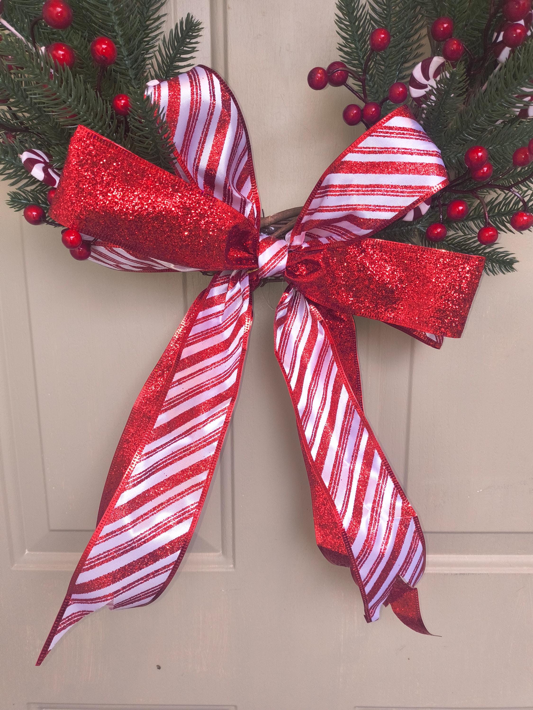 • Faux Pine, Berries, candy cane suckers and candy cane striped bow