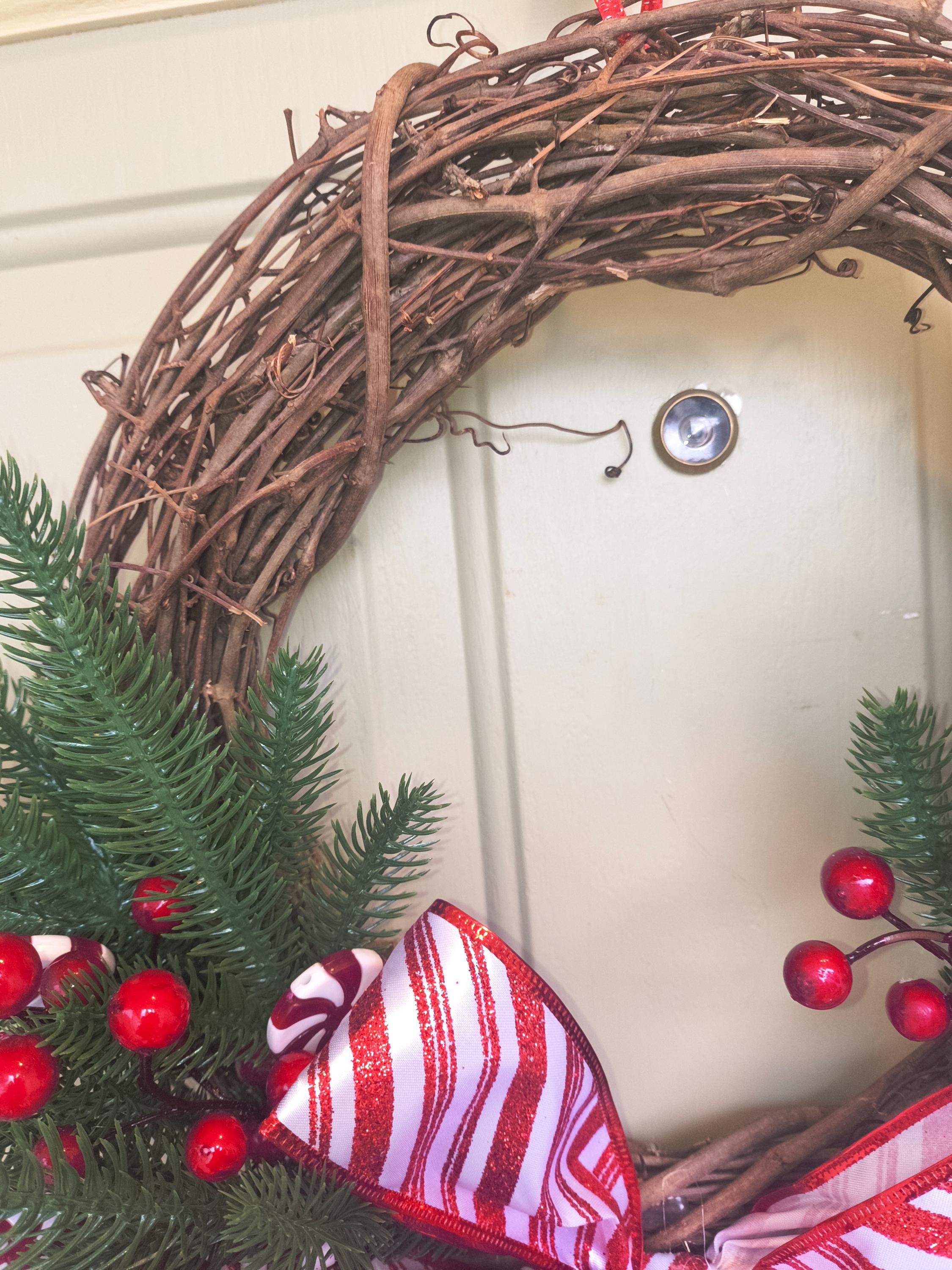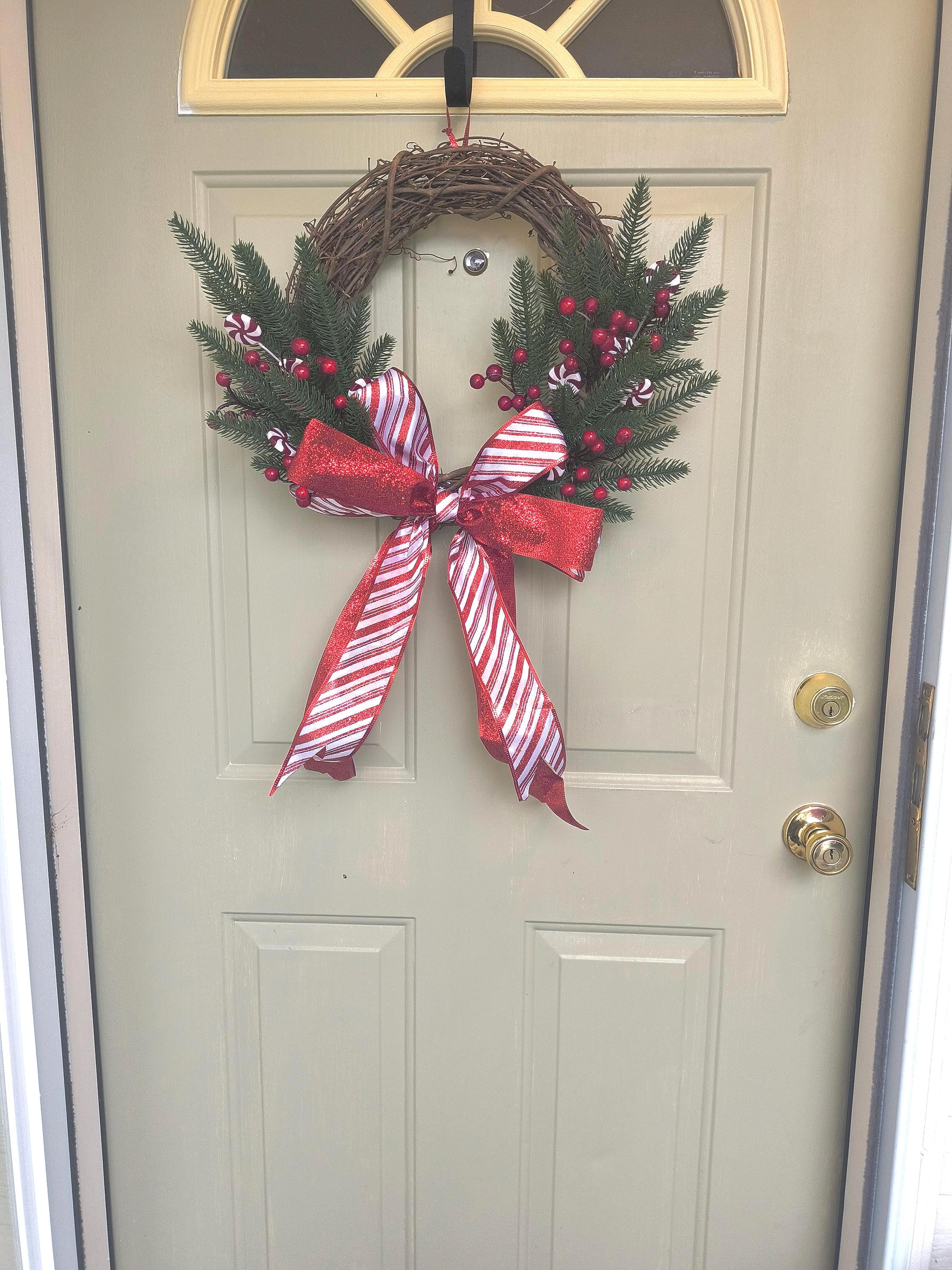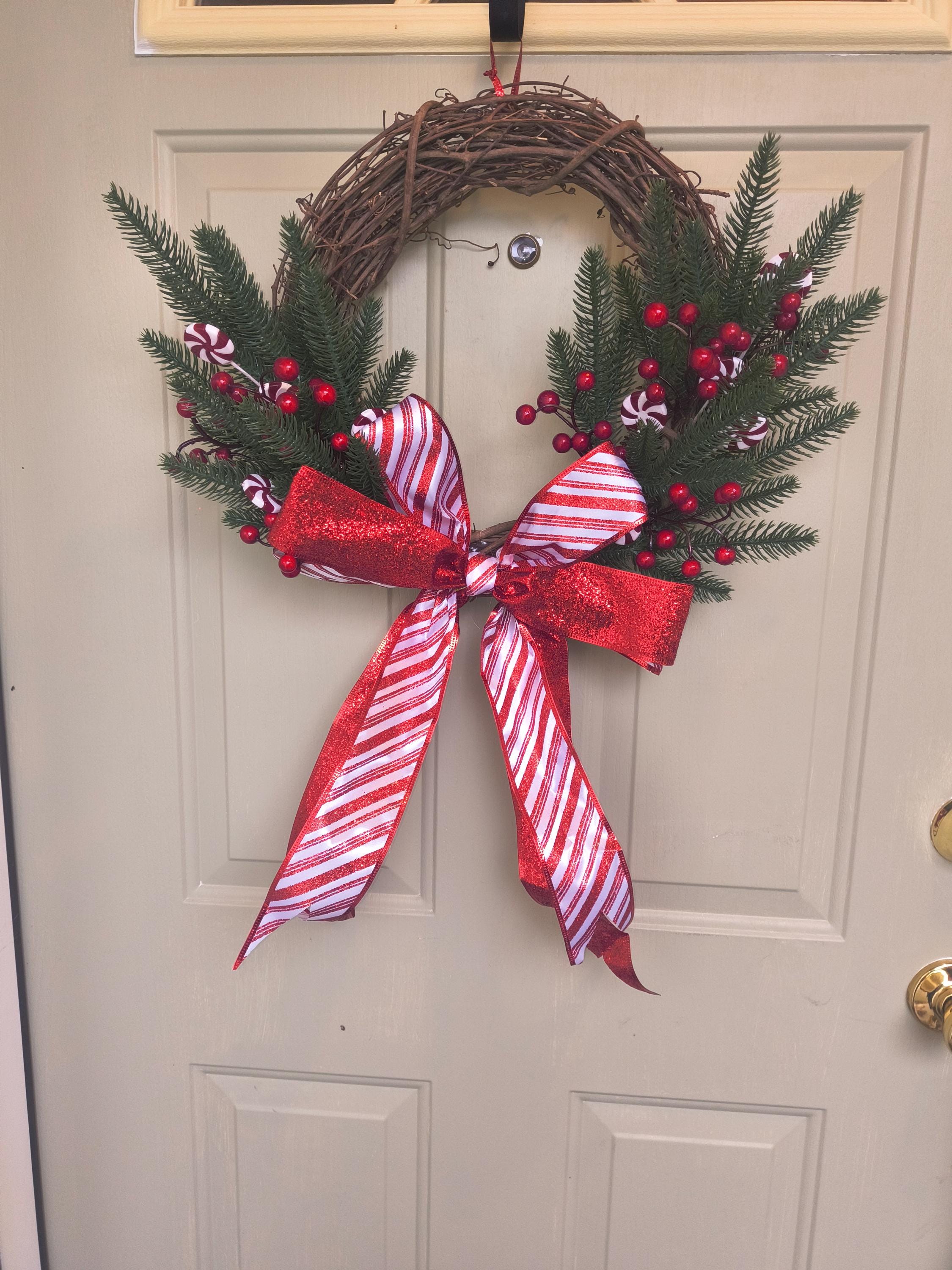 Brighten up you Christmas with this colorful candy cane themed front door wreath. Made with artificial pine, berries, cute little candy cane suckers and a candy cane striped bow on a natural grapevine wreath form, it just screams Christmas nostalgia!